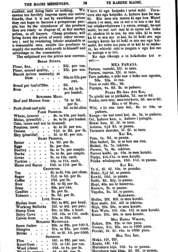 THE MAORI MESSENGER. 16 TE KARERE MAORI. number. and doing little or nothing. We cannot too forcibly impress upon our native friends, that it is not by exorbitant prices they can hope to become a prosperous peo- ple, but by the abundance of the produce they are ready to dispose of, at fair market prices, to all buyers. Cheap produce, will being down the price of every other necess- ary; and by rendering labour attainable at a reasonable rate, enable the producer to supply the markets with profit to himself and advantage to the community. The subjoined are the prices now current. BREAD STUFFS. Flour, fine, ..... 351. per ton. Flour, second quality, . . 331. per ton. Biscuit (prices unsteady) at from ..... 30s.to35s.per cwt. Bread per loaf of 2Ibs. . . 9d. Bran ...... 1s.6d.to2s. per bushel. BUTCHERS MEAT. Beef and Mutton from . . 7d. to 9d. per Ib. Pork (fresh and salt) . . 5d.to6d.ditto FARM PRODUCE. Wheat, (scarce) . . 8s. to 10s. per bush. Maize, (plentiful) . . 4s, to 5s. per bushel. Oats, (none and not in demand) Potatoes, (new) . . 4 1. to 5 1. per ton. Onions . . . . l½d. to 2d. per Ib. Hay (plentiful) . . 51. to 61 per ton. DAIRY PRODUCE, Butter . . . 1s. 9d. per Ib. Eggs . . . 5s. per doz. Poultry . . . 6s. to 7s. per couple. Ducks . . . 7s. to 8s. per couple. Geese . . . 9s. to 10s. each. Turkies . . . 10s. to Us. each. Hams and Bacon . 4 10d. to 11d. per Ib. GROCERIES. Tea .... 6 1. to 61 10s. per chest. Sugar .... 3½d. to 5d. per Ib. Coffee .... 10d. . per Ib. Rice . . . . 2d to 2½ per Ib. Soap .... 40s. per cwt. Candles .... 2s. per Ib. Tobacco. . . . 2s. 3d. per Ib. LIVE STOCK. -Horses from . . 20 1. to 801 per head. Working Bullocks 351 to 451 per pair. Sheep from . . 20s. to 28s. a head. Dairy Cows . . IO1. 10s. to l51. each, Calves from, . 25s. to 40s. each. BUILDING MATERIALS. Sawn timber . . 20s. to 22s. per 100 ft Shingles . . . 21s. to 25s. per 1000 Bricks .... 61. to 61. 10. per 1000 SUNDRIES. Flax .... 161. to 221. per ton. Kauri Gum . . . 121. to 141. per ton. Wool (clean) . . . 10d. to 1s. per Ib. Titiro ki nga kaipuke i tenei wahi. Toru- toru ake nga kaipuke, a, kahore kau he ma- hi, Kia mea atu matou ki nga hoa Maori ehara i te mea, ma te nui o te utu o tae kai hei whakawhairawa i a ratou, erangi, he nui mahi, be nui tari mai ki te taone nei boko ai, ahakoa iti te utu, he utu tika ki te mea ka iti te utu mo te kai, ka iti hoki mo nga taonga katoa ka iti hoki te utu mo nga kai- mahi, ko reira ata puta ai te kai ki te make- te, ka whiwhi tahi te tangata o nga kai me te nuinga o te iwi. Ko nga tikanga o te hokohoko kai e- nei:— MEA PARAOA. Paraoa, tuatahi, 351. te tana. Paraoa, tuarua, 331 te tana. Taro pakeke, e piki ana e heke ana ngautu, 50s. 35s. te rau. Taro te rohi 21b., 9d. Papapa, Is. 6d. 2s. te puhero. POAKA ME ARA ATU KAI, Te piwhi me te pirikahu, 7d. me te 9d. Poaka, mea tote. mea tote kore, 3d. me te 6d. MEA o TE MARA, Witi, e iti ana tana kai, 8s. to 10s. te puhera, Kanga—he uui tenei kai, 4s. 5s. te puhera. Oti, kahore kau, a, kahore i paingia. Riwai hou. 41 51 te tana. Aniana, lid 2d. te pauna. Tarutaru maroke, 51. 6l. te tana. KAI KE, Pata, Is. 9d. te pauna. Hua heihei, 5s. te te kau ma rua. Heihei, 6s. 7s. takirua. Parera, 7s. 8s. takirua. Parera kuihi, 9s. 10s. te mea kotahi. Pipipi, 10s-11s. te mea kotahi. Poaka whakapaoa, 10d. 11d. te pauna. KAI KE, Te ti, 61 61 10s. te pouaka. Huka, 3½d 5d. te pauna. Kawhi. 10d. te pauna. Raihi, 2d. 2d½ te pauna. Hopi, 40s. mo te hanereta. Kanara, 2s. te pauna. Tupeka, 2s. 3d. te pauna. KARAREHE. Hoiho, 201 801. te mea kotahi. Kau mahi, 351. 45 1 te takirua. Hipi, 20s. 28s. te mea kotahi. Kau Waiu. 101 10s. 151. te mea kotahi. Kuao, 25s. 40s. te mea kotahi. MEA HANGA WHARE, Rakau, 20s. 22s. te rau patu. Toetoe, 21s. 23s. mo te 1000 putu. Pereki, 61 61 10s. te 1000 putu. MEA NOA IHO. Muka, 161. 221 Kapia, 121 141 Huruhuru hipi, 10d. 1s. te pauna. Huruhuru mea hinu. 4d. 6d. te pauna,