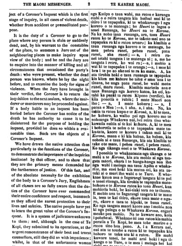 THE MAORI MESSENGER. 2 TE KARERE MAORI. ject of a Coroner's Inquest which is the first stage of inquiry, in ail cases of violent death, whether from accident or premeditated pur- pose. It is the duly of a Coroner to go to the place where any person is slain or suddenly dead, and, by his warrant to the constables of the place, to summon a Jury out of the neighbouring places to make inquiry upon view of the body; and be and the Jury are to enquire into the manner of killing and all circumstances that occasioned the party's death: who were present, whether the dead person was known, where be lay the night before, and to examine the body for signs of violence. When the Jury have brought in their verdict, the Coroner is to return the inquisition to the next assizes, where the mur- derer or murderers may be proceeded against. If a body liable to an inquest has been buried before the Coroner has notice of the death he has authority to cause it to be disinterred for the purpose of holding the inquest, provided he does so within a rea- sonable time. Such are the objects of a Coroner's Inquest. We have drawn the native attention thus particularly to the functions of the Coroner, to demonstrate the importance of the inquiries instituted by that officer, and to show that they are the primary means demanded for the furtherance of justice. Of this fact, and of the absolute necessity for the exhibition of the body to a Coroner's Jury. Englishmen of all classes are so fully aware that the du- ties of the Coroner have ever commanded their entire confidence and respect, inasmuch as they afford the surest protection to their lives and safeties. The native people have yet to learn the great value of the Coroner's In- quest. It is a system of judicature unknown to them; and, although in the case of. Te Kopi, they submitted to its operations, at the urgent remonstrance of their best and truest counsellors, still they did so with impatience; whilst, in that of the unfortunate woman nga Katipa o taua wahi, ma ratou e karanga etahi o o reira tangata kia huihui mai ki te titiro i te tupapaku, ki te whakarongo i nga korero o te matenga; he Huuri te ingoa o tenei Runanga, he Huuri na te Korona, Na ka noho taua runanga, ara, taua Huuri ratou ko te Korona, me te takoto mai ano te tupapaku ra ki o ratou aroaro; ka kimihia e taua runanga nga korero o te matenga, he mea pehea ranei, pehea ranei, patu ranei, aha ranei;— a, i reira ra- nei tetahi tangata i te matenga ai; a, me he tangata i reira, ko wai ra;--a, i mohio a wai ki te tupapaku i te oranga;—a, i moe ki hea i te po ao ake nei te ra ha mate,. A, ka ata tirohia hoki e taua runanga te tupapaku kia kitea me kahore he tohu e mau ana i te tinana, he unga patu ranei, he wahi motu ranei, maru ranei. Kimihia marietia ana e taua Runanga nga korero katoa, ka oti, ka- tahi ka puaki la ratou Kipono (verdict), ka kiia ponotia e ratou; 1 mate Maori noa iho; — a, I mate kohuru; — a, I pama e Mea;—a, i aha, a, i aha. Na, ka tuhia la ratou kupu e te Korona, a, ki te mea, he kohuru, ka waiho pai nga korero mo te nohoanga Whakawa nui, hei reira tino wha- kawatia nuitia ai te kai kohuru. A, ki te mea i hohorotia te nehu o te tupapaku mate tu- ku-tata, kaore te korero i tukua mai ki te Korona, mana e ki kia hahua, ka hahua, kia nohoia ai e taua Runanga, kia ata kimihia te take o te mate, i pehea ranei, i pehea ranei. Ko nga tikanga enei o te Whakawa Korona. I peneitia te whakaatuatu nga tikanga o te mahi a te Korona, kia ata mohio ai nga tan- gata maori, ehara i te hanga-hanga noa iho nga wahi i meinga ma taua Apiha e whaka- rite, ma enei hoki kia matua oti, ka ata tu- tuki ai o muri iho. wahi o te Ture. E wha- kaae katoa ana 6 Ingarangi tangata ki te pai o tenei ritenga, kia tirohia te tupapaku mate hohoro e te Korona ratou ko tona Huuri, kua mohiotia hoki, he kai-tiaki tera no te tinana. E mohio ana to Ingarangi tangata ki te mate ia, tena te kai titiro, ekore tona mate e nga- ro, ekore e taea te e hipoki, te buna ranei. Ko nga tangata maori kaore ano i mohio noa ki nga painga 6 te Whakawa Korona, engari meake pea mohio. Na te kuware ano, koia i pohehe ai. Whakaae Hi ana ratou kia mahia peratia a Te Kopi, he mea tohe marire e o ratou tino hoa pono. A, ia Kerara nei, nui atu te totohe a ratou ki te tupapaku kia hahoro te tuku atu ki a ratou. He mahi kuware tenei, he mahi arai hoki i nga ti- kanga o te Ture, o te mea i meinga hei kai