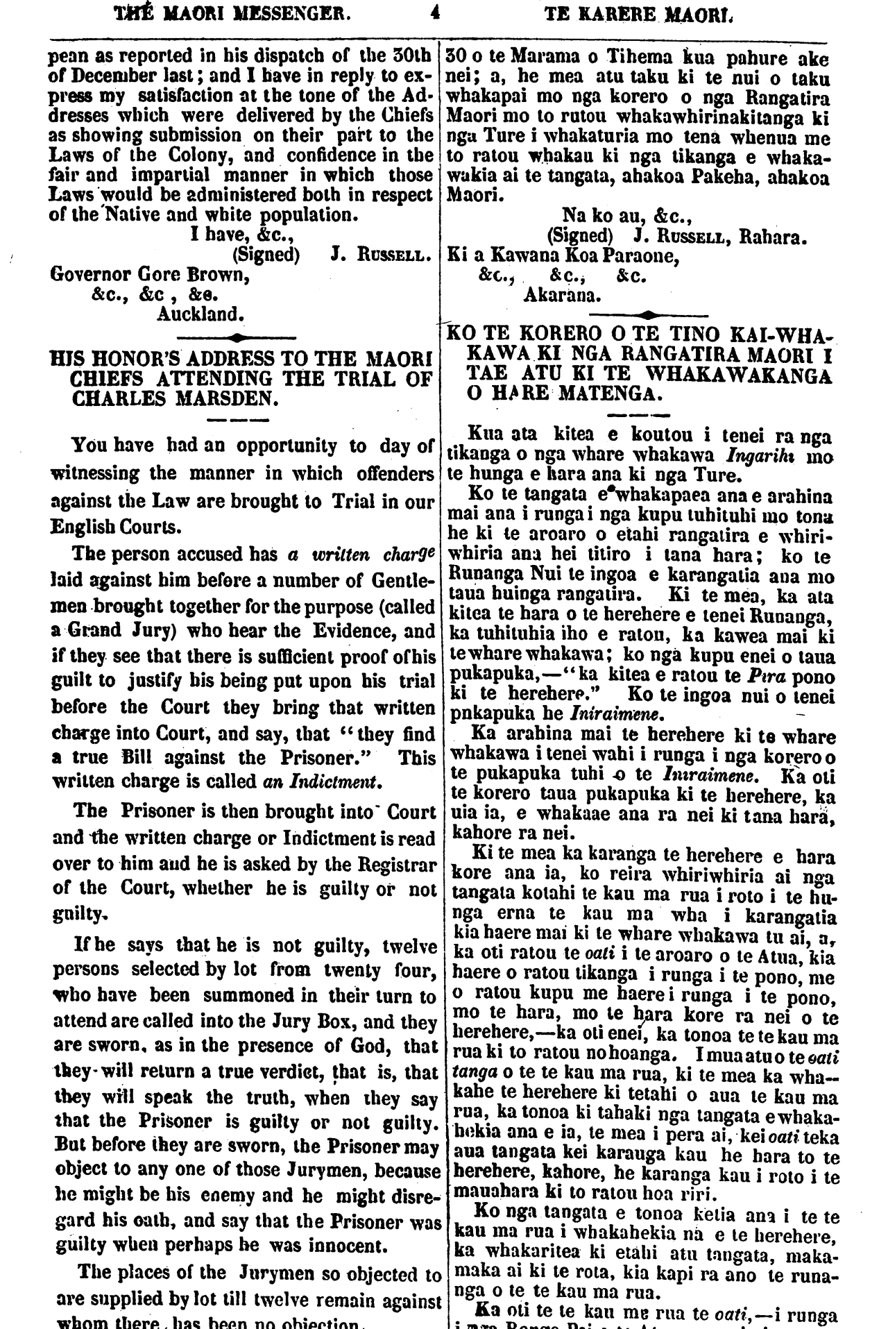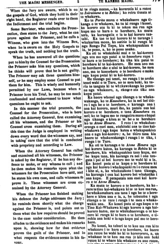 THE MAORI MESSENGER. TE KARERE MAORI pean as reported in his dispatch of the 50th of December last; and I have in reply to ex- press my satisfaction at the tone of the Ad- dresses which were delivered by the Chiefs as showing submission on their part to the Laws of the Colony, and confidence in the fair and impartial manner in which those Laws would be administered both in respect of the Native and white population. I have, &c., (Signed) J. RUSSELL. Governor Gore Brown, &c., &c, &c. Auckland. HIS HONOR'S ADDRESS TO THE MAORI CHIEFS ATTENDING THE TRIAL OF CHARLES MARSDEN. You have had an opportunity to day of witnessing the manner in which offenders against the Law are brought to Trial in our English Courts. The person accused has a written charge laid against him before a number of Gentle- men brought together for the purpose (called a Grand Jury) who hear the Evidence, and if they see that there is sufficient proof of bis guilt to justify bis being put upon his trial before the Court they bring that written charge into Court, and say, that "they find a true Bill against the Prisoner." This written charge is called an Indictment. The Prisoner is then brought into Court and the written charge or Indictment is read over to him and he is asked by the Registrar of the Court, whether be is guilty or not guilty, If he says that he is not guilty, twelve persons selected by lot from twenty four, who have been summoned in their turn to attend are called into the Jury Box, and they are sworn, as in he presence of God, that they-will return a true verdict, that is, that they will speak the truth, when they say that the Prisoner is guilty or not guilty. But before they are sworn, he Prisoner may object to any one of those Jurymen, because he might be bis enemy and he might disre- gard his oath, and say that the Prisoner was guilty when perhaps be was innocent. The places of the Jurymen so objected to are supplied by lot till twelve remain against whom there has been no objection. 50 o te Marama o Tihema kua pahure ake nei; a, he mea atu taku ki te nui o taku whakapai mo nga korero o nga Rangatira Maori mo to ratou whakawhirinakitanga ki nga Ture i whakaturia mo tena whenua me to ratou whakau ki nga tikanga e whaka- wakia ai te tangata, ahakoa Pakeha, ahakoa Maori. Na ko au, &c., (Signed) J. RUSSELL, Rahara. Ei a Kawana Koa Paraone, &c., &c., &c. Akarana. KO TE KORERO O TE TINO KAI-WHA- KAWA KI NGA RANGATIRA MAORI I TAE ATU KI TE WHAKAWAKANGA O HARE MATENGA. Kua ata kitea e koutou i tenei ra nga tikanga o nga whare whakawa Ingarihi mo te hunga e hara ana ki nga Ture. Ko te tangata e whakapaea ana e arahina mai ana i runga i nga kupu tuhituhi mo tona he ki te aroaro o etahi rangatira e whiri- whiria ana hei titiro i Iana hara: ko te Runanga Nui te ingoa e karangatia aua mo taua huinga rangatira. Ki te mea, ka ata kitea te hara o te herehere e tenei Runanga, ka tuhituhia iho e ratou, ka kawea mai ki te whare whakawa; ko nga kupu enei o taua pukapuka,—"ka kitea e ratou te Pira pono ki te herehere." Ko te ingoa nui o tenei pukapuka he Iniraimene, Ka arahina mai te herehere ki te whare whakawa i tenei wahi i runga i nga korero o te pukapuka tuhi o te Iniraimene. Ka oti te korero taua pukapuka ki te herehere, ka uia ia, e whakaae ana ra nei ki tana hara, kahore ra nei. Ki te mea ka karanga te herehere e hara kore ana ia, ko reira whiriwhiria ai nga tangata kotahi te kau ma rua i roto i te hu- nga erua te kau roa wha i karangatia kia haere mai ki te whare whakawa tu ai, a, ka oti ratou te oati i te aroaro o te Atua, kia haere o ratou tikanga i runga i te pono, me o ratou kupu me haere i runga i te pono, mo te hara, mo te hara kore ra nei o te herehere,—ka oti enei, ka tonoa te te kau ma rua ki to ratou no hoanga. I mua atu o te oati tanga o te te kau ma rua, ki te mea ka wha- kahe te herehere ki tetahi o aua te kau ma rua, ka tonoa ki tahaki nga tangata e whaka- hokia ana e ia, te mea i pera ai, kei oati teka aua tangata kei karanga kau he hara to te herehere, kahore, he karanga kau i roto i te mauahara ki to ratou hoa ri ri. Ko nga tangata e tonoa ketia ana i tete kau ma rua i whakahekia na e te herehere, ka whakaritea ki etahi ata tangata, maka- maka ai ki te rota, kia kapi ra ano te runa- nga o te te kau ma rua. Ka oti te te kau me rua te oati,—i runga