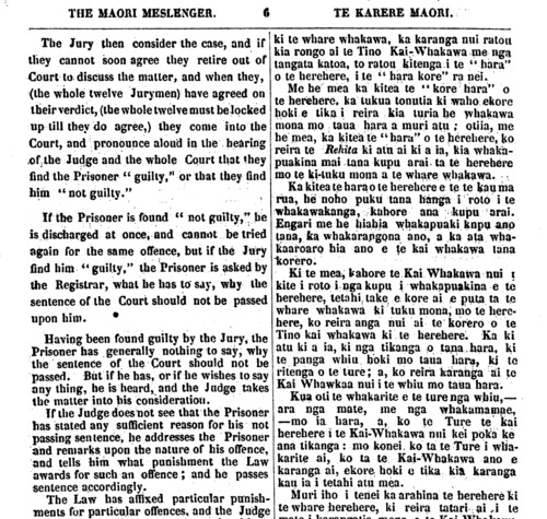 THE MAORI MESSENGER. TE KARERE MAORI. The Jury then consider the case, and if they cannot soon agree they retire out of Court to discuss he matter, and when they, (the whole twelve Jurymen) have agreed on their verdict, (he whole twelve must be locked up till they do agree,) they come into he Court, and pronounce aloud in the hearing of the Judge and the whole Court that they find the Prisoner " guilty," or that they find him "not guilty." If ine Prisoner is found " not guilty," he is discharged at once, and cannot be tried again for the same offence, but if the Jury find him " guilty." the Prisoner is asked by I the Registrar, what he has to say, why the sentence of the Court should not be passed upon him. Having been found guilty by the Jury, the Prisoner has generally nothing to say, why the sentence of the Court should not be passed. But if he has, or if he wishes to say any thing, he is heard, and the Judge takes the matter into his consideration. If the Judge does not see that the Prisoner has slated any sufficient reason for his not passing sentence, he addresses the Prisoner and remarks upon the nature of his offence, and tells him what punishment the Law awards for such an offence; and he passes sentence accordingly. The Law has affixed particular punish- ments for particular offences, and the Judge ki te whare whakawa, ka karanga nui ratou kia rongo ai te Tino Kai-Whakawa me nga tangata katoa, to ratou kitenga i te "hara" o te herehere, i te " hara kore" ra nei. Me he mea ka kitea te " kore hara" o te herehere, ka tukua tonutia ki waho ekore hoki e tikai reira kia turia he whakawa mona mo taua hara a muri atu; otiia, me he mea, ka kitea te "hara" o te herehere, ko reira te Rehita ki atu ai ki a ia, kia whaka- puakina mai tana kupu arai ta te herehere mo te ki-tuku moua a te whare whakawa. Ka kitea te hara o te herehere e te te kau ma rua, he noho puku tana hanga i roto i te whakawakanga, kahore ana kupu arai. Engari me he hiahia whakapuaki kupu ano tana, ka whakarangona ano, a ka ata wha- kaaroaro hia ano e te kai whakawa tana korero. Ki te mea, kahore te Kai Whakawa nui i kite i roto i nga kupu i whakapuakina e te herehere, tetahi take e kore ai e puta ta te whare whakawa ki tuku mona, mo te here- here, ko reira anga nui ai te korero o te Tino kai whakawa ki te herehere. Ka ki atu ki a ia, ki nga tikanga o tana, hara, ki te panga whiu hoki mo taua hard, ki to ri tenga o te ture; a, ko reira karanga ai te Kai Whakawa nui i te whiu mo taua hara. Kua oti te whakarite e te ture ngu whiu,— ara nga mate, me nga whakamamae, —mo ia hara, a, ko te Ture te kai herehere i te Kai-Whakawa nui kei poka ke ana tikanga: mo konei ko ta te Ture i wha- karite ai, ko ta te Kai-Whakawa ano e karanga ai, ekore; hoki e tika kia karanga kau ia i tetahi atu mea. Muri iho i tenei ka arahina te herehere ki te whare herehere, ki reira tatari ai i te
