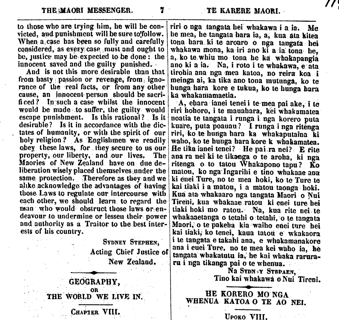 TE KARERE MAORI to those who are trying him, be will be con- victed, and punishment will be sure to follow. When a; case has been so fully and carefully considered, as every case must and ought to be, justice may be expected to be done: the innocent saved and the guilty punished. And is not this more desirable than that from hasty passion or revenge, from igno- rance of the real facts, or from any other cause, an innocent person should be sacri- ficed? In such a case whilst the innocent would be made to suffer, the guilty would escape punishment. Is this rational? Is it desirable? Is it in accordance with the dic- tates of humanity, or with the spirit of our holy religion? As Englishmen we readily obey these laws, Tor they secure to us our property, our liberty, and our lives. The Maories of New Zealand have on due de- liberation wisely placed themselves under the same: protection. Therefore as they and we alike acknowledge the advantages of having those Laws to regulate our intercourse with each other, we should learn to regard the man who would obstruct, those laws or en- deavour to undermine or lessen their power and authority as a Traitor to the best inter- ests of his country. SYDNEY STEPHEN, Acting Chief Justice of New Zealand. GEOGRAPHY, OR THE WORLD WE LIVE IN. CHAPTER VIII riri o nga tangata hei whakawa i a ia. Me he mea, he tangata hara ia, a, kua ata kitea tona hara ki te aroaro o nga tangata hei whakawa mona, ka i ri ano ki a ia tona he, a, ko te whiu mo tona be kai whakapangia ano ki a ia. Na, i roto i te whakawa, e ata tirohia ana nga mea katoa, no reira koa i meinga ai, ka tika ano tona mutunga, ko te hunga hara kore e tukua, ko te hunga hara ka whakamamaetia. A, ehara ianei tenei i te mea pai ake, i te riri hohoro, i te mauahara, kei whakamatea noatia te tangata i runga i nga korero puta kuare, puta poauau? 1 runga i nga ritenga riri, ko te hunga hara ka whakaputaina ki waho, kote hunga hara kore e whakamatea. He tika ianei tenei? He pai ra nei? E rite ana ra nei ki te tikanga o te aroha, ki nga ritenga o to tatou Whakapono tapu? Ko matou, ko nga Ingarihi e tino whakaae ana ki enei Ture, no te mea hoki, ko te Ture te kai tiaki i a matou, i a matou taonga hoki. Kua ata whakaaro nga tangata Maori o Nui Tireni, kua whakaae ratou ki enei ture hei tiaki hoki mo ratou. Na, kua rite nei te whakaaetanga o tetahi o tetahi, o te tangata Maori, o te pakeha kia waiho enei ture hei kai tiaki, ko tenei, kaua tatou e wkakaora i te tangata; e takahi ana, e vvhakamanakore ana i enei Ture. no te mea kei waho ia, he tangata whakatutu ia, he kai whaka rarura- ru i nga tikanga pai o te whenua. Na SYDNEY STRPAEN, Tino kai whakawa o Nui Tireni. HE KORERO MO NGA WHENUA KATOA O TE AO NEI. UPOKO VIII.