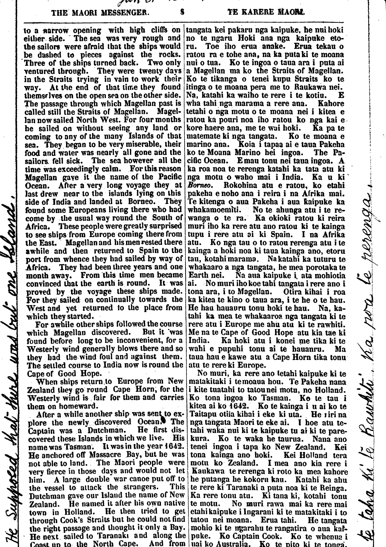 THE MAORI MESSENGER. 8 TE KARERE MAORI. to a narrow opening with high cliffs on either side. The sea was very rough and the sailors were afraid that the ships would be dashed to pieces against the rocks. Three of the ships turned back. Two only ventured through. They were twenty days in the Straits trying in vain to work their way. At the end of that time they found themselves on the open sea on the other side. The passage through which Magellan past is I called still the Straits of Magellan. Magel- lan now sailed North West. For four months he sailed on without seeing any land or coming to any of the many Islands of that sea. They began to be very miserable, their food and water was nearly all gone and the sailors fell sick. The sea however all the time was exceedingly calm. For this reason Magellan gave it the name of the Pacific Ocean. After a very long voyage they at last drew near to the islands lying on this side of India and landed at Borneo. They found some Europeans living there who had come by the usual way round the South of Africa. These people were greatly surprised to see ships from Europe coming there from the East. Magellan and his men rested there awhile and then returned to Spain to the I port from whence they had sailed by way of E Africa. They had been three years and one month away. From this time men became convinced that the earth is round. It was proved by the voyage these ships made. For they sailed on continually towards the West and yet returned to the place from which they started. For awhile other ships followed the course which Magellan discovered. But it was found before long to be inconvenient, for a Westerly wind generally blows there and so they bad the wind foul and against them. The settled course to India now is round the Cape of Good Hope. When ships return to Europe from New Zealand they go round Cape Horn, for the Westerly wind is fair for them and carries them on homeward. After a while another ship was sent to ex- plore the newly discovered Oceans The Captain was a Dutchman. He first dis- covered these Islands in which we live. His name was Tasman. It was in the year 1642. He anchored off Massacre Bay, but he was not able to land. The Maori people were very fierce in those days and would not let him. A large double" war canoe put off to the vessel to attack the strangers. This Dutchman gave our Island the name of New Zealand. He named it after his own native town in Holland. He then tried to get through Cook's Straits but he could not find the right passage and thought it only a Bay. He next sailed to Taranaki and along the Coast up to the North Cape. And from tangata kei pakaru nga kaipuke, he nui hoki no te ngaru Hoki ana nga kaipuke eto- ru. Toe iho erua anake. Erua tekau o ratou ra e tohe ana, na ka puta ki te moana nui o tua. Ko te ingoa o taua ara i puta ai a Magellan ma ko the Straits of Magellan. Ko te tikanga o tenei kupu Straits ko te itinga o te moana pera me to Raukawa nei. Na, katahi ka waiho te rere i te kotiu. E wha tahi nga marama a rere ana. Kahore tetahi o nga motu o te moana nei i kitea e ratou ka pouri noa iho ratou ko nga kai e kore haere ana, me te wai hoki. Ka pa te matemate ki nga tangata. Ko te moana e marino ana. Koia i tapaa ai e taua Pakeha ko te Moana Marino hei ingoa. The Pa- cific Ocean. E mau tonu nei taua ingoa. A ka roa noa te rerenga katahi ka tata atu ki nga motu o waho mai i India. Ka u ki Borneo. Rokohina atu e ratou, ko etahi pakeha e noho ana i reira i na Afrika mai. Te kitenga o aua Pakeha i aua kaipuke ka whakamoemiti. No te ahunga atu i te re- wanga o te ra. Ka okioki ra tou ki reira muri iho ka rere atu ano ratou ki te kainga tupu i rere atu ai ki Spain. I na Afrika atu. Ko nga tau o to ratou rerenga atu i te kainga a hoki noa ki taua kainga ano, etoru tau, kotahi marama. Na katahi ka tuturu te whakaaro a nga tangata, he mea porotaka te Earth nei. Na aua kaipuke i ata mohiotia ai. No muri iho koe tahi tangata i rere ano i tona ara, i to Magellan. Otira kihai i roa ka kitea te kino o taua ara, i te he o te hau. He hau hauauru tonu hoki te hau. Na, ka- tahi ka mea te whakaaroa, nga tangata ki te rere atu i Europe me ahu ata ki te rawhiti. Me na te Cape of Good Hope atu kia tae ki India. Ka hoki atu i konei me tika ki te wahi e pupuhi tonu ai te hauauru. Ma taua hau e kawe atu a Cape Horn tika tonu atu te rere ki Europe. No muri, ka rere ano tetahi kaipuke ki te matakitaki i te moana hou. Te Pakeha nana i kite tuatahi to tatou nei motu, no Holland. Ko tona ingoa ko Tasman. Ko te tau i kitea ai ko 1642. Ko te kainga i u ai ko te Taitapu otiia kihai i eke ki uta. He riri na nga tangata Maori te eke ai. I hoe atu te- tahi waka nui ki te kaipuke tu ai ki te pare- kura. Ko te waka he taurua. Nana ano tenei ingoa i tapa ko New Zealand. Kei tona kainga ano hoki. Kei Holland tera motu ko Zealand. I mea ano kia rere i Kaukawa te rerenga ki roto ka mea kahore he putanga he kokoru kau. Katahi ka ahu te rere ki Taranaki a puta noa ki te Reinga. Ka rere tonu atu. Ki tana ki, kotahi tonu te motu. No muri rawa mai ka rere mai etahi kaipuke i Ingarani ki te matakitaki i to tatou nei moana. Erua tahi. He tangata mohio ki te ngarahu te rangatira o aua kai- puke. Ko Captain Cook. Ko te whenua i mai ko Australia. Ko te pito ki te tonga.