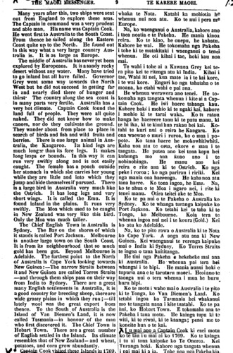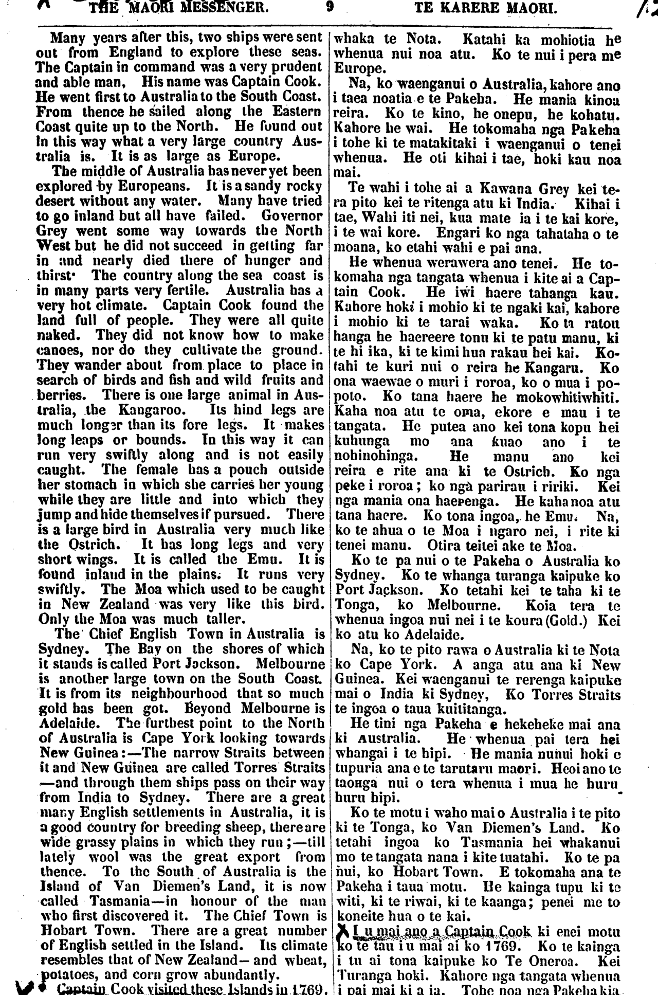 THE MAORI MESSENGER. 9 TE KARERE MAORI. Many years after this, two ships were sent out from England to explore these seas. The Captain in command was a very prudent and able man, His name was Captain Cook. He went first to Australia to the South Coast. From thence be sailed along the Eastern Coast quite up to the North. He found out in this way what a very large country Aus- tralia is. It is as large as Europe. The middle of Australia has never yet been explored by Europeans. It is a sandy rocky desert without any water. Many have tried to go inland but all have failed. Governor Grey went some way towards the North West but he did not succeed in getting far in and nearly died there of hunger and thirst The country along the sea coast is in many parts very fertile. Australia has a very hot climate. Captain Cook found the land full of people. They were all quite naked. They did not know how to make canoes, nor do they cultivate the ground. They wander about from place to place in search of birds and fish and wild fruits and berries. There is one large animal in Aus- tralia, the Kangaroo. Its hind legs are much longer than its fore legs. It makes long leaps or bounds . In this way it can run very swiftly along and is not easily caught. The female has a pouch outside her stomach in which she carries her young while they are little and into which they jump and hide themselves if pursued. There is a large bird in Australia very much like the Ostrich. It has long legs and very short wings. It is called the Emu. It is found inland in the plains. It runs very swiftly. The Moa which used to be caught in New Zealand was very like this bird. Only the Moa was much taller. The Chief English Town in Australia is Sydney. The Bay on the shores of which it stands is called Port Jackson. Melbourne is another large town on the South Coast. It is from its neighbourhood that so much gold has been got. Beyond Melbourne is Adelaide. The furthest point to the North of Australia is Cape York looking towards New Guinea:—The narrow Straits between it and New Guinea are called Torres Straits —and through them ships pass on their way from India to Sydney. There are a great many English settlements in Australia, it is a good country for breeding sheep, there are wide grassy plains in which they run;—till lately wool was the great export from thence. To the South of Australia is the Island of Van Diemen's Land, it is now called Tasmania—in honour of the man who first discovered it. The Chief Town is Hobart Town. There are a great number of English settled in the Island. Its climate resembles that of New Zealand— and wheat, potatoes, and corn grow abundantly. Captain Cook visited these Islands in 1769. whaka te Nota. Katahi ka mohiotia he whenua nui noa atu. Ko te nui i pera me Europe. Na, ko waenganui o Australia, kahore ano i taea noatia e te Pakeha. He mania kinoa reira. Ko te kino, he onepu, he kohatu. Kahore he wai. He tokomaha nga Pakeha i tohe ki te matakitaki i waenganui o tenei whenua. He oti kihai i tae, hoki kau noa mai. Te wahi i tohe ai a Kawana Grey kei te- ra pito kei te ritenga atu ki India. Kihai i tae, Wahi iti nei, kua mate ia i te kai kore, i te wai kore. Engari ko nga tahataha o te moana, ko etahi wahi e pai ana. He whenua werawera ano tenei- He to- komaha nga tangata whenua i kite ai a Cap- tain Cook. He iwi haere tahanga kau. Kahore hoki i mohio ki te ngaki kai, kahore i mohio ki te tarai waka. Ko to ratou hanga he haereere tonu ki te patu manu, ki te hi ika, ki te kimi hua rakau hei kai. Ko- tahi te kuri nui o reira he Kangaru. Ko ona waewae o muri i roroa, ko o mua i po- poto. Ko tana haere he mokowhitiwhiti. Kaha noa atu te oma, ekore e mau i te tangata. He putea ano kei tona kopu hei kuhunga mo ana kuao ano i te nohinohinga. He manu ano kei reira e rite ana ki te Ostrich. Ko nga peke i roroa; ko nga parirau i ririki. Kei nga mania ona haerenga. He kaha noa atu tana haere. Ko tona ingoa, he Emu. Na, ko te ahua o te Moa i ngaro nei, i rite ki tenei manu. Otira teitei ake te Moa. Ko te pa nui o te Pakeha o Australia ko Sydney. Ko te whanga turanga kaipuke ko Port Jackson. Ko tetahi kei te taha ki te Tonga, ko Melbourne. Koia tera te whenua ingoa nui nei i te koura (Gold.) Kei ko atu ko Adelaide. Na, ko te pito rawa o Australia ki te Nota ko Cape York. A anga atu ana ki New Guinea. Kei waenganui te rerenga kaipuke mai o India ki Sydney, Ko Torres Straits te ingoa o taua kuititanga. He tini nga Pakeha e hekeheke mai ana ki Australia. He whenua pai tera hei whangai i te hipi. He mania nunui hoki e tupuna ana e te tarutaru maori. Heoi ano te taonga nui o tera whenua i mua he hum huru hipi. Ko te motu i waho maio Australia i te pito ki te Tonga, ko Van Diemen"s Land. Ko tetahi ingoa ko Tasmania hei whakanui mo te tangata nana i kite tuatahi. Ko te pa hui, ko Hobart Town. E tokomaha ana to Pakeha i taua motu. Ue kainga tupu ki te witi, ki te riwai, ki te kaanga; penei me to konehe hua o te kai. I u mai ano a Captain Cook ki enei motu ko te tau i u mai ai ko 1769. Ko te kainga i tu ai tona kaipuke ko Te Oneroa. Kei Turanga hoki. Kahore nga tangata whenua i pai mai ki a ia. Tohe noa nga Pakeha kia