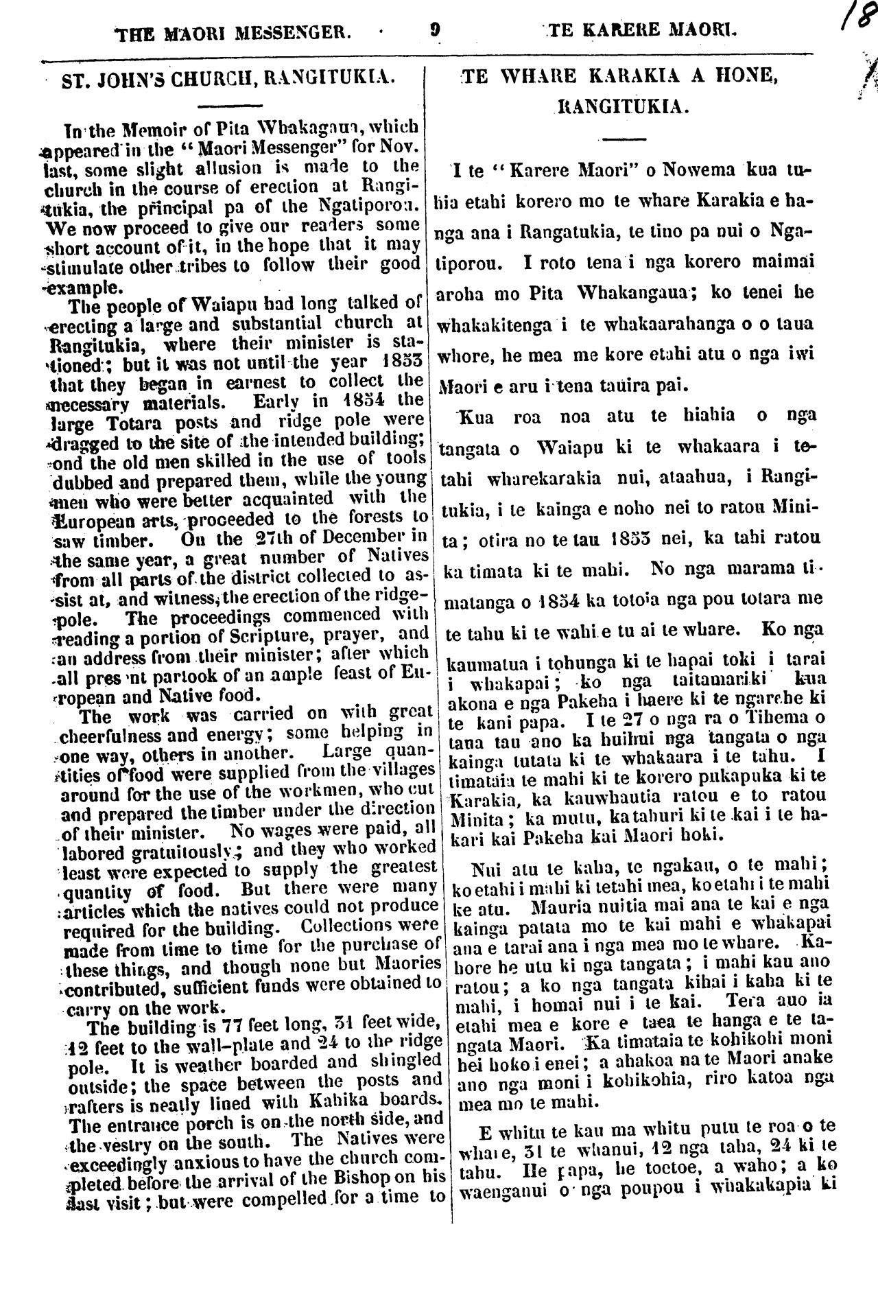 THE MAORI MESSENGER. TE KAREKE MAORI, ST. JOHN'S CHURCH, RANGITUKlA. In the Memoir of Pita Whakangaua, which appeared in the " Maori Messenger" for Nov. last, some slight allusion is made to the church in the course of erection at Rangi- tukia, the principal pa of the Ngatiporou . We now proceed to give our readers some short account of it, in the hope that it may stimulate other tribes to follow their good example. The people of Waiapu had long talked of erecting a large and substantial church at Rangitukia, where their minister is sta- tioned; but it was not until the year 1853 that they began in earnest to collect the necessary materials. Early in 1854 the large Totara posts and ridge pole were dragged to the site of the intended building; and the old men skilled in the use of tools dubbed and prepared them, while the young men who were better acquainted with the European arts, prooeeded to the forests to saw timber. On the 27th of December in the same year, a great number of Natives from all parts of the district collected to as- sist at, and witness, the erection of the ridge- pole. The proceedings commenced with reading a portion of Scripture, prayer, and an address from their minister; after which all present partook of an ample feast of Eu- ropean and Native food. The work was carried on with great cheerfulness and energy; some helping in one way, others in another. Large quan- tities of food were supplied from the villages around for the use of the workmen, who cut and prepared the timber under the direction of their minister. No wages were paid, all labored gratuitously; and they who worked least were expected to supply the greatest quantity of food. But there were many articles which the natives could not produce required for the building. Collections were made from time to time for the purchase of these things, and though none but Maories contributed, sufficient funds were obtained to carry on the work. The building is 77 feet long, 31 feet wide, 12 feet to the wall-plate and 24 to the ridge pole. It is weather boarded and shingled outside; the space between the posts and rafters is neatly lined with Kahika boards, The entrance porch is on the north side, and the vestry on the south. The Natives were exceedingly anxious to have the church com- pleted before the arrival of the Bishop on his last visit; but were compelled for a time to TE WHARE KARAKIA A HONE, RANGITUKIA. I te "Karere Maori" o Nowema kua tu- hia etahi korero mo te whare Karakia e ha- nga ana i Rangatukia, te tino pa nui o Nga- tiporou. I roto tena i nga korero maimai aroha mo Pita Whakangaua; ko tenei he whakakitenga i te whakaarahanga o o taua whore, he mea me kore etahi atu o nga iwi Maori e aru i tena tauira pai. Kua roa noa atu te hiahia o nga tangata o Waiapu ki te whakaara i te- tahi wharekarakia nui, ataahua, i Rangi- tukia, i te kainga e noho nei to ratou Mini- ta; otira no te tau 1855 nei, ka tahi ratou ka timata ki te mahi. No nga marama ti- matanga o 1854 ka totoka nga pou totara me te tahu ki te wahi e tu ai te whare. Ko nga kaumatua i tohunga ki te hapai toki i tarai i whakapai; ko nga taitamariki kua akona e nga Pakeha i haere ki te ngarehe ki te kani papa. I te 27 o nga ra o Tihema o taua tau ano ka huihui nga tangata o nga kainga tutata ki te whakaara i te tahu. I timataia te mahi ki te korero pukapuka ki te Karakia, ka kauwhautia ratou e to ratou Minita; ka mutu, ka tahuri ki te kai i te ha- kari kai Pakeha kai Maori hoki. Nui atu te kaha, te ngakau, o te mahi; ko etahi i mahi ki tetahi mea, ko etahi i te mahi ke atu. Mauria nuitia mai ana te kai e nga kainga patata mo te kai mahi e whakapai ana e tarai ana i nga mea mo te vvhare. Ka- hore he utu ki nga tangata; i mahi kau ano ratou; a ko nga tangata kihai i kaha ki te mahi, i homai nui i te kai. Tera ano ia etahi mea e kore e taea te hanga e te ta- ngata Maori. Ka timataia te kohikohi moni hei hoko i enei; a ahakoa na te Maori anake ano nga moni i kohikohia, riro katoa ngu mea mo te mahi. E whitu te kau ma whitu putu te roa o te whare, 51 te whanui, 12 nga taha, 24 ki te tahu. He papa, he toetoe, a waho; a ko waenganui o nga poupou i whakakapia ki