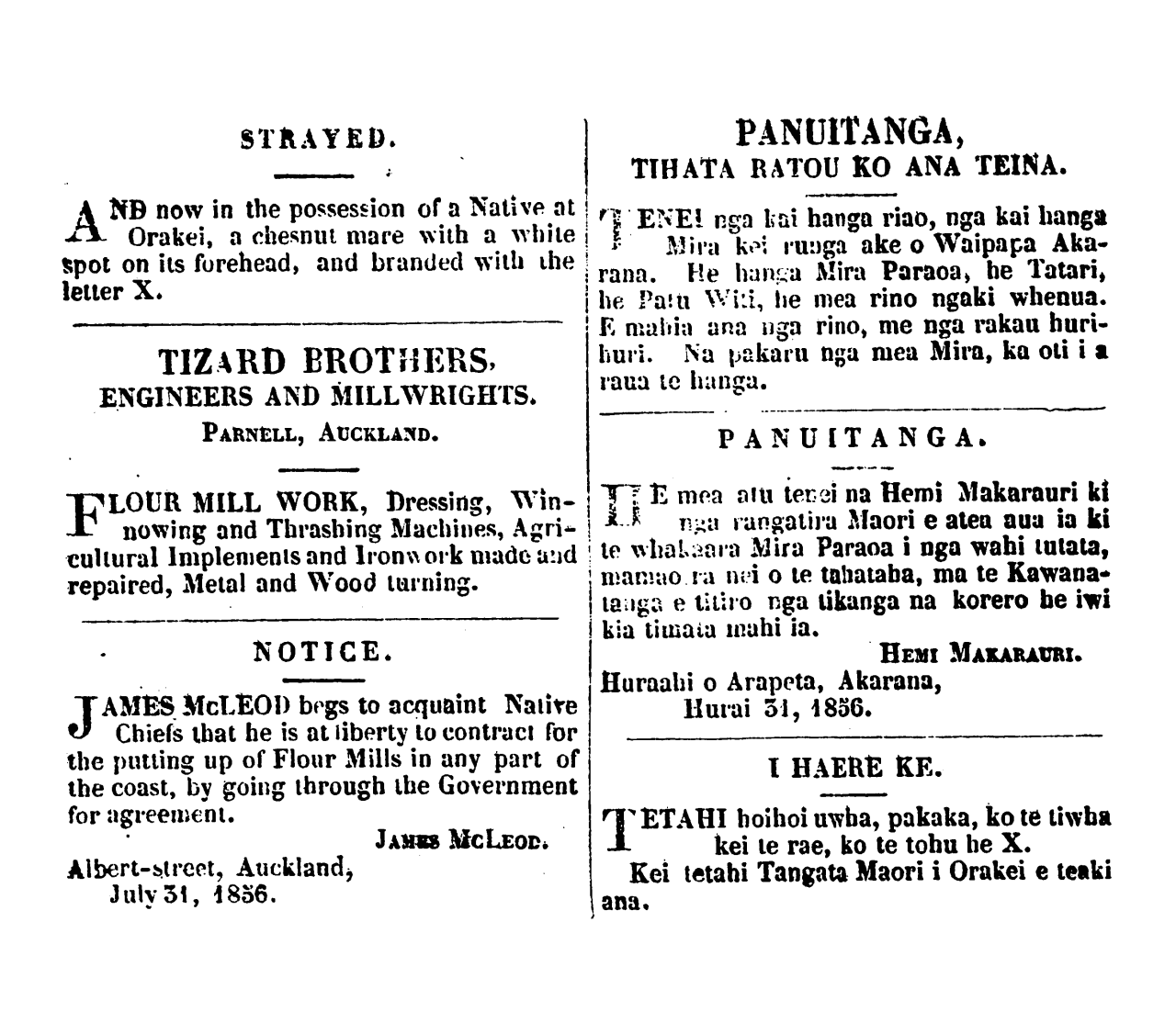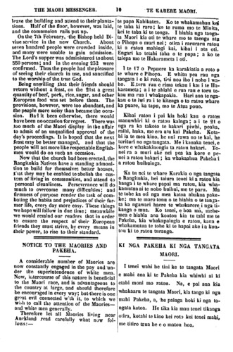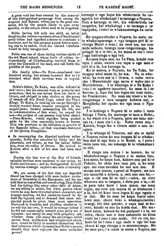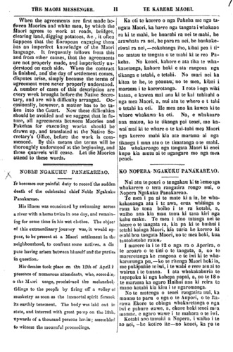 THE MAORI MESSENGER. 11 TE KARERE MAORI. When the agreements are first made be- tween Maories and white men, by which the Maori agrees to work at roads, bridges, clearing land, digging potatoes, &c, it often happens that the European engaging them has an imperfect knowledge of the Maori language. It frequently follows from this and from other causes, that the agreements are not properly made, and imperfectly un- derstood on each side. When the compact is finished, and the day of settlement comes, disputes arise, simply because the terms of agreement were never properly understood. A number of cases of this description are every week brought before the Native Secre- tary, and are with difficulty arranged. Oc-- casionally, however, a matter has to be ta- ken into the Court. Now these diffficulties should be avoided and we suggest that in fu- ture, all agreements between Maories and Pakehas for executing works should be drawn up, and translated at the Native Se- cretary's Office, before the work is com- menced. By this means the terms will be thoroughly undcrstood at the beginning, and those quarrels will cease. Let the Maories attend to these words . NOBLE NGAKUKU PANAKAREAO. It becomes our painful duty to record the sudden death of the celebrated chief Noble Ngakuku Panakareao. His illness was occasioned by swimming across a river with a horse twice in one day, and remain- ing for some time in his wet clothes. The object of this extraordinary journey was, it would ap- pear, to he present at a Maori settlement in the neighhourhood, to confront some natives, a dis pute having arisen: between himself and the parties in question. His demise took place on the 12th of April presence of numerous attendants, who, according to the Maori usage, proclaimed the melancholy tidings to the people by firing off a volley of musketry as soon as the immortal spirit forsook its earthly tenement. The body was laid out in state, and interred with great pomp on the 18th. upwards of a thousand persons having assembled to witness the mournful proccedings. Ka oti te korero o nga Pakeha me nga ta- ngata Maori, ka haere nga tangata i whakaae ra ki te mahi, he huarahi ra nei te mahi, he arawhata ra nei, he para ra nei, he haukake- riwai ra nei,—rokohanga iho, kihai pea i ti- no matau te tangata o te mahi ki te reo Pa- keha. No konei, kahore e ata tika te wha- kaaetanga, kahore hoki e ata rangona nga tikanga e tetahi, e tetahi. No muri nei ka kitea te he, te poauau, no te mea, kihai i marama i te korerotanga. I roto i nga wiki katoa, e kawea mai ana ki te kai tuhituhi o nga mea Maori, a, nui atu te whero o I tahi o tetahi ka oti. He mea ano ka kawea ki te whare whakawa ka oti. Na, e whakaaro ana matou, ko te tikanga pai tenei, me ka- wai mai ki te whare o te kai-tuhi mea Maori nga korero mahi kia ata marama ai nga tikanga i mua atu o te timatanga o te mahi. Me whakarongo nga tangata Maori ki enei kupu kia mutu ai te ngangare mo nga mea penei. KO NOPERA NGAKUKU PANAKAREAO. Nui atu te pouri o te ngakau ki te hemonga whakarere o tera rangatira rongo nui, o Nopera Ngakuku Panakareao. Te mea i pa ai te mate ki a ia, he wha- kakauanga atu i te awa, erua whitinga o raua ko tona hoiho i te ra kotahi, a, waiho ana kia mau tonu ki tana kin nga kahu maku. Te mea i tino tatanga nei te haere o te tangata ra, kia pa ki te huihui i tetahi kainga Maori, kia turia he korero ki etahi hoa tangata Maori, no te mea hoki, kua tautohetohe ratou. I marere ia i te 12 o nga ra o Aperira, e te aroaro o te tini o te tangata, a, no te mareretanga ke rongona e te iwi ki te wha- karurunga pu,—ko te ritenga Maori hoki ia, me puhipuhie te iwi, i te wahi e rere atu ai te wairua i te tinana. I ata whakakahuria te tupapaku ki nga kohepa papai, a, no te 18 o te marama ka ngaro Huihui ana ki reira te mano kotahi kia kitu i te ngaromanga. No te matenga o tenei rangatira nui, ka maunu te paru o nga o te Aupori, o te Ra- rawa Ekore te ohinga whakaretanga o nga iwi e pahure wawe, a, ekore hoki tenei mea mamao, e ngaro wawe i te mahara o te iwi. Kotahi ano tamaiti a Nopera, i waiho i te ao nei, -he kotiro ite—no konei, ka pa te