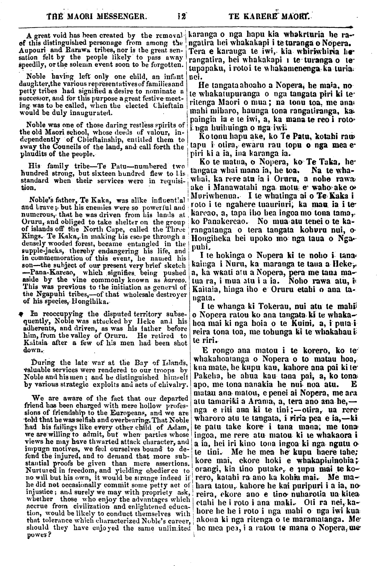 THE MAORI MESSENGER. TE KARERE MAORI. A great void has been created by the removal of this distinguished personage from among the Aupouri and Rarawa tribes, nor is the great sen- sation felt by the people likely to pass away speedily, or the solemn event soon to he forgotten. Noble having left only one child, an infant daughter, the various representatives of families and petty tribes had signified a desire to nominate a successor, and for this purpose a great festive meet- ing was to be called, when the elected Chieftain would be duly inaugurated. Noble was one of those daring restless spirits of the old Maori school, whose deeds of valour, in- dependently of Chieftainship, entitled them to sway the Councils of the land, and call forth the plaudits of the people. His family tribe—Te Patu—numbered two hundred strong, but sixteen hundred flew to his standard when their services were in requisi- tion. Noble's father. Te Kaka, was alike influential and brave but his enemies were so powerful and numerous, that he was driven from his land at Oruru, and obliged to take shelter on the group of islands off the North Cape, called the Three Kings. Te Kaka, in making his escape through a densely wooded forest, became entangled in the supple-jacks, thereby endangering his life, and in commemoration of this event, he named his son—the subject of our present very brief sketch —Pana-Kareao, which signifies, being pushed aside by the vine commonly known as kareao, This was previous to the initiation as general of the Ngapuhi tribes,—of that wholesale destroyer of bis species, Hongihika. In reoccupying the disputed territory subse- quently, Noble was attacked by Heke and his adherents, and driven, as was his father before him, from the valley of Oruru. He re tired to Kaitaia after a few of his men had been shot down. During the late war at the Bay of Islands, valuable services were rendered to our troops by Noble and his men; and he distinguished himself by various strategic exploits and acts of chivalry. We are aware of the fact that our departed friend has been charged with mere hollow profes- sions of friendship to the Europeans, and we are -told that he was selfish and overbearing. That Noble had his failings like every other child of Adam, we are willing to admit, but when parties whose views he may have thwarted attack character, and impugn motives, we fed ourselves bound to de- fend the injured, and to demand that more sub- stantial proofs be given than more assertions. Nurtured in freedom, and yielding obedience to no will but his own, it would be strange indeed if he did not occasionally commit some petty act of injustice; and surely we may with propriety ask, whether those who enjoy the advantages which accrue from civilization and enlightened educa- tion, would be likely to conduct themselves with that tolerance which characterized Noble's career, should they have enjoyed the same unlimited power? karanga o nga hapu kia whakaturia he ra- ngatira hei whakakapi i te taranga o Nopera. Tera e karanga te iwi, kia whiriwhiria he rangatira, hei whakakapi i te turanga o te tupapaku, i poto i te whakamenenga ka turia. nei. He tangata ahoaho a Nopera, he maia, no te whakatupuranga o nga tangata piri ki te ritenga Maori o mua; na tonu toa. me ana mahi miharo, haunga tona rangatiranga, ka paingia ia e te iwi, a, ka mana te reo i roto i nga huihuinga o nga iwi. Kotonu hapu ake, ko Te Patu, kotahi rau» tapu i otira, ewaru rau topu o nga mea e* piri ki a ia, ina karanga ia. Ko te matua o Nopera, ko Te Taka. he tangata whai mana ia, he toa. Na te wha- whai, ka rere atu ia i Oruru, a noho rawa ake i Manawatahi nga, motu, e waho ake o Muriwhenua. I te whatinga ai o Te Kaka i roto i te ngahere tuauriuri, ka mau. ia i te kareao, a, tapa iho hea ingoa mo tona tama,. ko Panakereao. No mua atu tenei o te ka- rangatanga o tera tangata kohuru nui, o Hongiheka hei upoko mo nga taua o Nga- puhi, I te hokinga o Nopera ki te noho i tana kainga i Nuru, ka maranga te taua a Heke,, a, ka whakati atu a Nopera, pera me tana ma- tua ra, i mua atu i a ia. Noho rawa atu, i Kaitaia, hinga iho e Oruru etahi o ana ta- ngata. I te whanga ki Tokerau, nui atu te mahi o Nopera ratou ko ana tangata ki te whaka- hoa mai ki nga hoia o te Kuini, a, i puta i reira tona toa, me tohunga ki te whakahau i te riri. E rongo ana matou i te korero, ko te whakahoatanga o Nopera o to matau hoa, kua mate, he kupu kau, kahore ana pai ki te Pakeha, he ahua kau tana pai, a, ko tona apo, me tona nanakia he nui noa atu. E matau ana matou, e penei ai Nopera, me ara atu tamariki a Arama, a, tera ano ana he,— nga e titi ana ki te tini; otira, ua rere wharoro atu te tangata, i riria pea e ia,—ki te patu take kore i tana mana, me tona ingoa, me rere atu matou ki te whakaora i a ia, hei iri kino tona ingoa ki nga ngutu o te tini. Me he mea he kupu haere tahe; kore mai, ekore hoki e whakapiuinohia; orangi, kia tino putake, e tupu mai te ko- rero, katahi ra ano ka kohia mai. Me ma- hara tatou,- kahore he kai puripuri i a ia, no- reira, ekore ano e tino nuharotia ua kitea etahi he i roto i ana maki. Oti ra nei, ka- hore he he i roto i nga mahi o nga iwi kua akona ki nga ritenga o te maramatanga. Me- hemea pea, i a ratou te mana o Nopera, me-