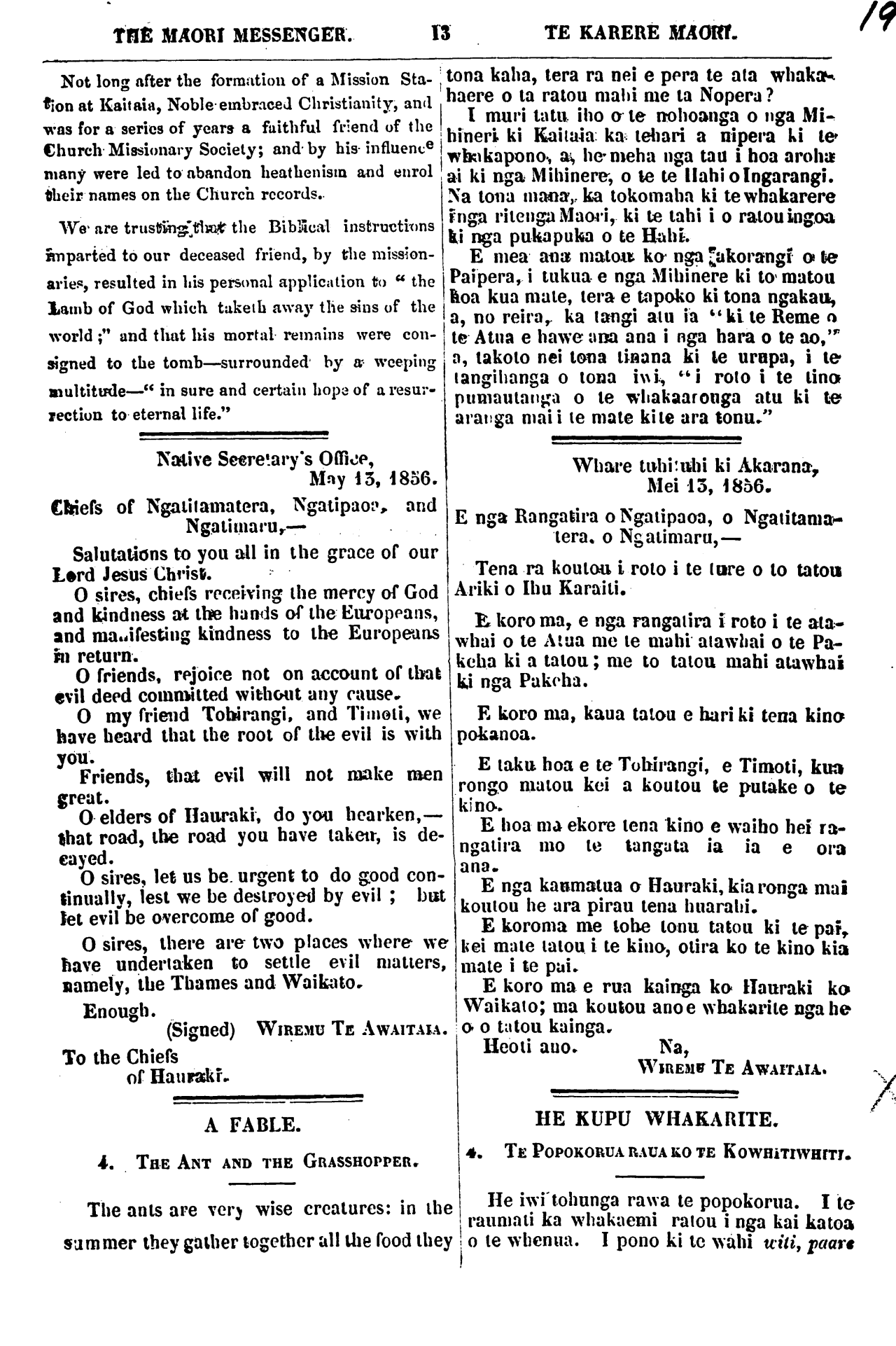 THE MAORI MESSENGER. TE KARERE MAORI. VOL. II.] AUCKLAND. SEPT. 50. 1836.— AKARANA. HEPETEMA 30, 1856. [No. 9. It is now many years since Christian Mis- sionaries first visited these Islands, and im- parted the principles of Christianity to its in- habitants. Notwithstanding the zeal and eff- orts of these Missionaries to diffuse religious knowledge among the Natives, we very much regret to find that some of their old super- stitions have been so deeply rooted that many of those professing Christianity are still ad- dicted to the heathenish practices of by gone days, such -as the Makutu and Tapu; and very lately we have heard that a Native at Waiuku was put to death on the supposition that he had occasioned the death of one or more of his tribe by the agency of Makutu; another case of a similar kind has taken place at the Whangaroa. We are also frequently informed that the Natives of the Thames and other parts in the vicinity of Auckland, have not relin- quished their faith in the Tapu; or if they have, that they still uphold this custom, and endeavour to exact payment from the Euro- peans, who do not believe in such a custom, for any transgression of its laws. Wo would advise our Native readers to abandon this custom, as the great majority of them are now aware that it is not only a very incon- venient but also a very bad one; they should follow the example of Kamehameha the an- He maha nga tau kua pahure i te oroko- taenga ma i o nga Mihinere ki tenei motu ki te whakaako i nga iwi Maori ki nga tikanga o te whakapono. Ko te kaha me te matau o enei Mihinere pai i whakaputaina kia whi- whi ai nga tangata ki te tikanga pai o te whakapono, kia kake haere ai to ratou mataur- nga i runga i te tika. E pouri ana, tenei, o matou ngakau, no te mea, e mau ana ano i a ratou etahi o nga ritenga tawhito, kua wha- kakinongia ra,— nga makutu, rae nga tapu. Na, kua rongo matou i naia tata nei, ki eta- hi tangata i whakamatea noatia. Kotahi ta- ngata i whakamatea ki Waiuku e tetahi ano o tona iwi, a, kua male etahi Id Whainga- roa; ko te take o enei kohuru he makutu. E rongo ana ano matou ki nga tikanga o nga tangata o Hauraki, me ara atu wahi i paha- ki atu o Akarana ki to ratou piringa ki nga tapu Maori. E mau ana ano to ratou wha- kaaro utu mo te takahanga o nga wahi ta- pu,—i te mea e hehe nei te Pakeha ki aua wahi; pera ia, kihai te Pakeha i whakapono ki ara tapu. Nahe ritenga whakapohehe te tapu, he ritenga kino hoki. Engari, me ta- ngo nga hoa Maori i nga tikanga o Kame-
