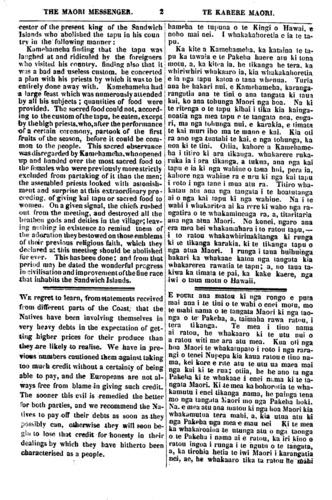 THE MAORI MESSENGER. TE KARERE MAORI. cestor of the present king of the Sandwich Islands who abolished the tapu in his coun try in the following manner: Kamehameha finning that the tapu was laughed at and ridiculed by the foreigners who visited his country, finding also that it was a bad and useless custom he concerted a plan with his priests by which it was to be entirely done away with. Kamehameha had a large feast which was numerously attended by all bis subjects; quantities of food were provided. The sacred food could not, accord- ing to the custom of the tapu. be eaten, except by the high priests, who, after the performance of a certain ceremony, partook of the first fruits of the season, before it could be com- mon to the people. This sacred observance was disregarded by Kamehameha, who opened up and handed over the most sacred food to the females who were previously more strictly excluded from partaking of it than the men; the assembled priests looked with astonish- ment and surprise at this extraordinary pro- ceeding, of giving kai tapu or sacred food to women. On a given signal, the chiefs rushed out from the meeting, and destroyed all the heathen gods and deities in the village; leav- ing nothing in existence to remind them of the adoration they bestowed on those emblems of their previous religious faith, which they declared at this meeting should be abolished forever. This has been done; and from that period may be dated the wonderful progress in civilisation and improvement of the fine race that inhabits the Sandwich Islands. WE regret to learn, from statements received fiom different parts of the Coast; that the Natives have been involving themselves in very heavy debts in the expectation of get- ting higher prices for their produce than they are likely to realise. We have in pre- vious numbers cautioned them against taking loo much credit without a certainty of being able to pay, and the Europeans are not al- ways free from blame in giving such credit The sooner this evil is remedied the better for both parties, and we recommend the Na- tives to payoff their debts as soon as they possibly can, otherwise they will soon be- gin to lose that credit for honesty in their dealings by which they have hitherto been characterised as a people. hameha te tupuna o te Kingi o Hawai, e noho mai nei. I whakakahoretia e ia te ta- pu. Ka kite a Kamehameha, ka kataina te ta- pu ka tawaia e te Pakeha haere atu ki tona motu, a, ka kitea ia, he tikanga he tera, ka whiriwhiri whakaaro ia, kia whakakahoretia e ia nga tapu katoa o tana whenua. Turia ana he hakari nui, e Kamehameha, karanga- rangatia ana te tini. o ana tangata ki taua kui, ko ana tohunga Maori nga hoa. Na ki te ritenga o te tapu kihai i tika kia kainga- noatia nga mea tapu o te tangata noa, enga- ri, ma nga tohunga nui, e karakia, e timata te kai muri iho ma te mano e kai. Kia oti ra ano nga tuatahi te kai, e nga tohunga, ka noa ki te tini. Otiia, kahore a Kamehame- ha i titi ro ki ara tikanga, whakarere ruka- ruka ia i ara tikanga, a tukua, ana nga kai tapu e ia ki nga wahine o taua hui, pera ia, kahore nga wahine ra e aru ki nga kai tapu i roto i nga tane i mua atu ra. Titiro wha- katau atu ana nga tangata i te hoatutanga ai o nga kai tapu ki nga wahine. Na i te wahi i whakaritea ai ka rere ki waho nga ra- ngatira o te whakaminenga ra. a, titaritaria ana nga ama Maori. No konei ngaro ana epa mea hei whakamahara i to ratou tapu,— i to ratou whakawhirinakitanga ki runga ki te tikanga karakia, ki te tikanga tapu o nga atua Maori. I runga i taua huihuinga hakari ka whakaae katoa nga tangata kia whakarerea rawatia te tapu; a, no taua ta- kiwa ka timata te pai, ka kake kaere, nga iwi o taua motu o Hawaii. E POURI ana matou ki nga rongo e puta mai ana i te tini o te wahi o enei motu, mo te mahi nama o te tangata Maori ki nga tao- nga o te Pakeha, a, taimaha rawa ratou, i tera tikanga. Te mea i tino nama ai ratou. he whakaaro ki te utu nui o a ratou witi me ara atu mea. Kua oti nga hoa Maori te whakatupato i roto i nga rara- ngi o tenei Nupepa kia kaua ratou e tino na- ma, kei kore e rite atu te utu ua maea mai nga kai ki te rua; otiia, he he ano ta nga Pakeha ki te whakaae i enei nama ki te ta- ngata Maori. Ki te mea ka hohorotia te wha- kamutu i enei tikanga nama, he painga tena mo nga tangata Maori mo nga Pakeha hoki. Na e mea atu ana matou ki nga hoa Maori kia whakamutua tera mahi, a, kia utua atu ki nga Pakeha nga mea e mau nei Ki te mea ka whakaroaina te utunga atu o nga taonga o te Pakeha i nama ai e ratou, ka iri kino o ratou ingoa i runga i te ngutu o te tangata, a, ka tirohia hetia te iwi Maori i karangatia nei, ae, he whakaaro tika ta ratou he mahi