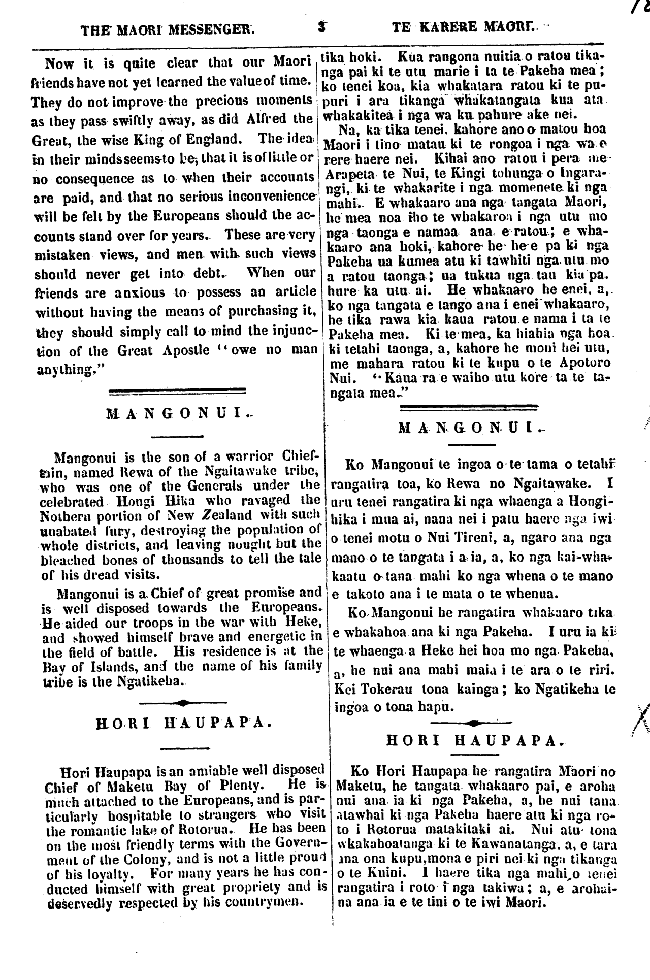 THE MAORI MESSENGER. 3 TE KARERE MAORI. Now it is quite clear that our Maori friends have not yet learned the value of time. They do not improve the precious moments as they pass swiftly away as did Alfred the Great, the wise King of England. The idea HI their minds seem to be, that it is of little or no consequence as to when their accounts are paid, and that no serious inconvenience will be felt by the Europeans should the ac- counts stand over for years. These are very mistaken views, and men with. such views should never get into debt. When our friends are anxious to possess an article without having the means of purchasing it, they should simply call to mind the injunc- tion of the Great Apostle " owe no man anything." MANGONUI.- Mangonui is the son of a warrior Chief- tain, named Rewa of the Ngaitawake tribe, who was one of the Generals under the celebrated Hongi Hika who ravaged the Nothern portion of New Zealand with such unabated fury, destroying the population of whole districts, and leaving nought but the bleached bones of thousands to tell the tale of his dread visits. Mangonui is a Chief of great promise and is well disposed towards the Europeans. He aided our troops in the war with Heke, and showed himself brave and energetic in the field of battle. His residence is at the Hay of Islands, and the name of his family tribe is the Ngatikeha. HORI HAUPAPA. Hori Haupapa is an amiable well disposed Chief of Maketu Bay of Plenty. He is much attached to the Europeans, and is par- ticularly hospitable to strangers who visit the romantic lake of Rotorua. He has been on the most friendIy terms with the Govern- ment of the Colony, and is not a little proud of his loyally. For many years he has con- ducted himself with great propriety and is deservedly respected by his countrymen. tika hoki. Kua rangona nuitia o ratou tika- nga pai ki te utu mane i ta te Pakeha mea; ko tenei koa, kia whakatara ratou ki te pu- puri i ara tikanga whakatangata kua ata whakakitea i nga wa ku pahure ake nei. Na. ka tika tenei, kahore ano o matou hoa Maori i tino matau ki te rongoa i nga wa e rere haere nei. Kihai ano rat ou i pera me Arapeta te Nui, te Kingi tohunga o Ingara- ngi, ki te whakarite i nga momenete ki nga mahi.. E whakaaro ana nga tangata Maori, he mea noa iho te whakaroa i nga utu mo nga taonga e namaa ana e ratou; e wha- kaaro ana hoki, kahore he he e pa ki nga Pakeha ua kumea atu ki tawhiti nga utu mo a ratou taonga; ua tukua nga tau kiu pa. hure ka utu ai. He whakaaro he enei, a,. ko nga tangata e tango ana i enei whakaaro, he tika rawa kia kaua ratou e nama i ta te Pakeha mea. Ki te mea, ka hiahia nga hoa ki tetahi taonga, a, kahore he moni hei utu, me mahara ratou ki te kupu o te Apotoro Nui. " Kaua ra e waiho utu kore ta te ta- ngata mea." MANGONUI. Ko Mangonui te ingoa o te tama o tetahi rangatira toa, ko Rewa no Ngaitawake. I uru tenei rangatira ki nga whaenga a Hongi- hika i mua ai, nana nei i patu haere nga iwi o tenei motu o Nui Tireni. a, ngaro ana nga mano o te tangata i a ia, a, ko nga kai-wha- kaatu o tana mahi ko nga whena o te mano e takoto ana i te mata o te whenua. Ko Mangonui be rangatira whakaaro tika e whakahoa ana ki nga Pakeha. I uru ia ki- te whaenga a Heke hei hoa mo nga Pakeha, a, he nui ana mahi maia i te ara o te riri. Kei Tokerau tona kainga; ko Ngatikeha te ingoa o tona hapu. HORI HAUPAPA. Ko Hori Haupapa he rangatira Maori no Maketu, he tangata whakaaro pai, e aroha nui ana ia ki nga Pakeha, a, he nui taua atawhai ki nga Pakeha haere atu ki nga ro- to i Rotorua matakitaki ai, Nui atu tona wkakahoatanga ki te Kawanatanga, a, e tara ana ona kupu, mona e piri nei ki nga tikanga o te Kuini. 1 haere tika nga mahi, o tenei rangatira i roto i nga takiwa; a, e arohai- na ana ia e te tini o te iwi Maori.