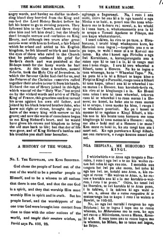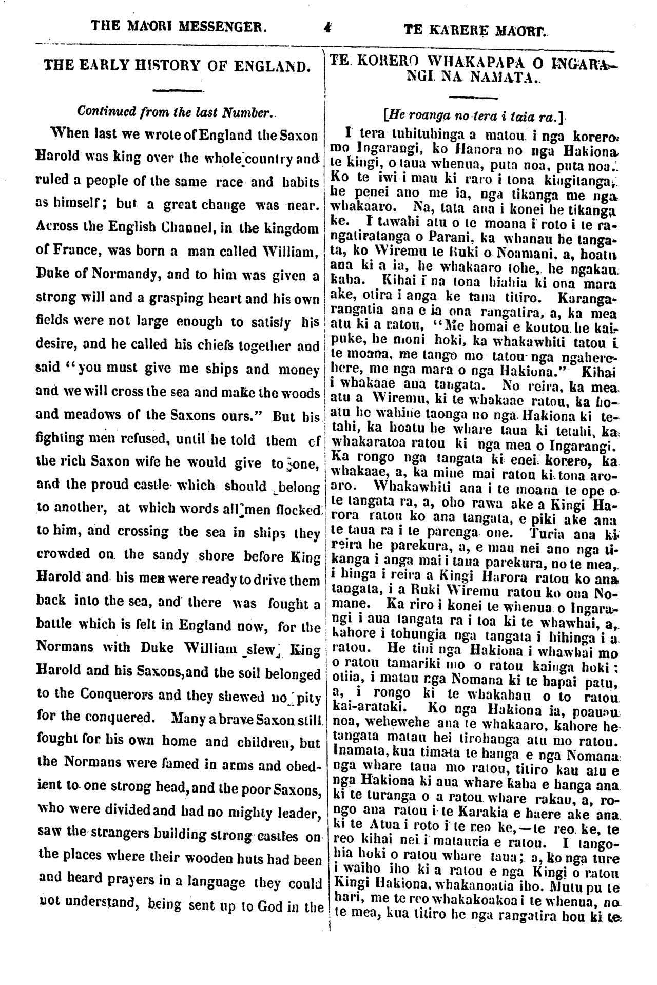 THE MAORI MESSENGER. TE KARERE MAORI. THE EARLY HISTORY OF ENGLAND. Continued from the last Number. When last we wrote of England the Saxon ruled a people of the same race and habits as himself; but a great change was near Across the English Channel, in the kingdom of France, was born a man called William, Duke of Normandy, and to him was given a strong will and a grasping heart and his own fields were not large enough to satisfy his desire, and he called his chiefs together and said "you must give me ships and money and we will cross the sea and make the woods and meadows of the Saxons ours." But bis fighting men refused, until he told them of the rich Saxon wife he would give to one, and the proud castle which should belong to another, at which words all men flocked to him, and crossing the sea in ships they crowded on. the sandy shore before King Harold and his men were ready to drive them back into the sea, and there was fought a battle which is felt in England now, for the Normans with Duke William slew King Harold and bis Saxons, and the soil belonged to the Conquerors and they showed no pity for the conquered. Many a brave Saxon still fought for his own home and children, but the Normans were famed in arms and obed- ient to one strong head, and the poor Saxons, who were divided and had no mighty leader, saw the strangers building strong castles on the places where their wooden huts had been and heard prayers in a language they could not understand, being sent up to God in the TE KORERO WHAKAPAPA O INGARA NGI NA NAMATA. [He roanga no tera i taia ra.] I tera tuhituhinga a matou, i nga korero mo Ingarangi, ko Hanora no nga Hakiona. te kingi, o taua whenua, puta noa, puta noa. Ko te iwi i mau ki raro i tona kingitanga,. be penei ano me ia, nga tikanga me nga whakaaro. Na, tata ana i konei he tikanga ke. I tawahi atu o te moana i roto i te ra- ngatiratanga o Parani. ka whanau he tanga- ta, ko Wiremu te Ruki o Noamani, a, hoatu ana ki a ia, he whakaaro rohe, he ngakau. kaha. Kihai i na tona hiahia ki ona mara ake, otira i anga ke tana titiro. Karanga- rangatia ana e ia ona rangatira, a, ka mea atu ki a ratou, "Me homai e koutou he kai- puke, he moni hoki, ka whakawhiti tatou i te moana, me tango mo tatou nga ngahere- here, me nga mara o nga Hakiona." Kihai i whakaae ana tangata. No reira, ka mea atu a Wiremu, ki te whakaae ratou, ka ho- atu he wahine taonga no nga. Hakiona ki te- tahi, ka hoatu he whare taua ki tetahi, ka whakaratoa ratou ki nga mea o Ingarangi. Ka rongo nga tangata ki enei. korero, ka whakaae, a, ka mine mai ratou ki tona aro- aro. Whakawhiti ana i te moana te ope o te tangata ra, a, oho rawa ake a Kingi Ha- rora ratou ko ana tangata, e piki ake ana te taua ra i te parenga one. Turia ana ki reira he parekura, a, e mau nei ano nga ti- kanga i anga mai i taua parekura, note mea,. i hinga i reira a Kingi Harora ratou ko ana tangata, i a Ruki Wiremu ratou ko ona No- mane. Ka riro i konei te whenua o Ingara- ngi i aua tangata ra i toa ki te whawhai, a,. kahore i tohungia nga tangata i hihinga i a ratou. He tini nga Hakiona i whawhai mo o ratou tamariki mo o ratou kainga hoki; otiia, i matau nga Nomana ki te hapai patu, a, i rongo ki te whakahau o to ratou. kai-arataki. Ko nga Hakiona ia, poauau noa, wehewehe ana te whakaaro, kahore he tangata matau hei tirohanga atu mo ratou. Inamata, kua timata te hanga e nga Nomana nga whare taua mo ratou, titiro kau atu e nga Hakiona ki aua whare kaha e Hanga ana ki te turanga o a ratou whare rakau, a, ro- ngo aua ratou i te Karakia e haere ake ana. ki te A tua i roto i te reo ke,—te reo. ke, te reo kihai nei i matauria e ratou. I tango- hia hoki o ratou whare taua; a, Ro nga ture i waiho iho ki a ratou e nga Kingi o ratou Kingi Hakiona, whakanoatia iho. Mutu pu te hari, me te reo whakakoakoa i te whenua, no te mea, kua titiro he nga rangatira hou ki te