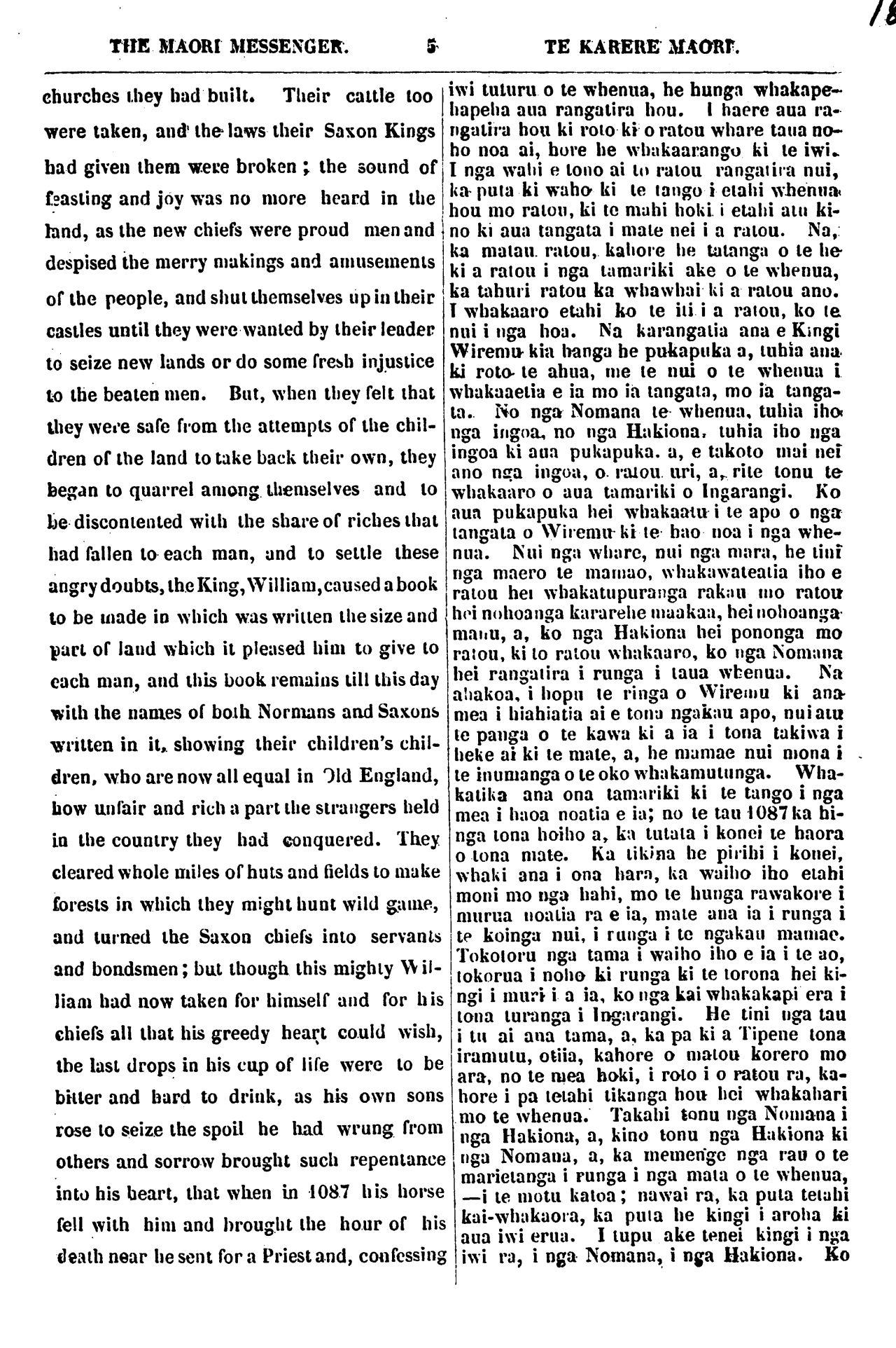 THE MAORI MESSENGER. 3 TE KARERE MAORI churches they had built . Their cattle too were taken, and the laws their Saxon Kings had given them were broken; the sound of feasting and joy was no more heard in the land, as the new chiefs were proud men and despised the merry makings and amusements of the people, and shut themselves up in their castles until they were wanted by their leader to seize new lands or do some fresh injustice to the beaten men. But, when they felt that they were safe from the attempts of the chil- dren of the land to take back their own, they began to quarrel among themselves and to be discontented with the share of riches that had fallen to each man, and to settle these angry doubts, the King, William, caused a book to be made in which was written the size and part of land which it pleased him to give to each man, and this book remains till this day with the names of both Normans and Saxons written in it, showing their children's chil- dren, who are now all equal in Old England, now unfair and rich a part the strangers held in the country they had conquered. They cleared whole miles of huts and fields to make forests in which they might hunt wild game, and turned the Saxon chiefs into servants and bondsmen; but though, this mighty Wil- liam had now taken for himself and for his chiefs all that his greedy heart could wish, the last drops in his cup of life were to be bitter and hard to drink, as his own sons rose to seize the spoil he had wrung from others and sorrow brought such repentance into his heart, that when in 1087 his horse fell with him and brought the hour of his death near he sent for a Priest and, confessing iwi tuturu o te whenua, he hunga whakape- hapeha aua rangatira hou. I haere aua ra- ngatira hou ki roto ki o ratou whare taua no- ho noa ai, hore he whakaarango ki te iwi. I nga wahi e tono ai to ratou rangatira nui, ka puta ki waho ki te tango i etahi whenua hou mo ratou, ki te mahi hoki i etahi atu ki- no ki aua tangata i mate nei i a ratou. Na, ka matau ratou, kahore he tatanga o te he- ki a ratou i nga tamariki ake o te whenua, ka tahuri ratou ka whawhai ki a ratou ano. I whakaaro etahi ko te iti i a ratou, ko te nui i nga hoa. Na karangatia ana e Kingi Wiremu kia hanga he pukapuka a, tuhia ana ki roto te ahua, me te nui o te whenua i whakaaetia e ia mo ia tangata, mo ia tanga- ta. No nga Nomana te whenua, tuhia iho nga ingoa no nga Hakiona, tuhia iho nga ingoa ki aua pukapuka a, e takoto mai nei ano nga ingoa, o ratou uri, a, rite tonu te whakaaro o aua tamariki o Ingarangi. Ko aua pukapuka hei whakaatu i te apo o nga tangata o Wiremu ki te hao noa i nga whe- nua. Nui nga whare, nui nga mara, he tini nga maero te mamao, whakawateatia iho e ratou hei whakatupuranga rakau mo ratou hei nohoanga kararehe maaka, hei nohoanga manu, a, ko nga Hakiona hei pononga mo ratou, ki to ratou whakaaro, ko nga Nomana hei rangatira i runga i taua whenua. Na ahakoa, i hopu te ringa o Wiremu ki ana mea i hiahiatia ai e tona ngakau apo, nui atu te panga o te kawa ki a ia i tona takiwa i heke ai ki te mate, a, he mamae nui mona i te inumanga o te oko whakamutunga. Wha- katika ana ona tamariki ki te tango i nga mea i haoa noatia e ia; no te tau 1087 ka hi- nga tona hoiho a, ka tutata i konei te haora o tona mate. Ka tikina he pirihi i konei, whaki ana i ona hara, ka waiho iho etahi moni mo nga hahi, mo te hunga rawakore i murua noatia ra e ia, mate ana ia i runga i te koinga nui, i runga i te ngakau mamae. Tokotoru nga tama i waiho iho e ia i te ao, tokorua i noho ki runga ki te torona hei ki- ngi i muri i a ia, ko nga kai whakakapi era i tona turanga i Ingarangi. He tini nga tau i tu ai ana tama, a, ka pa ki a Tipene tona iramutu, otiia, kahore o matou korero mo ara, no te mea hoki, i roto i o ratou ra, ka- hore i pa tetahi tikanga hou hei whakahari mo te whenua. Takahi tonu nga Nomana i nga Hakiona, a, kino tonu nga Hakiona ki nga Nomana, a, ka memenge nga rau o te marietanga i runga i nga mata o te whenua, —i te motu katoa; nawai ra, ka puta tetahi kaiwhakaora, ka puta he kingi i aroha ki aua iwi erua. I tupu ake tenei kingi i nga tiwi ra, i nga Nomana, i nga Hakiona. Ko