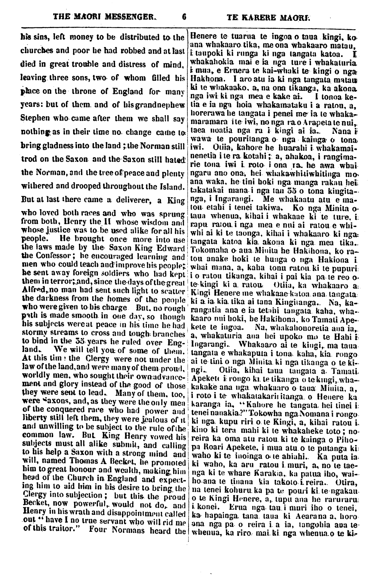 THE MAORI MESSENGER. 6 TE KARERE MAORI. his sins, left money to be distributed to the churches and poor he had robbed and at last died in great trouble and distress of mind, leaving three sons, two of whom filled his place on the throne of England for many years: but of them and of his grand nephew Stephen who came after them we shall say nothing as in their time no change came to bring gladness into the land; the Norman still trod on the Saxon and the Saxon still haled the Norman, and the tree of peace and plenty withered and drooped throughout the Island. But at last there came a deliverer, a King who loved both races and who was sprung from both, Henry the 11 whose wisdom and whose justice was to be used alike for all his people. He brought once more into use the laws made by the Saxon King Edward the Confessor; he encouraged learning and men who could leach and improve his people; be sent away foreign soldiers who had kept them in terror; and, since the days of the great Alfre, no man had sent such light to scatter Ihe darkness from the homes of the people who were given to his charge But no rough path is made smooth in one day, so though his subjects were at peace in his time he had stormy streams to cross and tough branches to bind in the 55 years he ruled over Eng- land. We will tell you of some of them. At this time the Clergy were not under the law of the land, and were many of them proud, worldly men, who sought their own advance- ment and glory instead of the good of those they were sent to lead. Many of them, too, were Saxons, and, as they were the only men of the conquered race who had povver and liberty still left them, they were jealous of it and unwilling to be subject to the ruIe of the common law. But King Henry vowed his subjects must all alike submit, and calling to bis help a Saxon with a strong mind and will, named Thomas A Becket, he promoted him to great honour and wealth, making, him head of the Church in England and expect- ing him to aid him in his desire to bring the Clergy into subjection; but this the proud Becket, now powerful.. would not do, and Henry in his wrath and disappointment called out " have I no true servant who will rid me of this traitor." Four Normans heard the Henere te tuarua te ingoa o taua kingi, ko ana whakaaro tika, me ona whakaaro matau, i taupoki ki runga ki nga tangata katoa. I whakahokia mai e ia nga ture i whakaturia i mua e Eruera te kai-whaki te kingi o nga Hakihona. I aro atu ia ki nga tangata matau ki te whakaako, a, na ona tikanga, ka akona nga iwi ki nga mea e kake ai:. i tonoa ke- tia e ia nga hoia whakamataku i a ratou, a, horerawa he tangata i penei me ia te whaka- maramara i te iwi, no nga ra o Arapeta te nui,. taea noatia nga ra i kingi ai ia. Nana i wawa te pouritanga o nga kainga o tona iwi. Otiia, kahore he huarahi i whakamai- nenetia i te ra kotahi; a, ahakoa, i rangima- rie tona iwi i. roto i ona ra he awa whai ngaru ano ona hei whakawhitiwhitinga mo ana waka, he tini hoki nga manga rakau hei takatakai mana i nga tau 55 o tona kingita- nga, i Ingarangj. Me whakaatu atu e ma- tou etahi i tenei takiwa. Ko nga Minita o taua whenua, kihai i whakaae ki te ture i rapu ratou i nga mea e nui ai ratou e whi- whi ai ki te taonga, kihai i whakaaro ki nga tangata katoa kia akona ki nga mea tika. Tokomaha o aua Minita he Hakihona, ko ra- tou anake hoki te hunga o nga Hakiona i whai mana, a, kaha tonu ratou ki te pupuri: i o ratou tikanga, kihai i pai kia pa te reo o ! te kingi ki a ratou. Otiia, ka whakaaro a: Kingi Henere me whakaae katoa ana tangata ki a ia kia tika ai tana Kingitanga. Na, ka- rangatia ana e ia tetahi tangata kaha, wha- kaaro nui hoki, he Hakihona. ko Tamati Ape- kete te ingoa. Na, whakahonoretia ana ia. a, whakaturia and hei upoko mu te Hahi i Ingarangi. Whakaaro ai te kingi, ma taua tangata e whakaputa i tona, kaha, kia rongo ai te tini o nga Minita ki nga tikanga o te ki- ngi. Otiia, kihai taua tangata a. Tamati Apekete i rongo ki. te tikanga o te kingi, wha- kakake ana nga whakaaro o taua Minita, a, i roto i te whakatakariritanga o Henere ka karanga ia, "Kahore he tangata, hei tinei i tenei nanakia?" Tokowha nga Nomana i rongo ki nga kupu riri o te Kingi, a, kihai ratou i kino ki tera mahi ki te whakaheke toto; no reira ka oma atu ratou ki te kainga o Piho- pa Roari Apekete, i mua atu o te putanga ki: waho ki te inoinga o te ahiahi. Ka puta ia ki waho, ka aru ratou i muri, a, no te tae- nga ki te whare Karakia, ka patua iho, wai- hoana te tinana kia takoto i. rei ra. Otira, na tenei kohura ka pa te poari ki te ngakau o te Kingi Henere, a, tupu ana he raruraru: i konei. Erua nga tau i muri iho o tenei, ka hapainga tana taua ki Aearana a, horo ana nga pa o reira i a ia, tangohia ana te whenua, ka riro- mai ki nga whenua o te ki-
