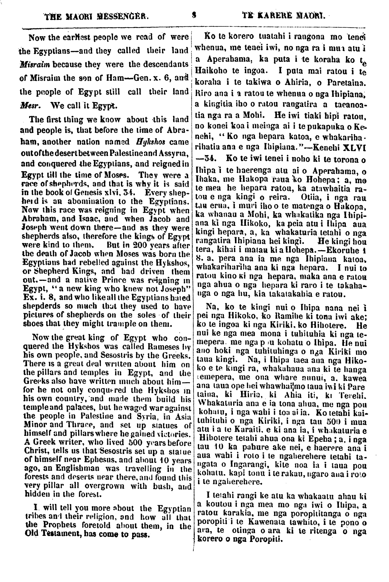 THE MAORI MESSENGER. TE KARERE MAORI. Now the earliest people we read of were the Egyptians—and they called their land Misraim because they were the descendants of Misraim the son of Ham—Gen.x. 6, and the people of Egypt still call their land Mesr. We call it Egypt. The first thing we know about this land and people is, that before the time of Abra- ham, another nation named Hykshos came out of the desert between Palestine and Assyria, and conquered the Egyptians, and reigned in Egypt HII the time of Moses. They were a race of shepherds, and that is why it is said in the book of Genesis xlvi, 54. Every shep- herd is an abomination to the Egyptians. Now this race was reigning in Egypt when Abraham, and Isaac, and when Jacob and Joseph went down there—and as they were shepherds also, therefore the kings of Egypt were kind to them. But in 200 years after the death of Jacob when Moses was born the Egyptians had rebelled against the Hykshos, or Shepherd Kings, and had driven them out.—and a native Prince was reigning in Egypt, "a new king who knew not Joseph" Ex. i. 8, and who like all the Egyptians hated shepderds so much that they used to have pictures of shepherds on the soles of their shoes that they might trample on them. Now the great king of Egypt who con- quered the Hykshos was called Rameses by his own people, and Sesostris by the Greeks. There is a great deal written about him on the pillars and temples in Egypt, and the Greeks also have written much about him— for he not only conquered the Hyksnos in his own country, and made them build his temple and palaces, but he waged war against the people in Palestine and Syria, in Asia Minor and Thrace, and set up statues of himself and pillars where he gained victories. A Greek writer, who lived 500 years before Christ, tells us that Sesostris set up a statue of himself near Ephesus, and about 10 years ago, an Englishman was travelling in the forests and deserts near there, and found this very pillar all overgrown with bush, and hidden in the forest. I will tell you more about the Egyptian tribes and their religion, and how all that the Prophets foretold about them, in the Old Testament, has come to pass. i Ko te korero tuatahi i rangona mo tenei whenua, me tenei iwi, no nga ra i mua atu i a Aperahama, ka puta i te koraha ko te i Haikoho te ingoa. I puta mai ratou i te koraha i te takiwa o Ahiria, o Paretaina. Riro ana i a ratou te whenua o nga Ihipiana. a kingitia iho o ratou rangatira a taeanoa- tia nga ra a Mohi. He iwi tiaki hipi ratou. no konei koa i meinga ai i te pukapuka o Ke- nehi, " Ko nga hepara katoa, e whakariha rihatia ana e nga Ihipiana." Kenehi XLVI —54. Ko te iwi tenei i noho ki te torona o Ihipa i te haerenga atu ai o Aperahama, o Ihaka, me Hakopa raua ko Hohepa; a, mo te mea he hepara ratou, ka atawhaitia ra- tou e nga kingi o reira. Otiia, i nga rau tau erua, i muri iho o te matenga o Hakopa. ka whanau a Mohi, ka whakatika nga Ihipi- ana ki nga Hikoko, ka peia atu i Ihipa aua kingi hepara, a, ka whakaturia tetahi o nga rangatira Ihipiana hei kingi. He kingi hou tera, kihai i matau ki a Hohepa. --Ekoruhe 1 8. a, pera ana ia rae nga Ihipiana katoa. whakarihariha ana ki nga hepara. I nui to ratou kino Ki nga hepara, maka ana e ratou nga ahua o nga hepara ki raro i te takaha- nga o nga hu, kia takatakahia e ratou. Na, ko te kingi nui o Ihipa nana nei i pei nga Hikoko, ko Ramihe ki tona iwi ake; ko te ingoa ki nga Ku iki, ko Hihotere. He nui ke nga mea mona i tuhituhia ki nga te- mepera me nga pou kohatu o Ihipa. He nui ano hoki nga tuhituhinga o nga Kiriki mo taua kingi. Na, i Ihipa taea ana nga Hiko- ko e te kingi ra, whakahaua ana ki te hanga temepera, me ona whare nunui, a, kawea ana taua ope hei whawhai mo taua iwi ki Pare taina, ki Hiria, ki Ahia iti, ki Terehi. Whakaturia ana e ia tona ahua, me nga pou kohatu, i nga wahi i toa ui ia. Ko tetahi kai- tuhituhi o nga Kiriki, i nga tau 500 i mua atu i a te Karaiti, e ki ana ia, i whakaturia e Hihotere tetahi ahua ona ki Epeha; a. i nga tau 10 ka pahure ake nei, e haerere ana i aua wahi i roto i te ngaherehere tetahi ta- ngata o Ingarangi, kite noa ia i taua pou kohatu, kapi tonu i te rakau, ngaro aua i roto i te ngaherehere. I tetahi rangi ke atu ka whakaatu ahau ki a koutou i nga mea mo nga iwi o Ihipa, a ratou karakia, me nga porotititanga o nga poropiti i te Kawenata tawhito, i te pono o ara, te otinga o ara ki te ritenga o nga korero o nga Poropiti.