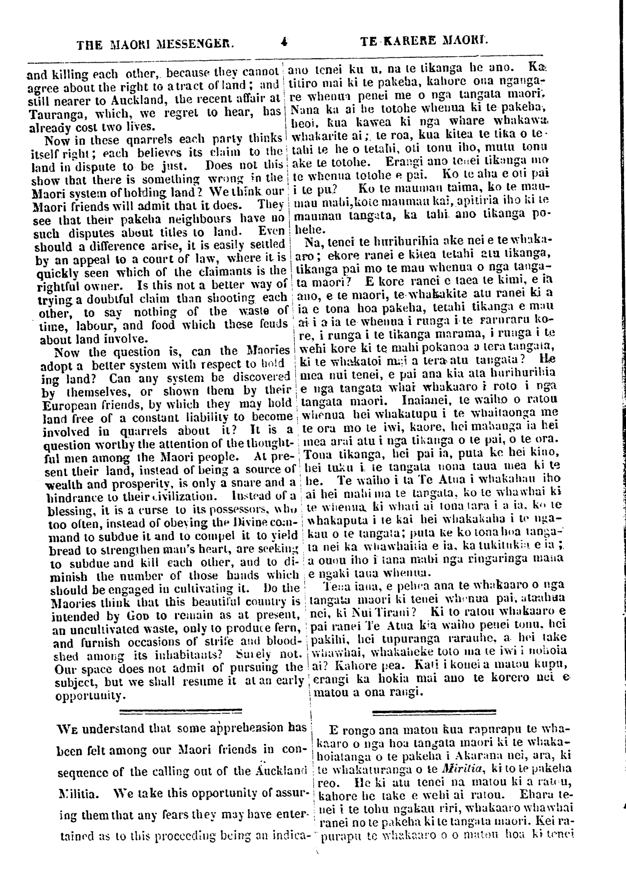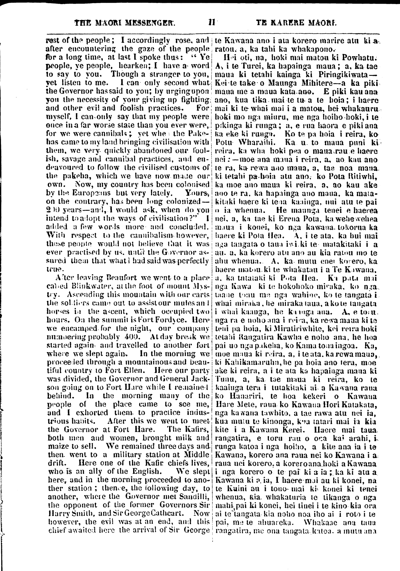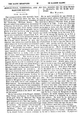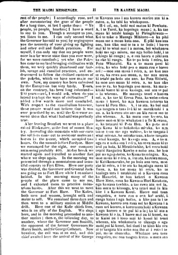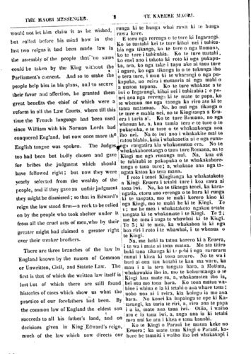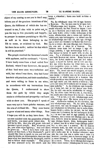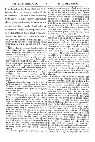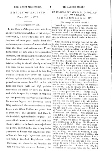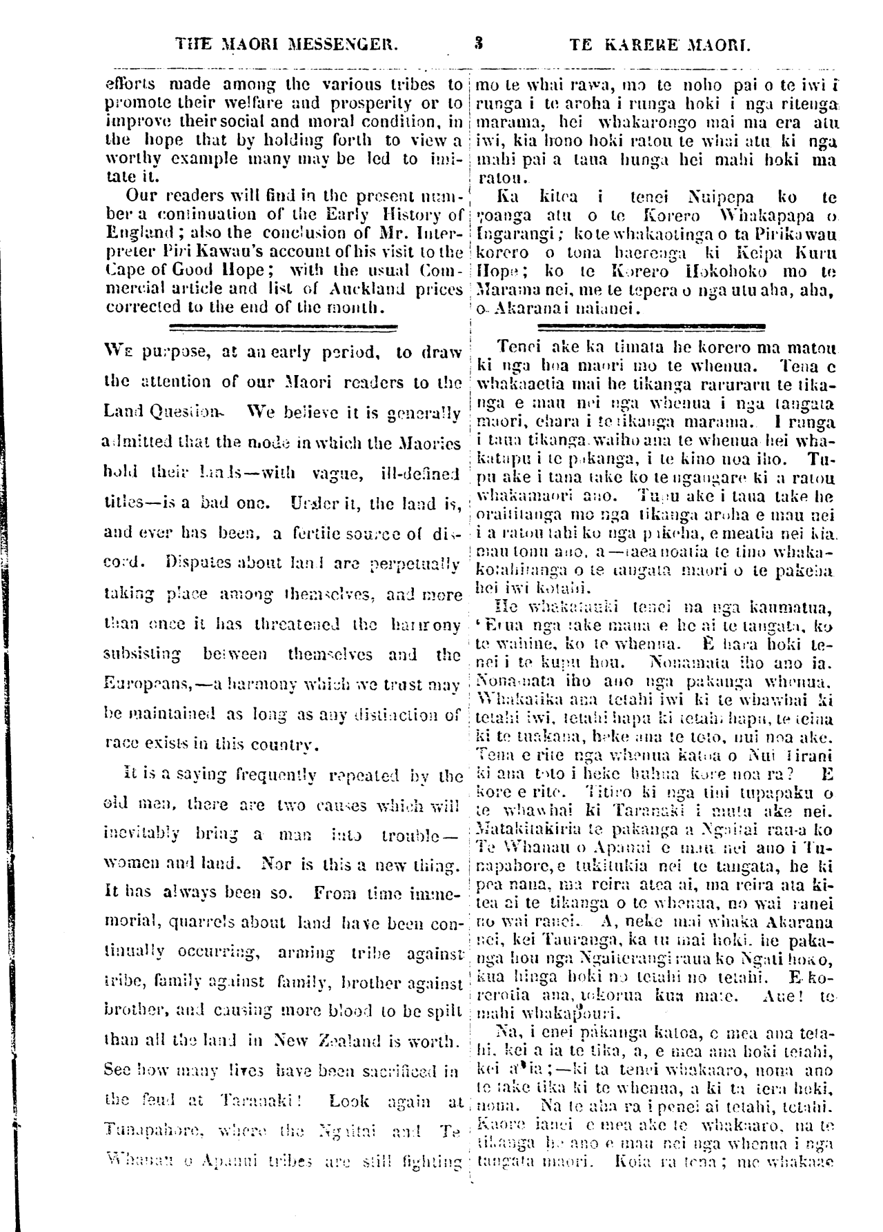 THE MAORI MESSENGER. TE KAKERE MAORI. VOL. III.] AUCKLAND. MARCH 31, 1857.-——AKARANA, MAEHE 31, 1857. [No. 5. In the last number of ihe " Messenger" an endeavour was made to direct the attention of our Maori friends to a subject of serious and growing importance, viz., the necessity of at once devising some means of providing education for their children, more especially with a view to their being taught the English language, so that they may be able to seek knowledge from the same sources as those from which the pakeha is himself sup- plied. • We repeat, that it is in the hope of induc- ing a widely-spread taste for reading and of creating a thirst for information respecting the various matters connected with civilised life, and what is going on in the world, that; this periodical is issued by the Government. The degree of success which is attained will I TO Pepuere Karere, kotahi ta matou korero nui i hapainga e matou hei korero whakaoho ma matou i te whakaaro o o matou hoa tanga- ta maori. Ta matou korero., ko tetahi ti- kanga kia whano te kimihia e ratou mo nga tamariki kia whakaakona, kia whakatupuria ake hoki i runga i te mohio, i te whai-matau; ko te tino mea ia kia whakaakona ki te reo Ingirihi, kia korero tahi ai ratou ko nga tamariki pakeha i roto i nga pukapuka pakeha, ara, kia rite tahi te taha utuutu wai ki te ringa ringa o te tahi, o tetahi, kia haere tahi ai ki taua puna kotahi utu wai mai ai. Ka hokia ano taua kupu a matou i meatia atu ra i reira, kote take otenei pukapuka he whakahiakai i nga tangata maori; kia kitea me e kore ranei e hiakai mai ki nga korero mo nga tini mea e whakahaerea nei e te pakeha, e nga iwi kua whaitikanga, kua noho noa i runga i te matauranga. Ae ra, he whakamatamatau la tenei pukapuka, kia kitea me e kore ranei e tupu ake he hiahia ki te kimi tikanga i roto i nga pukapuka, ki nga korero hoki o nga tini aha e mahia an i te ao nei. Na. hei tohu tenei e mohiotia ai kua whai hiahia pena, me neke haere ra male nui mai ki te 'Karere' nei. Mehemea rapea kua nui haere te ngakau korero pukaa puka i roto i te tokomaha o nga tangata