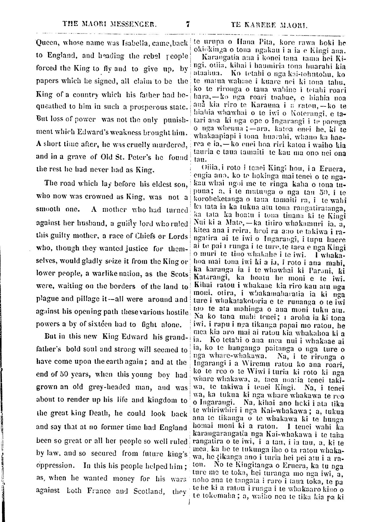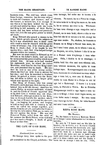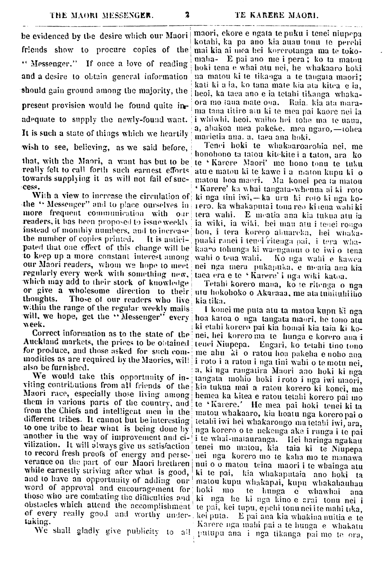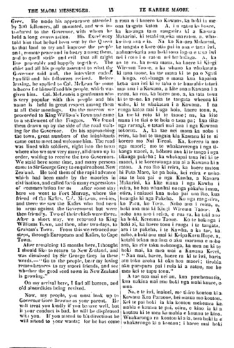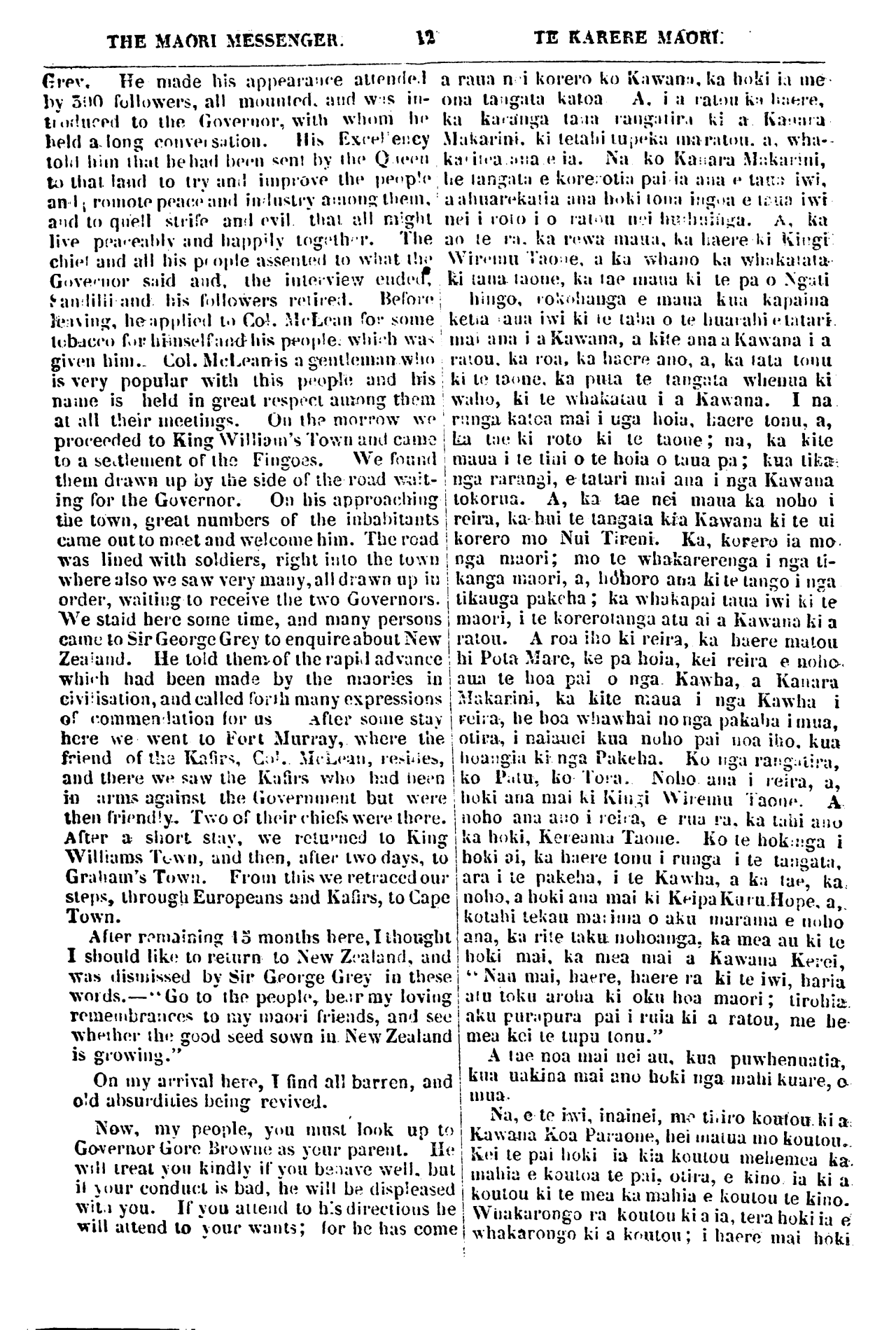 THE MAORI MESSENGER. TE KAKERE MAORI. VOL. III.] AUCKLAND. MARCH 31, 1857.-——AKARANA, MAEHE 31, 1857. [No. 5. In the last number of ihe " Messenger" an endeavour was made to direct the attention of our Maori friends to a subject of serious and growing importance, viz., the necessity of at once devising some means of providing education for their children, more especially with a view to their being taught the English language, so that they may be able to seek knowledge from the same sources as those from which the pakeha is himself sup- plied. • We repeat, that it is in the hope of induc- ing a widely-spread taste for reading and of creating a thirst for information respecting the various matters connected with civilised life, and what is going on in the world, that; this periodical is issued by the Government. The degree of success which is attained will I TO Pepuere Karere, kotahi ta matou korero nui i hapainga e matou hei korero whakaoho ma matou i te whakaaro o o matou hoa tanga- ta maori. Ta matou korero., ko tetahi ti- kanga kia whano te kimihia e ratou mo nga tamariki kia whakaakona, kia whakatupuria ake hoki i runga i te mohio, i te whai-matau; ko te tino mea ia kia whakaakona ki te reo Ingirihi, kia korero tahi ai ratou ko nga tamariki pakeha i roto i nga pukapuka pakeha, ara, kia rite tahi te taha utuutu wai ki te ringa ringa o te tahi, o tetahi, kia haere tahi ai ki taua puna kotahi utu wai mai ai. Ka hokia ano taua kupu a matou i meatia atu ra i reira, kote take otenei pukapuka he whakahiakai i nga tangata maori; kia kitea me e kore ranei e hiakai mai ki nga korero mo nga tini mea e whakahaerea nei e te pakeha, e nga iwi kua whaitikanga, kua noho noa i runga i te matauranga. Ae ra, he whakamatamatau la tenei pukapuka, kia kitea me e kore ranei e tupu ake he hiahia ki te kimi tikanga i roto i nga pukapuka, ki nga korero hoki o nga tini aha e mahia an i te ao nei. Na. hei tohu tenei e mohiotia ai kua whai hiahia pena, me neke haere ra male nui mai ki te 'Karere' nei. Mehemea rapea kua nui haere te ngakau korero pukaa puka i roto i te tokomaha o nga tangata