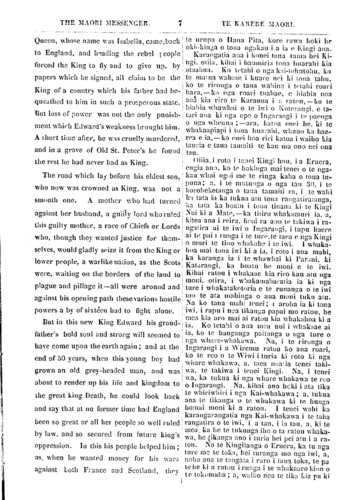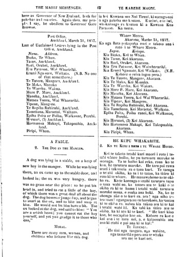 THE MAORI MESSENGER. TE KARERE MAORI. here as Governor of New Zealand both for pakehas and maories. Again then my peo- ple. I say, be obedient to Governor Gore Browne. Post Office Auckland , March 51, l857. LIST of Unclaimed Letters lying in the Post Office, Auckland. Name. Address. Ihaka, Te Whau. Tame, Auckland. Rori, Orakei, Auckland. Eru Patuone, Wai Whaririki. Erueti Ngamate, Waikato. (N.B. No one of that name there.) Te Tutere, Mangere, Auckland. Te Mako, Manuka To Wareha, Waima. Mere P. Mare, Auckland. Maneha, Auckland. Mataea Tueru, Wai Wharariki. Tipene,. Mangere. Te Ropiha Ruhiruhi, Auckland. Tamehana, Maraetai, Waikato. Epiha Poita or Poiha, Waikanae, Perehi. Heruari, ( 3 ) Auckland. Horomona Makapi, Takapuahia, Auck- land. Piripi, Whau. A FABLE. 2. THE DOG INN THE MANGER. A dog was lying in a stable, on a heap of new hay in the manger. While he was lying there, an ox came up to the stable door, and looked in; the ox was very hungry, there was no grass near the place: so he put his head in, and tried to eat a liltle of the hay, of which there was a great deal all about the dog. The dog however jumped up, and began to snarl at the ox, and to bite and snap at him. He would not let him have a bit. The ox looked at the dog, and said to him: " You are a selfish beast; you cannot eat the hay yourself, and yet you grudge it to those who can," MORAL. There are many men, women, and children who behave like this dog. ia hei Kawana mo Nui Tireni, ki vvaenganui o nga pakeha me koutou. E te iwi, e te iwi, whakarongo ra koutou ki a Kawana Koa Paraone; Ka mutu. Whare Meera, Akarana, Maehe 31, 1857. Ko nga Reta pukapuka enei e takoto ana i roto i te Whare Meera. Ingoa, Kainga. Kia Ihaka, Kei te Whau. Kia Tame, Kei Akarana. Kia Rori, Orakei, Akarana. Kia Erua Pataone, Kei Waiwharariki. Kia Erueti Ngamate Koi Waikato. (N.B. Kahore o reira ingoa pera.) Kia Te Tutere, Mangere, Akarana. Kia Te Mako, Kei Manuka. Kia Te Wareha, Kei Waima, Kia Mere P. Mare, Kei Akarana. Kia Maneha, Kei Akarana. Kia Mataea Tueru Kei Wai Wharariki. Kia Tipene Kei Mangere. Kia Te Kopiha Ruhiruhi, Kei Akarana. Kia Tamehana, Kei Maraetai, Waikato. Epiha Poita, Poiha ranei, Kei Waikanae, Perehi. Kia Heruari, (5) Kei Akarana. Kia Horomona Makapi, Kei Takapuahia. Akarana. Kia Piripi, Whau. HE KUPU WHAKARITE. 2 KO TE KURI I ROTO I TE WHARE HOIHO. Kei te takoto tetahi kuri maori i roto i te- tahi whare hoiho, he pu tarutaru maroke te moenga. Ta te hoiho kai reka, raua ko te kau he tarutaru maroke. He taru pai rawa tenei i takotoria ra e taua kuri. Te taenga o tetahi okiha, ka tu i te tatau, ka titiro ki roto ki te whare. He manawahemo to te oki- ha ra. Kote korenga o tetahi tarutaru tupu o taua wahi na, ka totoro atu te kaki o te okiha ra ki te hamu i tetahi wahi tarutaru maroke mana, e roaka ana hoki. Na, ko te ohonga ake o te kuri ra, ara! nga niho te- tea tonu! ngangara ana te korokoro, ka tautau ki te okiha ra. nohea kia tukua atu ki te kai i tetahi wall i hi. Ka tahi ka titiro atu te okiha, ka ki atu ki te kuri. " He kuri kino koe, he matapiko koe na. Kahore ra kue e kai a ana i te taru nei, a, e kaiponuhia atu ana ki etahi e pai ana ki te ka." TE RITENGA. He tini nga tangata, nga wahine, nga tamariki e pera ana te whaka aro me te kuri nei.