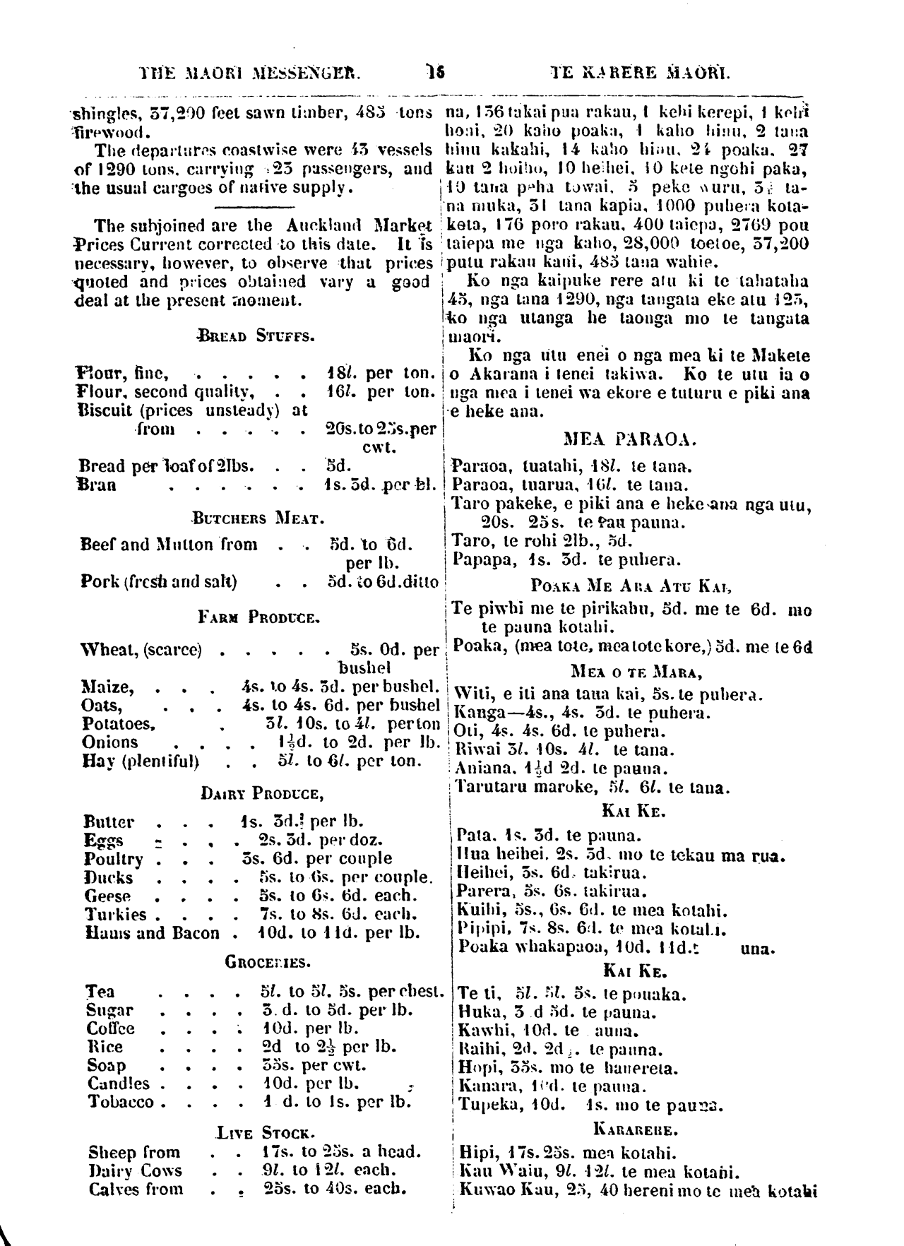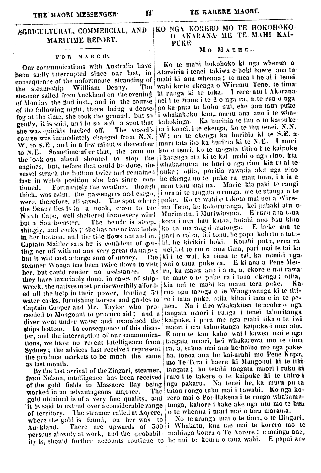 THE MAORI MESSENGER 11 TE KARERE MAORI; AGRICULTURAL COMMERCIAL, AND MARITIME REPORT. FOR MARCH. Our communications with Australia have been sadly interrupted since our last, in consequence of the unfortunate stranding of the steamship Wiliam Denny. The steamer sailed from Auckland on the evening of Monday the 2nd inst., and in the course of the following night, there being a dense- fog at the time, she took the ground, but so gently, it is said, and in so soft a spot that she was quickly hacked off. The vessel's course was immediately changed from N.N. W. to S.E, and in a few minutes thereafter to N.E. Sometime after that, the man on the look out ahead should to stop the engines, but, before that could be. done. the vessel struck the bottom twice and remained fast. in which position she has since con- tinued. Fortunately the weather, though thick, vvas calm the passengers and cargo, were, therefore all saved. The spot where the Denny lies is in a nook, close to the North Cape, well sheltered from every wind but a Suil'h^e;?sie;*. Tlsft he:ich rs sle.-p. shnigiy, ;tud r^;-ky ; she has on«' oi- two ;«o';rs in her i);Klo.n. ;m.l t;ie l"ute flows ont;in li;i. Captain Ma;s!er sa;s he is c.oii;nleni of gpi- ling lier off \\viih nil any very greal da!na^e ; but it will co-is, a' l;irge siiiu.of money. Ihe steam«T \\Vo-nga has been twice flowii tovio'n hei', but could render no a^si^ian.'e. As they huve invaria'.)ly (Imu-, in c.ases oi' ship- wreek. the natives in v<l pr;»isew(»rihily a':Tor,l- ed all Hie help in Ui«-i;- power, le;i!li,i^ 5 ) w;iler ca'bs, furnishiiig hmses anii gu des lo Captain Co'»per ana Mr. Tavior wirn pro- ceedeil ti> Mo'igo'.iiii to piM^ure aid ; and a diver weni und^r wa'.er and examinoil tlie sliips bolto-.i». In consequence oflhis disas- ter, and llie inlerru^tion of our comiuunica- lions, we have no recent i n tei s i ;;e;i e.« from Sydney ; ihe advicea last ruceiveJ repre^enl the pro luce markets to be much the same as last ino nib. Dy the last amvai of theZingari, steamer, from kelson, inie'ili^ein'e has been received of the gold fie!ds in Massacre Bay being worked in an advanlaoeous ma,nner. The gold obtained is of a verv One quality, a;id il is said to cxt"nd overacoiisiderableranse of lerr'Hory. The stcamcr culle.ialAorere, wliCi-c the golil is foun'l, on lier wa\\' lo Au.:klancl. Tliere are npwards ol' 500 persous alre;uly ul work, and ihe probabil- ity i?, should tHrllier accoiUils coniinuc to KO NG\\ KOIU^O MO TE HOlYOlH^KO 0 AK.UL\\NA ME TE MAHI KAI- PUKE M- o MAEHE. Ko te mahi hokohoko ki nga whenua o .Uareiria i tenei takiwa e lioki haere ana te mahi ki aua whenua ; ie mea i he ai i tenei wahi ko-te ekenga o Wiremu Tene, te tima- ki runga ki Io toka. 1 rere atu i Akarana noi i te .Viane i lc •2 o ir;a ra, a te rua o nga po ka puia te kohu nui, eke aira tauri puke i whakakuku kau,, nia'iu ana ano i te wha- kahokinga. K;i hiirUiia ie ihu o te kaipuke ia i konei, i;le etinga, ko te ihu (enei, N.N. VV; na ie e-keng;i k;i huribb ki te S.B. a, muri taia i'iio ka huri'i'ia ki te N.E. I muri tu») o ieni1!', ko ie ta'ig;ita liliro i'te kaipuke- ; ka; anea :'.ia ki te kai in:ihi o ngi i ino. kia whakamutua, te huri o ngt» rino k«a tu ai te puke; otu;», pniiiia rawa;ia ako nga rino he ekenga uo le pulve ra mau tonu, i a ia e m;iu iDiiu mai na. Mane kia paki te rangi i oi';» ai te tanga?;» o runga. 1111* te utanga o te puke. Ku te wahi»? i ;koio mai nei a vVire- H!ii Tene, h(1 k;»Koru ;inga, koi p;iliaki alu o' Mn;i'.n;)lu. i Mumvne!ina E ruri; ana l;-.iui koru i nga hau k;ilo:i, kolali'i ano li;.iii ki:io 1 ku £c ma"a.ig li-iiialun^a. E tieke ana te i pari o rei-a, ii.i tonu, he papa koh itu a lal.;« 1 In, Ise kiriliiri tioki. Kotahi putu, erna ra nei, kei le rin o laiu lima, pari mai te tai ka ki i le wai, k:i HUHI io tai, ka mimiti nga , wai o taua puke ia. E k's ana a Imene Mei- 1 r;i, ka manu: un;) i a in, a, ek&rc c nrai rawa ite maio o l<* p'lke ra i tona (konga; oira, i kia nui ie ir.a'-ti ka manu tera pi;!ve. Ka i rua na;i taenga o le Wang;iwanga ki te titi- i re i iaua puke, oliia kihai i taea e ia te pft- ahea. Na i tino whakakite^ te a roia <* nga ; tangata maori i runga i tenei tahnriiangii ^kaipuke,! pora me nga nialii tika o te ihi j maori i era lalnirilauga kaipuke i mua aia. i E iorn te kau kaho wai i kawea mai e nga i tangata maori. iTei whakarewa mo te tima ; ra, a, tukua mai ana he-hoiho mo nga paka- ; ha, tonoa ana lie kai-arahi mo Pene Kune, ino Te Tera i liaere ki Mangonui ki te tiki tangata ; ko tetahi tangata niaori i ruku ki raro i te takcre o te kaipuke ki te litiro i nga pakaru. Na tenei he, l<a mutu pu ia Uiiou ronaro tuku mai i tawahi. Ko nga ko- rero mai o Poi llakena i te rongo whakamu- tunga, kahore i kake ake nga utu mo te hua. o te whenua i muri ma' o tera mai ama. No leurangi in;u o te tima, o te [5'ingari, i Wlialiatu, kua Lie uiui te korero mo te maliin^a koura o Te Aorere ; e meinga an», he nui IL- koura o iaua wahi. E papai ana