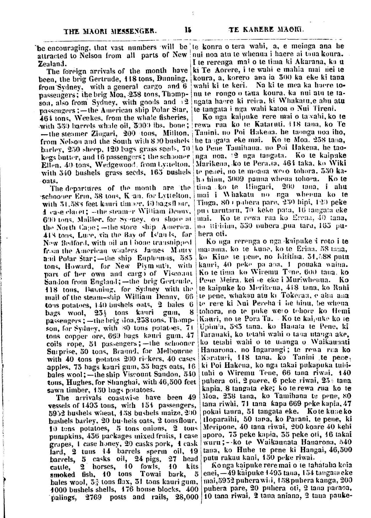 THE MAORI MESSENGER. 15 TE KAKERE MAORI. be encouraging. that vast numbers will be attracted to Nelson from all parts of New Zealand. The foreign arrivals of the month have been, the brig Gertrude, 118 tons, Dunning, from Sydney, with a general cargo and 6 passengers; ihe brig Moa,-238 tons, Thomp- son, also from Sydney, with goods and 2 passengers: —the American ship Polar Star, 46 i tons, Weekes, from the whale fisheries, with 350 barrels whale oil, 3000 lbs bone; —the steamer Zingari, 200 tons, Million. from Nelson and the South with 80 0 bushels barley, 230 sheep, 120 bags grass seeds 70 kegs butter, and 16 passengers; the schooner Ellen. 40 tons, Werdgewood from Lytleton. with 340 bushels grass seeds, 165 bushels oats. The departures of the month are the schooner Erin, 58 tons, K-a; i. (oi" LvlieSlon, wilh 3L5SS feel k:uiri tirn »*r. iO'taJ;sH »iii', i ca^e <*h»iei; —ihe sle;iiii"r Wiiii;nn Dt'im^, 6') t tons, M:u!ler. for *'>> ^nev, o«i slioie ;>« Ill«» N01 t'l Cape; —il»c slore sh:p Amem-a. 41^ tons, Lu."e, vhi ihe H.iv of Is'a'i Is, tor N."w l?cilfor.l, wil!l oil un 1 !to:ie ira'isnipjK'd fr.i;ll the A;nfTi«'aii w.ia!ers Ja'ues Mm«v a-id Poiar ?lar;—ihe ship Euphi'iniis, 5S5 tons, Hovv;lrd, for Neiv PlNniml^i. wiili pan (if lier own and carg) of Visco,uiL San-ion fr«in Ene.:i il.l;—the bri^ Gerli'u?le, 118 tons, 14ihiiiii.?, tor Sydney wil!l ihe inailoflhesle;ini-shir) William Dennv. 66 to'is potatoes, 140 bushels o;ils, 2 bales 6 bcigs wool, 25^ tons kanri ginn, 8 pa^sengers;--ih«l)ri^ uoa,238 ions. riii)nip- ; ?o«i, tor Sy!h^ey, with s0 tons pu'at'»es. 71 tons copper ore, W.) l)a^s kauri gu'.n, 47 coi!s rope, 51 passengers;—ihe si:liooner Sin prise, 50 tons, Biai!«vJ, rir Mel'oourne with 40 tons polutns 200 ri< kers, 40 cases apples, 73 hags kuuri gum, 35 bags oats, 16 bales wool;—ihe ship Viscount Sandon, 5i0 tuns, Hughes, tor Shanghai, with 46,500 feel sawn limber, 150 l)ags potatoes. The arrivals coasl\\\\i^e have been 49 vessels of 1493 tons, wi?n loi passengers, 59)2 bushels wheat, 158 bushels maize, 2i')0 bushels barley. 20 bu'lie!s oats, 2 lonsuour, 10 I«ns potatoes, 5 tons onions, 2 ions pumpkins, 436 packages mixed (rnns, t case grapes, I case hanev, 20 casks pork, 1 cask larii, 2 tuns 14 barrds ?»perm oil, 19 barrels, 5 casks oil, 24 pigs, 27 head calile, 2 horses, 10 fowls, 10 kits smoked fish, 10 tons Towai bark, 5 bales wool, 3.^ tons fhx, 31 tons lcaurigum, 4000 basliels shells, 176 house blocks, 400 palings, 2769 posts and rails, 28,000 te konra o tera walii, a, e meinga ana he nui noa atu lc wlicnua i hacre ai tuia koura. I ie rerenga mai o te U;na ki Akarana, k:i u ki Te Aorere, i te wahi e inah?a mai nei ie koura, a, korero ana ia 300 ka eke ki tana wahi ki te keri. Na Ivi te mea ka huero to» inu ie rongo o taua koura, ka nui atu te ia- S ngata ha"re ki re'na. k< Whakaui,e ahu atu te tangata i nga wahi kaioti o Nui rireni. Ko nga kaipuke rere mai o ta vahi, ko (e i rewa rua ko ie Kataruii. i 18 lam», ko Te jTamni. nu Poi H;ike;i;i. he taonga noa iho, tie ta !ga'a eke mai. Ko ie Moa. 258 la;ia, 1 Ko l*eiie Tamihana, no Poi Hakena, he tao- nga noa, '2 nga tang;ita». Ko te kaipuke ' MarikeiKi, .ko te l*era.ia, 46i taka. ki» Wiki ite pe;iei, no te moana wo«o tohora. 350 ka- jh » himi, 3(t()9 pauna whena loho'-a. Ko te I tima ko te l!ingas-i, 20!» iana, i ahu mai i \\\\ ha ka tu no nga wherua ko te Tinga, 80 » p.tlinr;t pare,, •2*i1) hipi, Ia ) peke Ieni lariit:irn, 7^ keke p;ra, ll) iar^a:a eke 1'.n:ii. Ko te rcw;» ma ko hre:i.'., -^) Lana, i ui» ai 'nin:i, 550 ouhcra .pua taril, 105 pu- ! hera oti. Ko nga reranga o n2a -kaipuke i rrito i te ina'ama, ko ie Kune, koio Eri;i;i. ;^S i;;ka, ki» Kino ie pene, no i.ini?na, ^I,.'.S^ putu kanri, 40 pek" p;» aea, 1 pouaka mahia. Ko te tinia ko Wi;-eniu T---ne. yt»i) tuna. ko Pene Me".ra, kei >e eke i Mur!whenua. Ko te kaipuke ko Mi"rikfiia, 4(8 tana, ko Ruhi ie pene, whakou atu ki Tokerau, <• ahu a;ia te re''e ki hui Pereha i ue hinu, ;K* whena tohora, no te puke \\ve?o tnho«L» ko (i<-mi Iv;«iiri, no ie Pora Ta. Ko te kaituir1 l<.o ie iJpi«u^a, 5S3 i;.na, ko Haiia!a te Pene, ki I'aranaki, ko tetahi walii o la'ia nla'sgi ake. ko tetahi wahi o te Hianga o Wa;kau'iati Hanarona, no Ingarangi; te reia ri:a ko K:«r;ttn'i, 118 tana. ko Tanini .te per.c^ ki Poi Hakona, ko nga takai pukapuka tuhi- tuhi o Wircmu Tene, 66 tana riw;ii. l40 puliera oti. 2 pacre, 6 peke riwai, 23 tana kapia. 8 tangata eke; ko te rewa rua ko te Moa, 238 tana, ko Tamihana te pene, ^0 tana riwai, 71 iana kapa 669 peke kapia, 47 pokai iaura, 51 tangata eke. Koieku:ieko lloparaihi, 50 tana, ko Parani, te pene, ki Meripone, 40 tana mvai, 200 koare 40 kehi aporo, 73 peke kapia, 35 peke oti, 16 takai wuni;--ko ie Waikannala Hanarona, n49 tana, ko Huhe te pene ki Hangai, 46,5UO putu rakau kani, 150 peke riwai. Konga kaipuke reremai o (e tahataha keia enei,—49 kaipuke 1493 taua, 154targai;ieke mai,5932 puhcrawi;j, l.')&puhcra kanga, 200 puhera pare, 20 p«ihcra oti, 2 tana paraoa, 10 tana riwai, 2 iana aniana, 2 taua pauke-