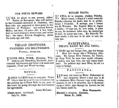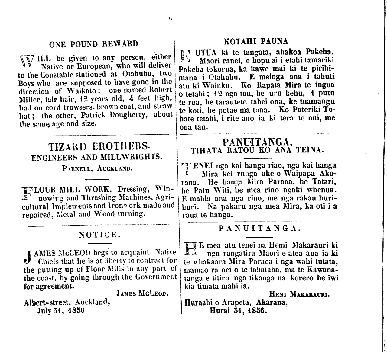 ONE POUND REWARD WILL be given to any person, either Native or European, who will deliver to the Constable stationed at Otahuhu, two Boys who are supposed to have gone in the direction of Waikato: one named Robert Miller, fair hair, 12 years old, 4 Feet high, had on cord trowsers. brown coat, and straw hat; the other, Patrick Dougherty, about the same age and size. TIZARD BROTHERS. ENGINEERS AND MILLWRIGHTS. PARNELL, AUCKLAND. FLOUR MILL WORK, Dressing, Win- nowirg and Thrashing Machines, Agri- cultural Implements and lronwork made and repaired, Metal and Wood turning. NOTICE. JAMES McLEOD begs to acquaint Native Chiefs that he is at liberty to contract for the putting up of Flour Mills in any part of the coast, by going through the Government for agreement. JAMES MCLEOD. Albert-street, Auckland, July 51, 1856. KOTAHI PAUNA E UTUA ki te tangata, ahakoa Pakeha, Maori ranei, e hopu ai i etahi tamariki Pakeha tokorua, ka kawe mai ki te pirihi- mana i Otahuhu. E meinga ana i tahuti am ki Wai u ku. Ko Rapata Mira te ingoa o tetahi; 12 nga tau, he uru kehu, 4 putu te roa, he tarautete tahei ona, ke mamangu te koti, he potae ma tona. Ko Pateriki To- hate tetahi, i rite ano ia ki tera te nui, me ona tau. PANUITANGA, TIHATA RATOU KO ANA TEINA. TENEI nga kai hanga nao, nga kai hanga Mira kei runga ake o Waipapa Aka- rana. He hanga Mira Paraoa, he Tatari, he Patu Witi, he mea rino ngaki whenua. E mahia ana nga rino, me nga rakau huri- huri. Na pakaru nga mea Mira, ka oti i a raua te hanga. PANUITANGA. HE mea atu tenei na Hemi Makarauri ki nga rangatira Maori e atea aua ia ki te whakaara Mira Paraoa i nga wahi tutata, mamao ra nei o te tahataha, ma te Kawana- tanga e titiro nga tikanga na korero he iwi kia timata mahi ia. HEMI MAKARAURI. Huraahi o Arapeta. Akarana, Hurai 31, 1856.