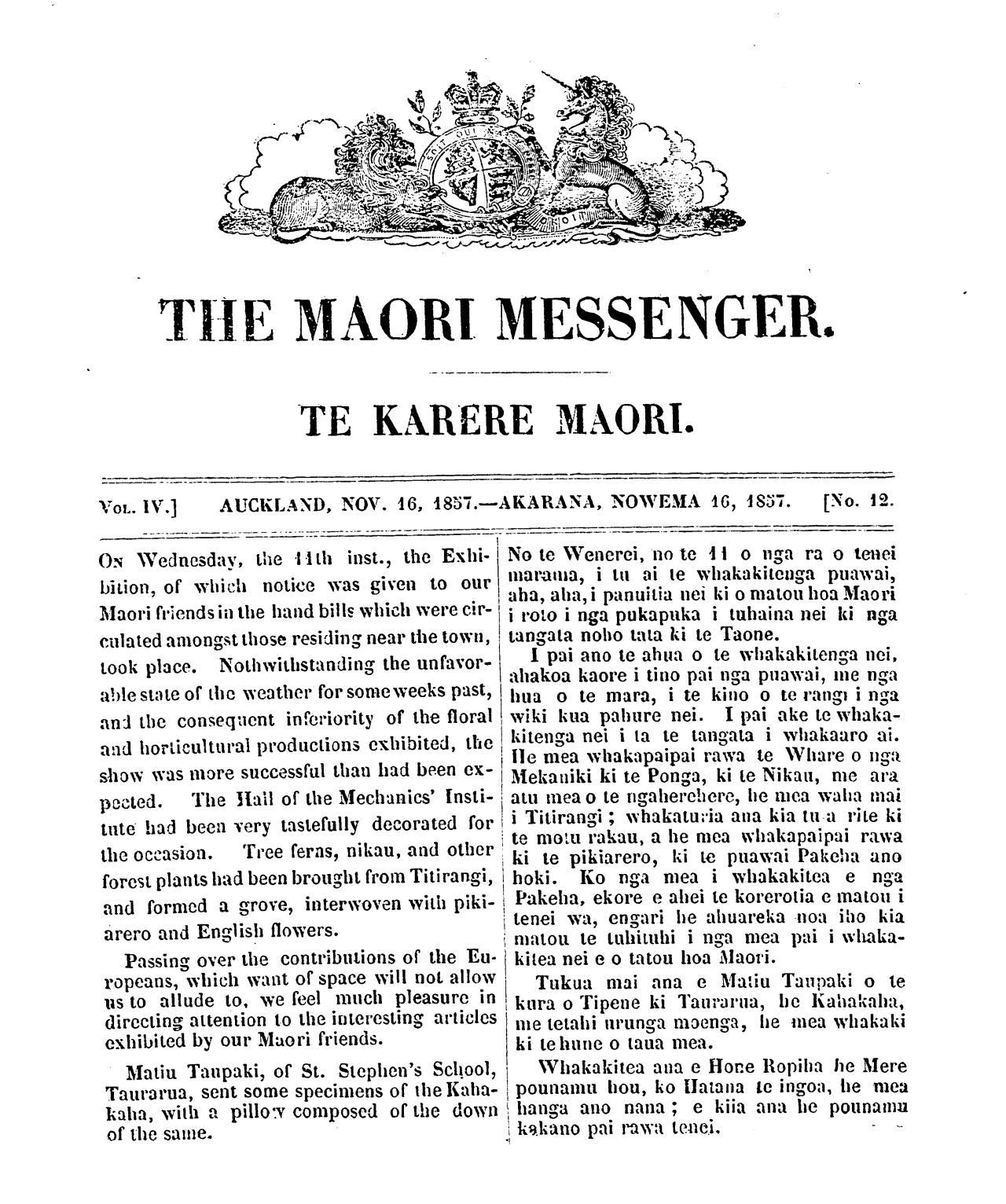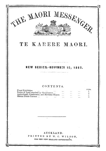 The Maori Messenger - Ko te Karere Maori 1855-1860: Volume 4, Number 12. 16 November 1857 |