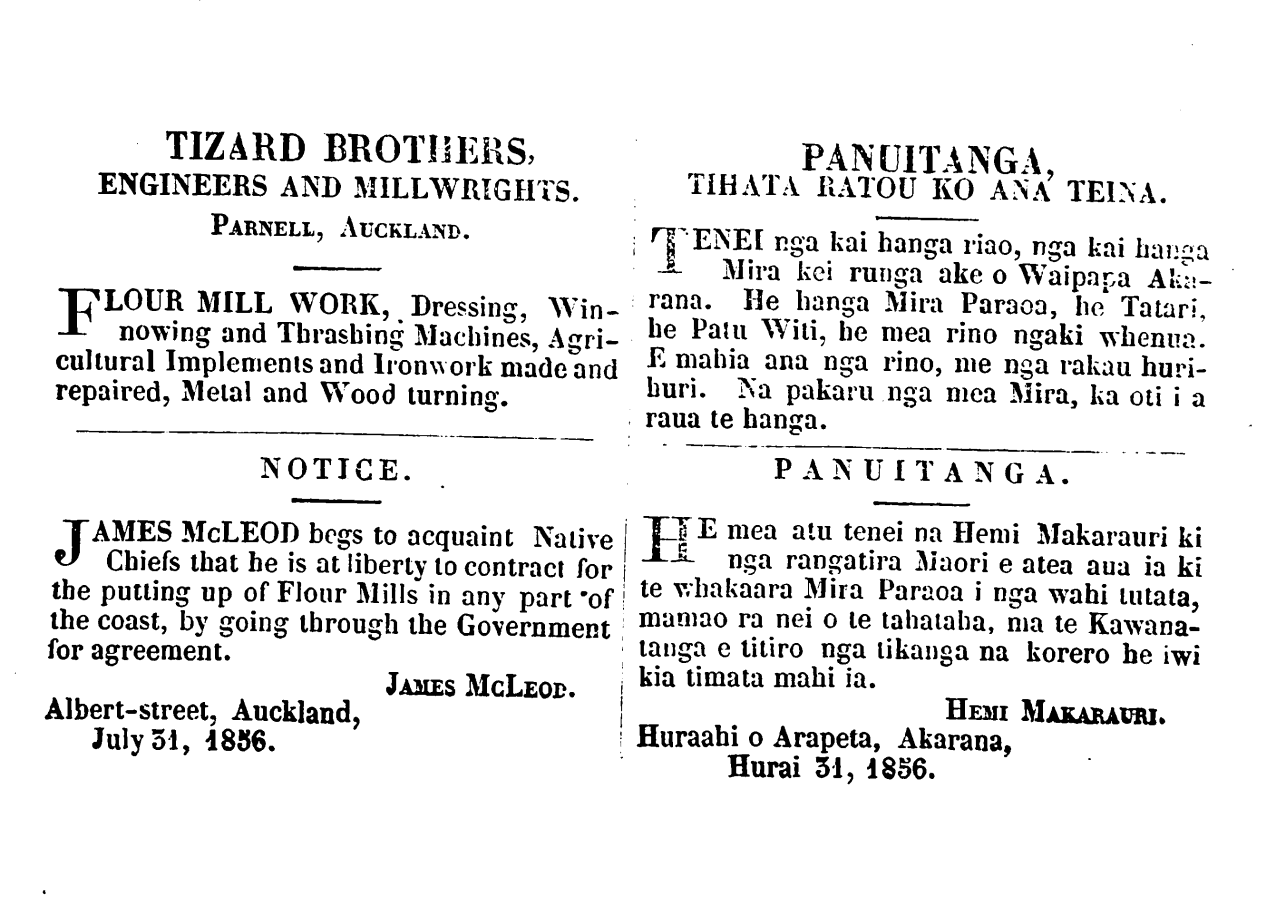 TIZARD BROTHERS, ENGINEERS AND MILLWRIGHTS. PARNELL, AUCKLAND. FLOUR MILL WORK, Dressing, Win- nowing and Thrashing Machines, Agri-cultural Implements and Ironwork made and repaired, Metal and Wood turning. NOTICE. TAMES McLEOD begs to acquaint Native Chiefs that he is at liberty to contract for i the putting up of Flour Mills in any part of the coast, by going through the Government for agreement. JAMES MCLEOD. | Albert-street, Auckland, July 31, 1856. PANUITANGA, TIHATA RATOU KO ANA TEINA. TENEI nga kai hanga riao, nga kai hanga Mira kei runga ake o Waipapa Aka-rana. He hanga Mira Paraoa, he Tatari, he Patu Witi, he mea rino ngaki whenua. E mahia ana nga rino, me nga rakau huri-huri. Na pakaru nga mea Mira, ka oti i a raua te hanga. PANUITANGA. HE mea atu tenei na Hemi Makarauri ki nga rangatira Maori e atea aua ia ki te whakaara Mira Paraoa i nga wahi tutata, mamao ra nei o le tahataha, ma te Kawana-tanga e titiro nga tikanga na korero he iwi kia timata mahi ia. HEMI MAKARAURI. Huraahi o Arapeta, Akarana, Hurai 31, 1856.
