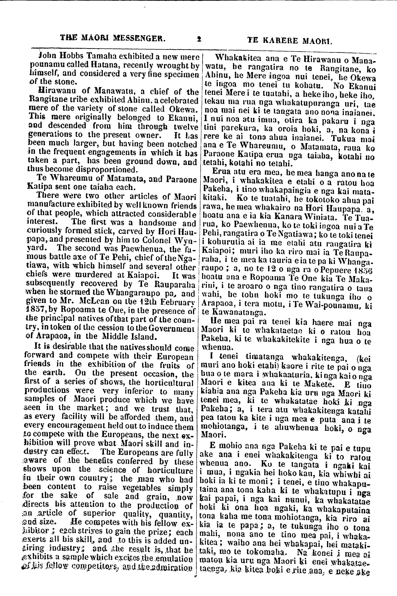 THE MAORI MESSENGER. i TE KARERE MAORI, John Hobbs Tamana exhibited a new mere pounamu called Hatana, recently wrought by himself, and considered a very fine specimen of the stone. Hirawanu of Manawatu, a chief of the Rangitane tribe exhibited Ahinu, a celebrated mere of the variety of stone called Okewa. This mere originally belonged to Ekanui, and descended from him through twelve generations to the present owner. It Las been much larger, but having been notched in the frequent engagements in which U has taken a part, has been ground down, and thus become disproportioned. Te Whareumu of Matamata, and Paraone Katipa sent one taiaha each. There were two other articles of Maori manufacture exhibited by well known friends of that people, which attracted considerable interest. The first was a handsome and curiously formed stick, carved by Hori Hau-papa, and presented by him to Colonel Wyn-yard. The second was Paewhenua, the fa-mous battle axe of Te Pehi, chief of the Nga-tiawa, with which himself and several other chiefs were murdered at Kaiapei. It was subsequently recovered by Te Rauparaha when he stormed the Whangaraupo pa, and given to Mr. McLean on the 12th February 1857, by Ropoama Le One, in the presence of the principal natives of that part of the coun-try, in token oi the cession to the Government of Arapaoa, in the Middle Island. It is desirable that the natives should conse forward and compete with their European friends in the exhibition of the fruits of the earth. On the present occasion, the first of a series of shows, the horticultural productions were very inferior to many samples of Maori produce which we have seen in the market; and we trust that, as every facility will be afforded them, and every encouragement held out to induce them io compete with the Europeans, the next ex-hibition will prove what Maori skill and in-dustry can effect. The Europeans are fully aware of the benefits conferred by these shows upon the science of horticulture in their own country; the man who had been content to raise vegetables simply for the sake of sale and grain, now directs bis attention to the production of an .article of superior quality, quantity, and size. He competes with his fellow ex-hibitor; each strives to gain the prize; each exerts all bis skill, and to this is added un-tiring industry; and the result is, that ne exhibits a sample which excites .the emulation of his fellow competitors, and the admiration *Whakakitea ana e Te Hirawanu o Mana-watu, he rangatira no te Rangitane, ko Ahinu, Ue Mere ingoa nui tenei, he Okewa te ingoa mo tenei tu kohatu. No Ekanui Ienei Mere i te tuatahi, a heke iho, heke iho, tekau ma rua nga whakatupuranga uri, tae noa mai nei ki te tangata ano nona inaianei. 1 nui noa atu imua, otira ka pakaru i nga tini parekura, ka oroia hoki, a, na kona i rere ke ai tono ahua inaianei. Tukua mai ana e Te Whareumu, o Matamata, raua ko Paraone Katipa erua nga taiaha, kotahi no tetahi, kotahi no tetahi. Erua atu era mea, he mea hanga ano na te Maori, i whakakitea e etahi o a ratou hoa Pakeha, i tino whakapaingia e nga kai mata-kitaki. Ko te tuatahi, he tokotoko ahua pai rawa, he mea whakairo na Hori Haupapa: a, hoatu ana e ia kia Kanara Winiata. Te Tua-rua, ko Paewhenua, ko te toki ingoa nui a Te Pehi, rangatira o Te Ngatiawa ; ko te toki tenei i kohurutia ai ia me etahi atu rangatira ki Kaiapoi; muri iho ka riro mai ia Te Raupa-raha, i te mea ka tauria e ia te pa ki Whanga-raupo ; a, no te 12 o nga ra o Pepuere 1856 hoatu ana e Ropoama Te One kia Te Maka-rini, i te aroaro o nga tino rangatira o taua wahi, he tohu hoki mo te tukunga iho o Arapaoa, i tera motu, i Te Wai-pounamu, ki te Kawanatanga. He mea pai ra tenei kia haere mai nga Maori ki te whakataetae ki o ratou hoa Pakeha, ki te whakakitekite i nga hua o te whenua. I tenei timatanga whakakitenga, (kei muri ano hoki etahi) kaore i rite te pai o nga hua o te mara i whakaaturia, ki nga kai o nga Maori e kitea ana ki te Makete. E tino kiahia ana nga Pakeha kia uru nga Maori ki tenei mea, ki te whakatatae hoki ki nga Pakeha; a, i tera atu whakakitenga katahi pea tatou ka kite i nga mea e puta ana i te mohiotanga, i te ahuwhenua hoki, o nga Maori. E mohio ana nga Pakeha ki te pai e tupu ake ana i enei whakakitenga ki to ratou whenua ano. Ko te tangata i ngaki kai i mua, i ngakia hei hoko kau, kia whiwhi ai hoki ia ki te moni ; i tenei, e tino whakapu-taina ana tona kaha ki te whakatupu i nga kai papai, i nga kai nunui, ka whakatatae hoki U ona hoa ngaki, ka whakaputaina tona kaha me tona mohiotanga, kia riro ai kia ia le papa; a, te tukunga iho o tona mahi, nona ano te tino mea pai, i whaka-kitea ; waiho ana hei whakapai, hei mataki-taki, mo te tokomaha. Na konei i mea ai matou kia uru nga Maori ki enei whakatae-taenga, kia kitea hoki e rite ana. e neke ake