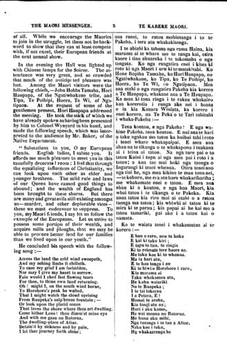 THE MAORI MESSENGER. 3 TE KARERE MAORI, of all. While we encourage the Maories ro join in the struggle, let them not be back-ward to show that they can at least compete with, if not excel, their European friends at the next annual show^ In the evening the Hall was lighted up with Chinese lamps for the Soiree. The at-tendance was very great, and so crowded that much of the an anticipated pleasure was lost. Among the Maori visitors were the following chiefs, — John Hobbs Tamana, Hori Haupapa, of the Ngatiwhakaue tribe, and Tipa, Te Poihipi, Hoera, Te Wi, of Nga-tipaoa. At the request of some of the gentlemen present. Hori Haupapa addressed the meeting. He took the stick of which we have already spoken as having been presented by him to Colonel Wynyard in his hand, and made the following speech, which was inter-preted to the audience by Mr. Baker, of the Native Department. " Salutations to you, O my European friends. English ladies, [ salute you. It affords roe much pleasure to meet you in this tastefully decorated room : I feel that through the equalizing influences of Christianity, we can look upon each other as elder and younger brethren. The mild rule and laws of our Queen have caused good things to abound; and the wealth of England has been brought to these shores. But there are many and great evils still existing amongst us— murder, and other deplorable vices -these we must endeavour to suppress. To you, my Maori friends, I say let us follow the example of the Europeans. Let us strive to possess some portion of their wealth, and acquire mills and ploughs, that we may be able to procure better food for our families than we lived upon in our youth.." He concluded his speech with the follow-ing song :— Across the land the cold wind sweepeth. And my aching limbs it chilleth. To ease my grief I am forbidden, Nor may I give my heart to sorrow. Fain would 1 shed fast flowing tears For thee, to thine own land returning. Oh ! might I, on the south wind borne, To Horohoro's peak be wafted, That 1 might watch the cloud uprising From Ruapeka's sulp'hrous fountain; — Or look upon the placid ocean That laves the shore where thou art dwelling.. Come hither Love ! thou dimm'st mine eye And with me gaze on Rotorua The dwelling-place of Atiue. Detain'd by sickness and by pain, 1 let thee journey forth alone ;ana ranei, to ratou mohiotanga i to te Pakeha, i tera atu whakakitenga. I te ahiahi ka tahuna nga rama Haina, kia marama ai te whare mo te tunga kai, otira kaore i tino ahuareka i te tokomaha o nga tangata. Ko nga rangatira enei i kitea ki roto ki nga Maori i uru ki te mataki tahi. Ko Hone Ropiha Tamaha, ko Hori Haupapa, no Ngatiwhakaue, ko Tipa, ko Te Poihipi, ka Hoera, ko Te Wi, no Ngatipaoa. Mea ana etahi o nga rangatira Pakeha kia korero a Te Haupapa, whakaae ana a Te Haupapa. Ka mau ki tona ringa i te rakau whakairo kua korerotia i runga ake nei i hoatu e ia kia Kanara Winiata, ka korero i enei korero, na Te Peka' o te Tari tuhituhi i whaka-Pakeha : — Tena koutou, e nga Pakeha ! E nga wa-hine Pakeha, tena koutou. E nui ana te hari o taku ngakau mo tatou ka huihui tahi i roto i tenei whare whakapaipai. E mea ana ahau na te tikanga o te whakapono i tuakana ai i teina ai tatou. Na nga ture pai o to tatou Kuini i tupu ai nga mea pai i roto i a tatou; a kua tae mai hoki nga taonga o Ingarangi ki tenei whenua. Otira tenei ano nga lini he, nga mea kikino te mau tonu nei, — te kohuru, me era atu hara whakarihariha ; me whakamate enei e tatou. E mea ana ahau ki a koutou, e nga hoa Maori, kia whai tatou i te tikanga o te Pakeka. Kia uaua tatou kia riro mai ai etahi o a ratou taonga ma tatou ; kia whiwhi ai tatou ki le mira ki te parau ; kia papai ai he kai mo a tatou tamariki, pai ake i a tatou kai a namata. Ko le waiata tenei i whakamutua ai te korero : — E hau o raro, nou te huka E kai ki taku kiri ; E tapu to tira, te ringia Ki te roimata tere haere na. Ble tuku koe ki to whenua. Ma (a hari atu, E te hau tonga i au Ki le hiwi o Horohoro i raro* Kia marama ai Taka whakamoa atu, He kohu waiariki No te Rua peka ; I te tai tokerau 1 a Petera, E 1 Homai te aroha,. Kia tangi atu au ; Huri i aku kamo,. He wai moana no Rotoroa. Me huna aku mihi, Nga turanga i te Iau a Atine. | Naku koe i tuku, i He whakaaronga he