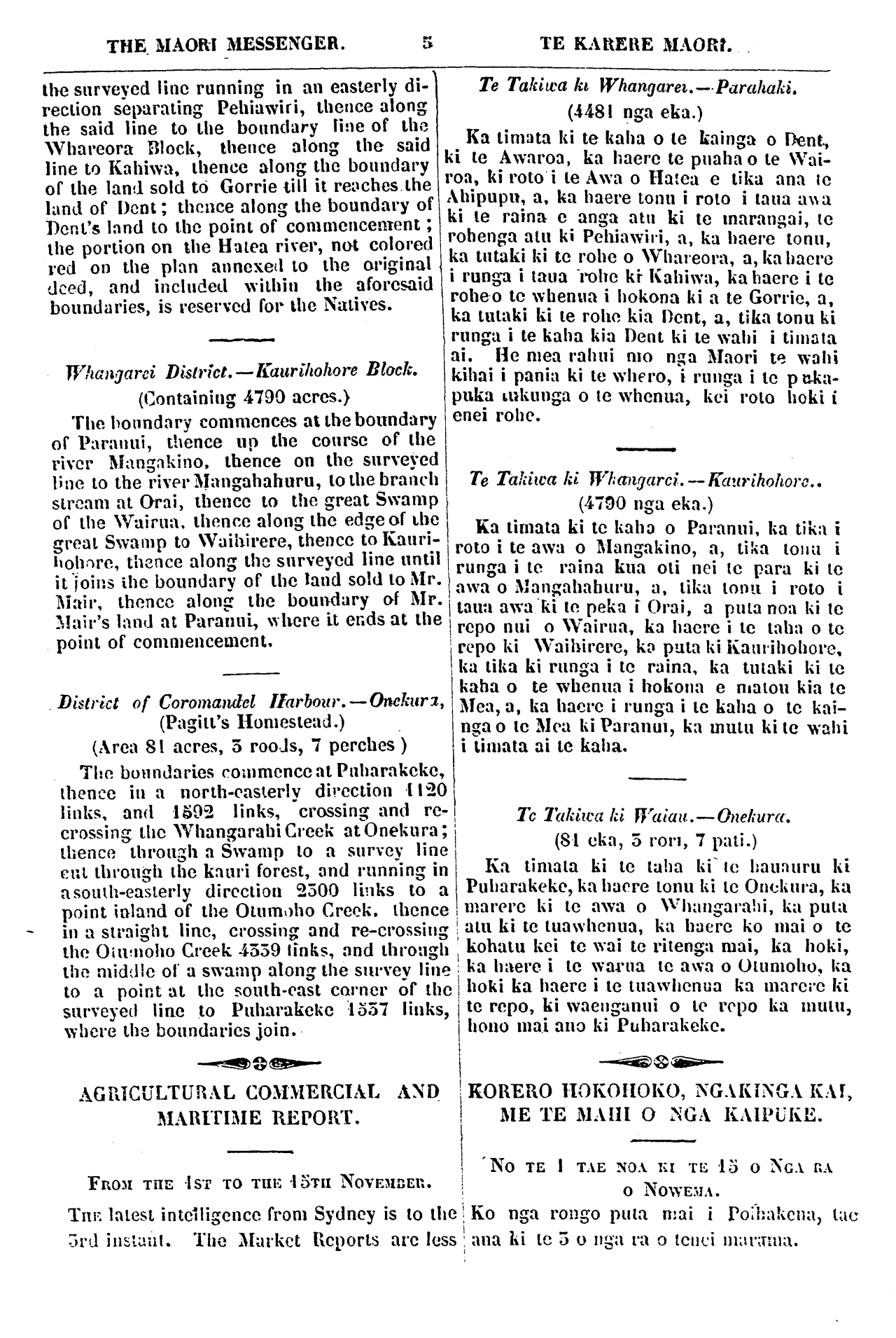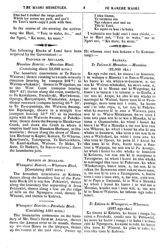 THE MAORI MESSENGER. 5 TE KAUERE MAORI the surveyed line running in an easterly di-rection separating Pehiawiri, thence along the said line to the boundary line of the Whareora Block, thence along the said line to Kahiwa, thence along the boundary of the land sold to Gorrie till it reaches the land of Dent ; thence along the boundary of Dent's land to the point of commencement ; the portion on the Hatea river, not colored red on the plan annexed to the original deed, and included within the aforesaid boundaries, is reserved for the Natives. Whangarei District,— Kaurihohore Black. (Containing 4790 acres.) The boundary commences at the boundary of Paranui, thence up the course of the river Mangakino, thence on the surveyed line to the river Mangahahuru, to the branch stream at Orai, thence to the great Swamp of the Wairua, thence along the edge of ihe great Swamp to Waihirere, thence to Kauri-hohore, thence along the surveyed line until it joins ihe boundary of the land sold to Mr. Mair, thence along the boundary of Mr. Mair's land at Paranui, where it ends at the point of commencement. District of Coromandel Harbour. — Onekura, (Pagitt's Homestead.) (Area 81 acres, o roods, 7 perches ) The boundaries commence al Puharakeke, thence iu a north-easterly direction 1120 links, and 1592 links, "crossing and re-crossing the Whangarahi Creek at Onekura; thence through a Swamp to a survey line out through the kauri forest, and running in a south-easterly direction 2500 links to a point inland of the Otumoho Creek, thence in a straight line, crossing and re-crossing the Otumohoh Creek 4559 Iinks, and through the middle of a swamp along the survey line to a point at the south-east corner of the surveyed line to Puharakeke 1557 links, where the boundaries join. AGRICULTURAL COMMERCIAL AND MARITIME REPORT. FROM THE 1ST TO THE 15TH NOVEMBER. THE latest intelligence from Sydney is to the 3rd instant. The Market Reports arc IessTe Takitea ki Whangarei.— Parahaki. (4481 nga eka.) Ka timata ki te kaha o le kainga o Dent, i le Awaroa, ka haere le puaha o le Wai-oa, ki roto' i te Awa o Hatea e tika ana te Ahipupu, a, ka haere tonu i roto i taua awa ti le raina e anga atu ki le marangai, le rohenga atu ki Pehiawiri, a, ka haere tonu, ia tutaki ki te rohe o Whareora, a, ka haere i runga i taua rohe ki Kahiwa, ka haere i le rohe o te whenua i hokona ki a te Gorrie, a, ka tutaki ki te rohe kia Dent, a, tika tonu ki runga i te kaha kia Dent ki te wahi i timata ai. He mea rahui mo nga Maori te wahi kihai i pania ki le whero, i runga i te puka-puka tukunga o te whenua, kei roto hoki i enei rohe. Te Takiwa ki Whangarei. — Kaurihohore. (4790 nga eka.) Ka timata ki te kaha o Paranui, ka tika i roto i te awa o Mangakino, a, Uka tonu i runga i le raina kua oti nei te para ki te awa o Mangahahuru, a, tika tonu i roto i taua awa ki le peka i Orai, a puta noa ki te repo nui o Wairua, ka haere i te taha o te repo ki Waihirere, ka puta ki Kaurihohore, ka tika ki runga i te raina, ka tutaki ki te kaha o te whenua i hokona e matou kia le Mea, a, ka haere i runga i le kaha o te kai-nga o te Mea ki Paranui, ka mutu kite wahi i timata ai te kaha. Te Takiwa ki Waiau. — Onekura. \\ (81 eka, o ron, 7 pati.) Ka timata ki te taha ki le hauauru ki Puharakeke, ka haere tonu ki te Onekura, ka marere ki te awa o Whangarahi, ka puta i am ki le tuawhenua, ka haere ko mai o le kohatu kei le wai le ritenga mai, ka hoki, ! ka haere i te warua te awa o Otumoho, ka i hoki ka haere i le tuawhenua ka marere ki le repo, ki waenganui o le repo ka mutu, hono mai ano ki Puharakeke. KORERO HOKOHOKO, NGAKINGA KAI, ME TE MAHI O NGA KAIPUKE. NO TE 1 TAE NOA KITE 15 O NGA RA i o NOWEMA. Ko nga rongo puta mai i Poihakena, tae ana ki le 5 o nga ra o tenei marama.