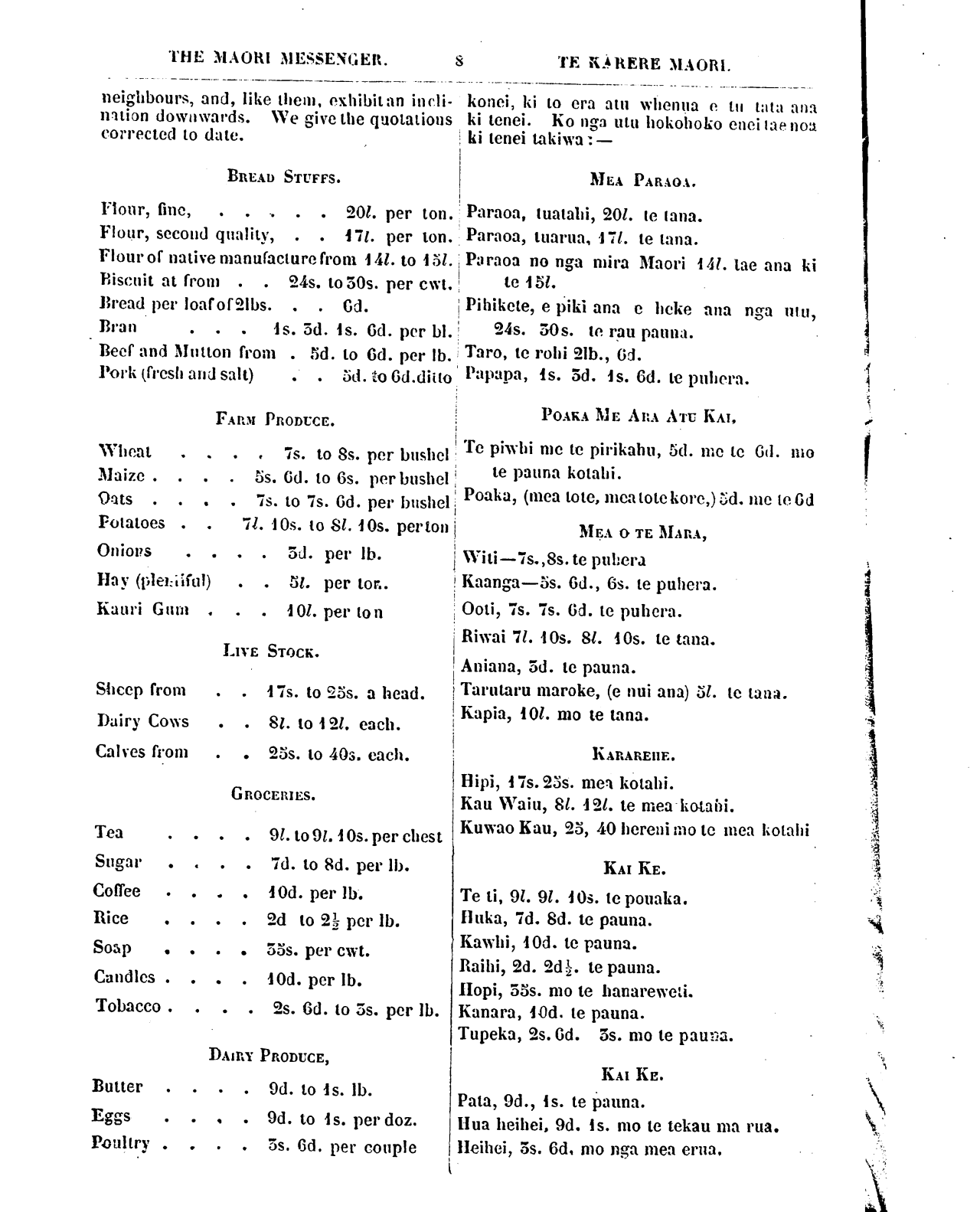 THE MAORl MESSENGER. 8 TE KARERE MAORl. BREAD STUFFS FARM PRODUCE LIVE STOCK GROCERIES DAIRY PRODUCE MEA PARAOA POAKA ME ARA ATU KAI MEA O TE MARA KARAREHE KAI KE