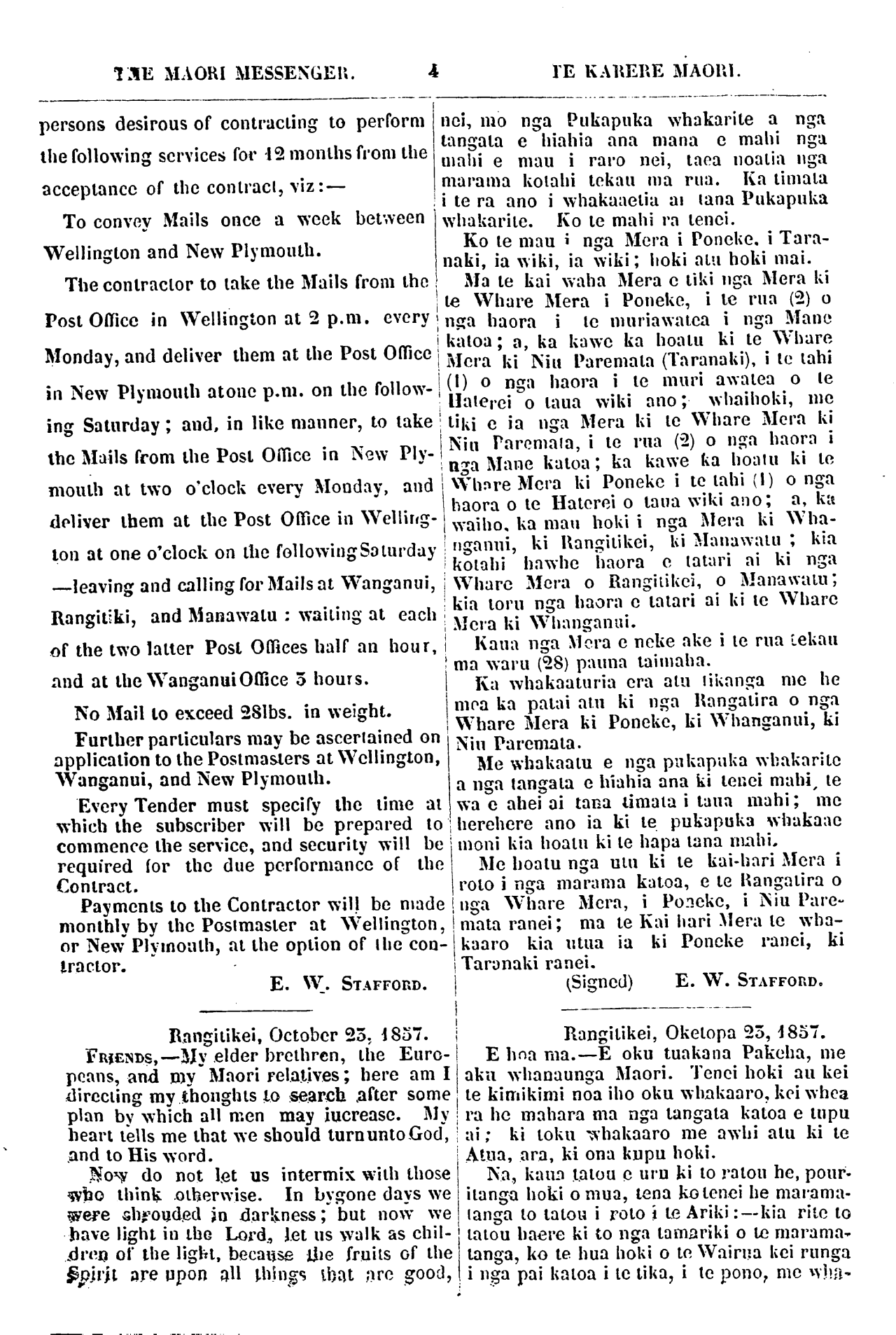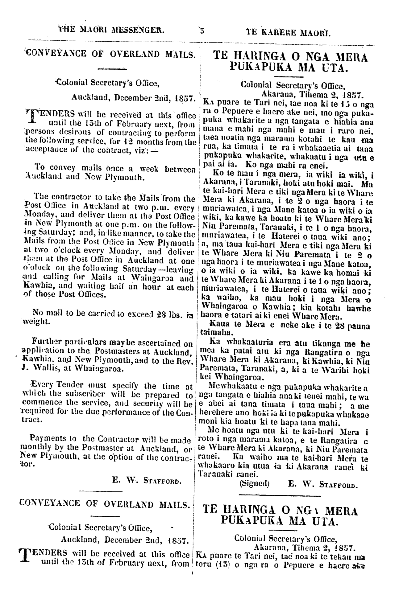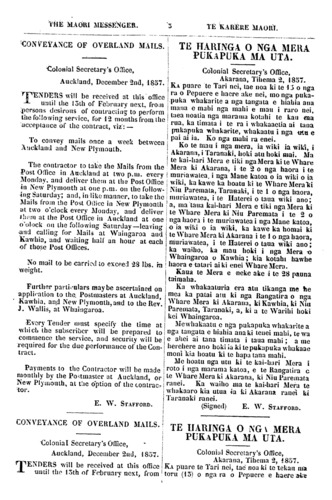 THE MAORI MESSENGER. 3 TE KARERE MAORI. CONVEYANCE OF OVERLANDS MAILS Auckland New Plymouth Waingaroa Kawhia Rev. J. Wallis Whaingaroa E. W. STAFFORD TE HARINGA O NGA MERA PUKAPUKA MA UTA Akarana Taranaki