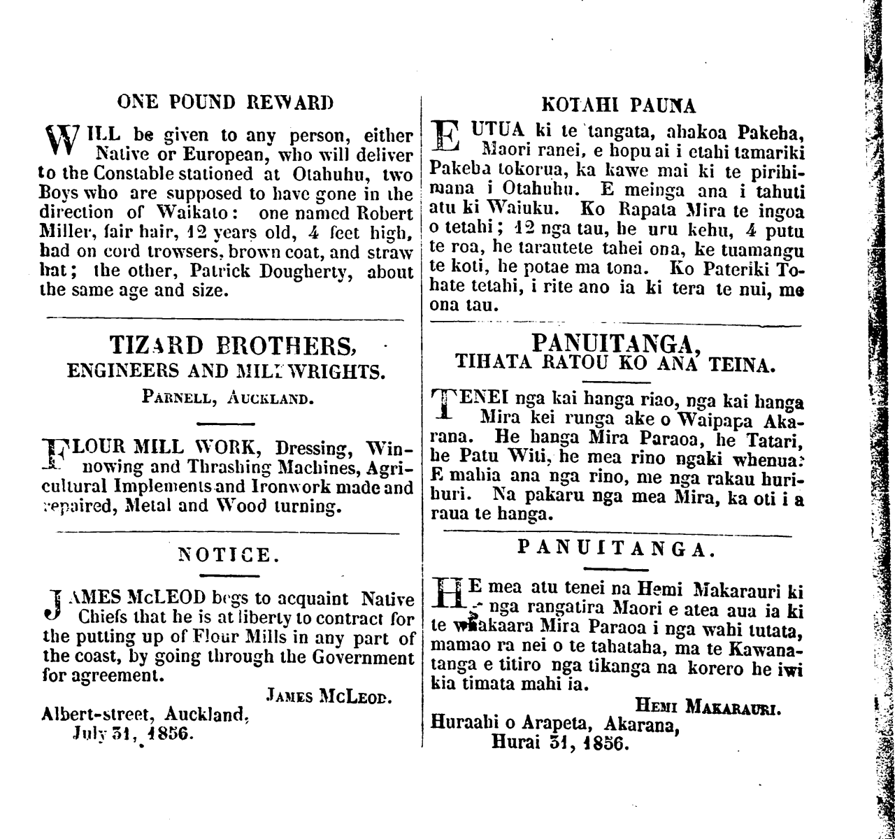 ONE POUND REWARD WILL be given to any person, either Native or European, who will deliver to the Constable stationed at Otahuhu, two Boys who are supposed to have gone in the direction of Waikato: one named Robert Miller, fair hair, 12 years old, 4 feet high, had on cord trowsers, brown coat, and straw hat; the other, Patrick Dougherty, about them same age and size. TIZARD BROTHERS, ENGINEERS AND MILLWRIGHTS. PARNELL, AUCKLAND. FLOUR MILL WORK, Dressing, Win- nowing and Thrashing Machines, Agri- cultural Implements and Ironwork made and repaired, Metal and Wood turning. NOTICE. JAMES McLEOD begs to acquaint Native Chiefs that he is at liberty to contracr for the putting up of Flour Mills in any part of the coast, by going through the Government for agreement. JAMES MCLEOD. Albert-street, Auckland July 31, 1856. KOTAHI PAUNA E UTUA ki te tangata, ahakoa Pakeha, Maori ranei, e hopu ai i etahi tamariki Pakeha tokorua, ka kawe mai ki te pirihi- mana i Otahuhu. E meinga ana i tahuti atu ki Waiuku. Ko Rapata Mira te ingoa o tetahi; 12 nga tau, he uru kehu, 4 putu te roa, he tarautete tahei ona, ke tuamangu te koti, he potae ma tona. Ko Pateriki To- hate tetahi, i rite ano ia ki tera te nui, ma ona tau. PANUITANGA, TIHATA RATOU KO ANA TEINA. TENEI nga kai hanga riao, nga kai hanga Mira kei runga ake o Waipapa Aka- rana. He hanga Mira Paraoa, he Tatari, he Patu Witi, he mea rino ngaki whenua; E mahia ana nga rino, me nga rakau huri- huri. Na pakaru nga mea Mira, ka oti i a raua te hanga. PANUITANGA. HE mea atu tenei na Hemi Makarauri ki nga rangatira Maori e atea aua ia ki te whakaara Mira Paraoa i nga wahi tutata, mamao ra nei o te tahataha, ma te Kawana- tanga e titiro nga tikanga na korero he iwi kia timata mahi ia. HEMI MAKAKAURI. Huraahi o Arapeta, Akarana, Hurai 31, 1856.