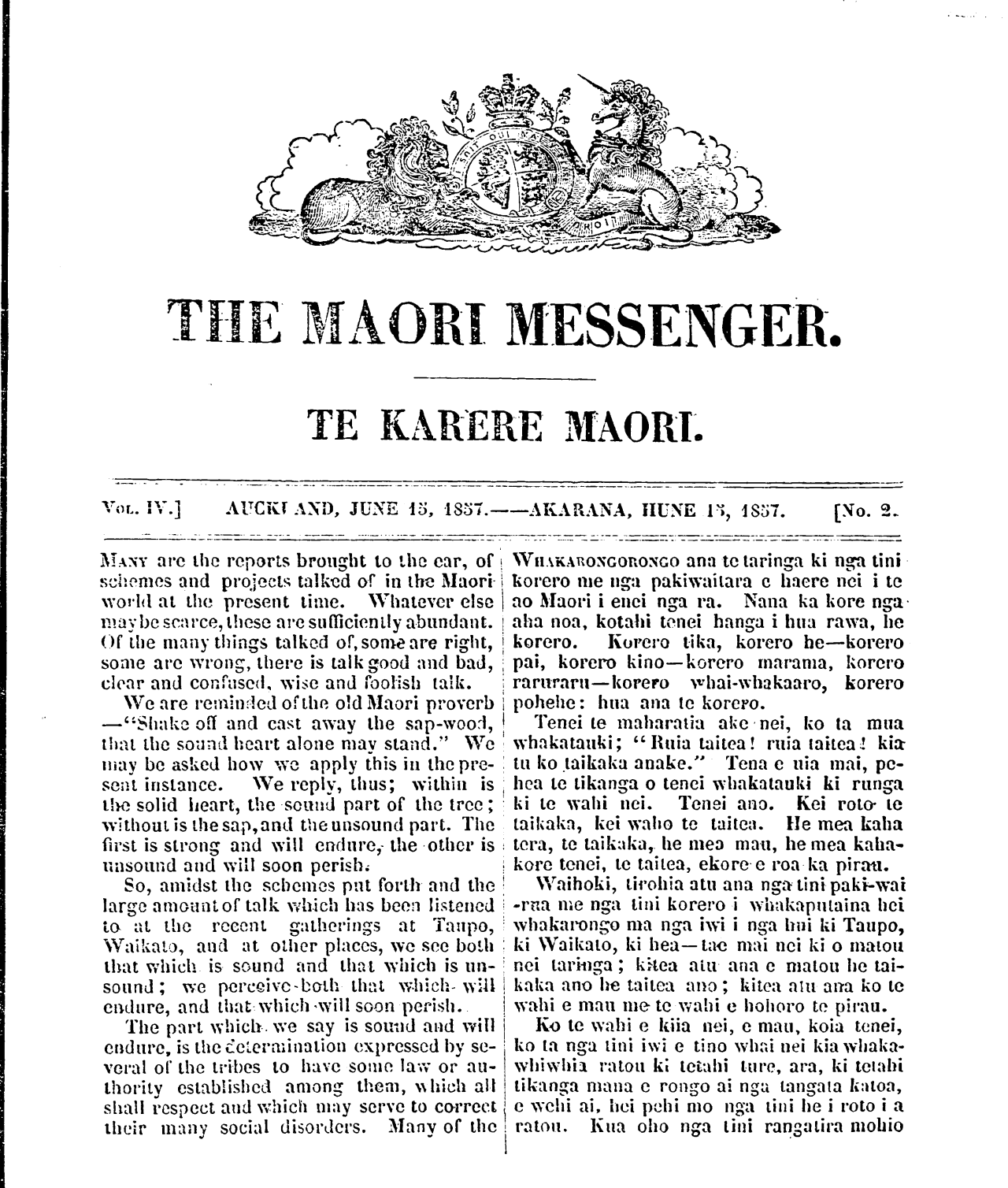 The Maori Messenger - Ko te Karere Maori 1855-1860: Volume 4, Number 2. 15 June 1857 |