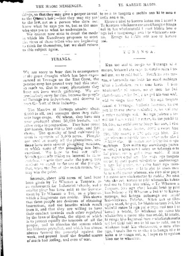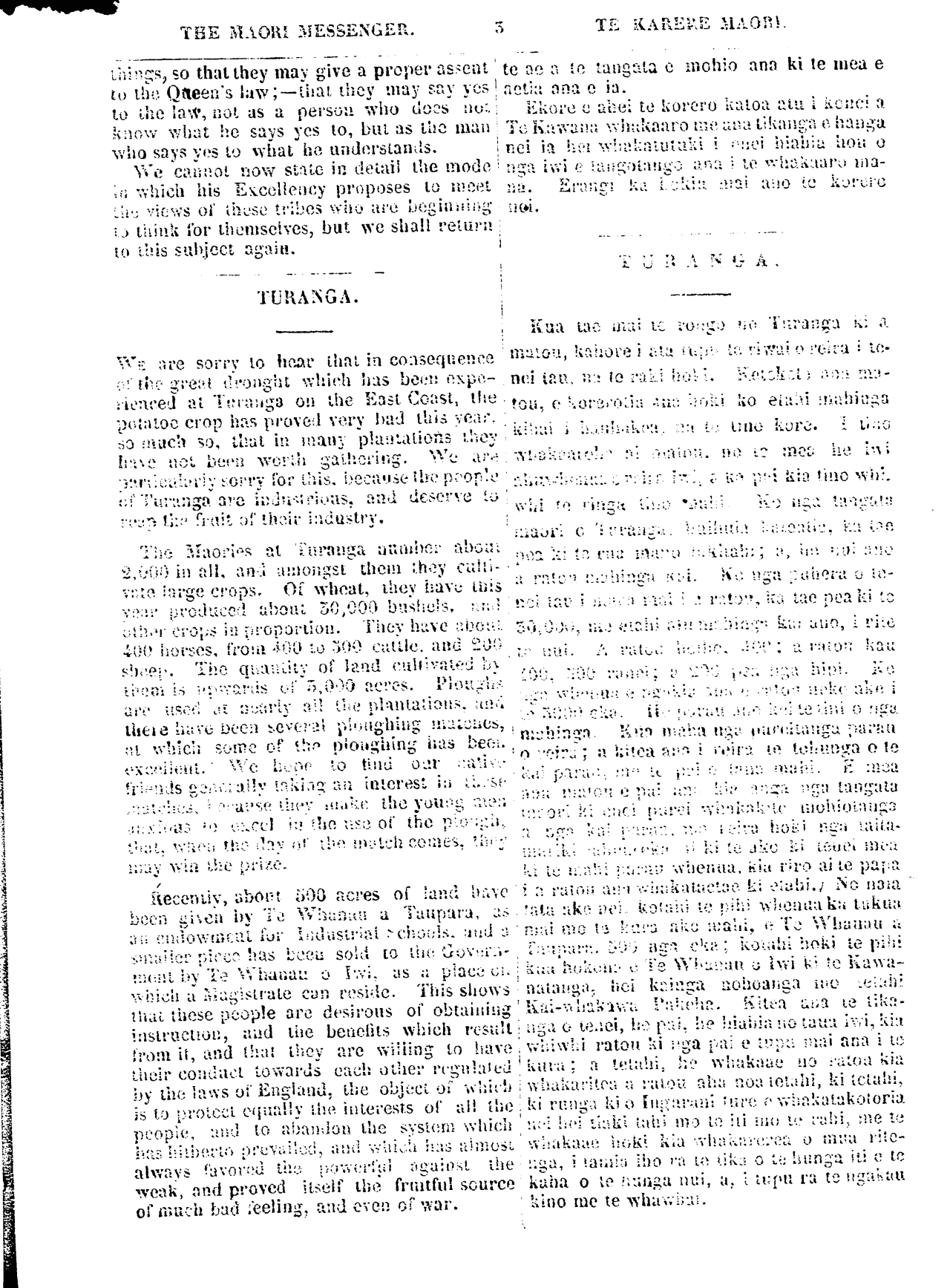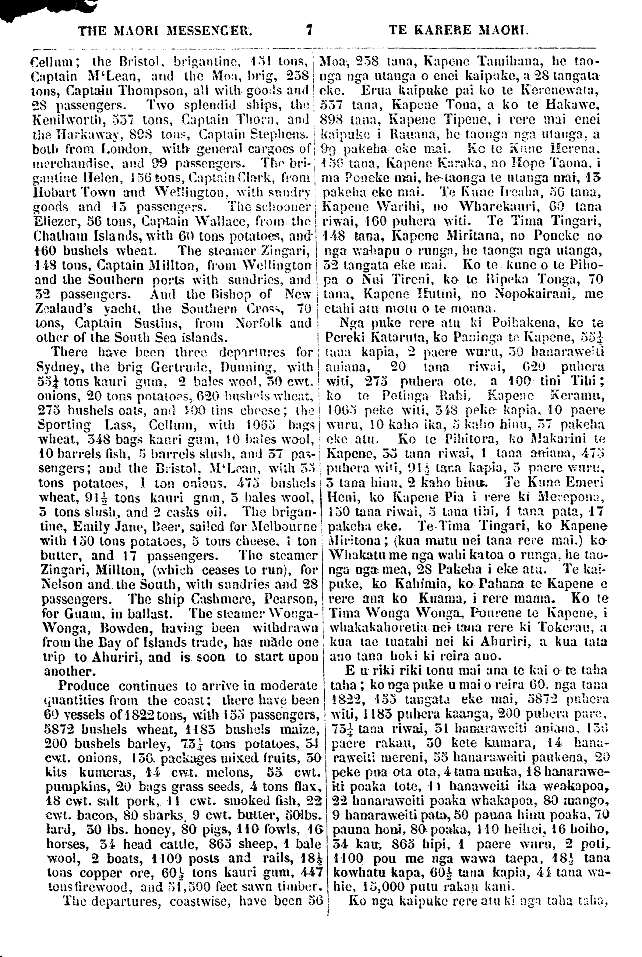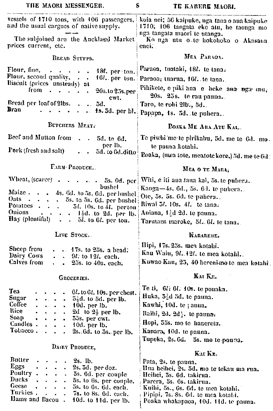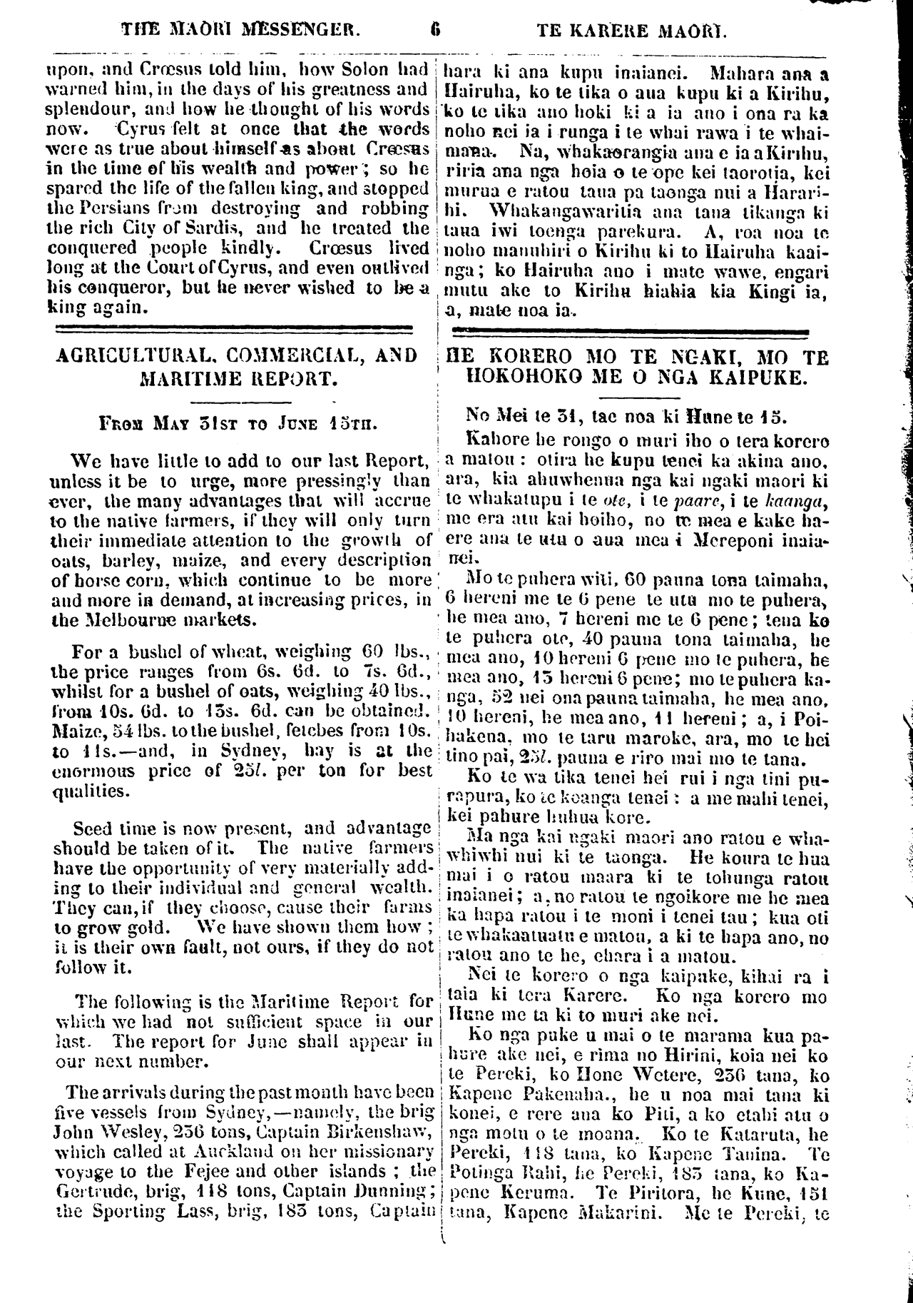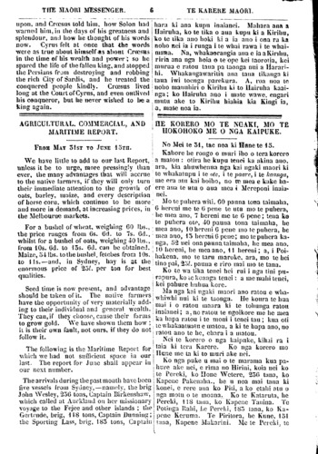 THE MAORI MESSENGER, 6 TE KARERE MAORI. upon, and Croesus told him, how Solon had warned him, in the clays of his greatness and splendour, and how he thought of his words now. Cyrus felt at once that the words were as true about himself as about Croesus in them time of his wealth and power; so he spared the life of the fallen king, and stopped them Persians from destroying and robbing the rich City of Sardis, and he treated the conquered people kindly. Croesus lived long at the Court of Cyrus, and even outlived his conqueror, but he never wished to be a king again. AGRICULTURAL, COMMERCIAL, AND MARITIME REPORT. FROM MAY 31ST TO JUNE 15TH. We have little to add to our last Report, unless it be to urge, more pressingly than ever, the many advantages that will accrue to the native farmers, if they will only turn their immediate attention to the growth of oats, barley, maize., and every description of horse corn, which continue to be more and more in demand, at increasing prices, in them Melbourne markets. For a bushel of wheat, weighing 60 Ibs., the price ranges from 6s. 6d. to 7s. 6d., whilst for a bushel of oats, weighing 40 Ibs., rora 10s. 6d. to 13s. 6d. can he obtained. Maize, 54 Ibs. to the bushel, fetches from 10s. to 11s. and, in Sydney, hay is at the enormous price of 231 per ton for best qualities. Seed lime is now present, and advantage should be taken of it. The native farmers have them opportunity of very materially add- ing to their individual and general wealth. They can, if they choose, cause their farms to grow gold. We have shown them how it is their own fault, not ours, if they do not follow it. The following is them Maritime Report for which we had not sufficient; space in our last- The report for June shall appear in our next number. The arrivals during the past month have been live vessels from Sydney,— namely, the brig John Wesley, 256 tons, Captain Birkenshaw, which called at Auckland on her missionary voyage to the Fejee and other islands the Gertrude , brig, 118 tons, Captain Dunning; the Sporting Lass, brig, 183 tons, Captain hara ki ana kupu inaianei. Mahara ana a Hairuha, ko te tika o aua kupu ki a Kirihu, ko te tika ano hoki ki a ia ano i ona ra ka noho nei ia i runga i te whai rawa i te whai- mana. Na, whakaorangia ana e ia a Kirihu, riria ana hoia o te ope kei taorotia, kei murua e ratou tana pa taonga nui a Harari- hi. Whakangawaritia ana tana tikanga ki taua iwi toenga parekura. A, roa noa te noho manuhiri o Kirihu ki to Hairuha kaai- nga; ko Hairuha ano i mate wawe, engari mutu ake to Kirihu hiahia kia Kingi ia, a, mate noa ia. HE KORERO MO TE NGAKI. MO TE HOKOHOKO ME O NGA KAIPUKE. No Mei te 31, tae noa ki Hune te 13. Kahore he rongo o muri iho o tera korero a matou: otira he kupu tenei ka akina ano, ara, kia ahuwhenua nga kai ngaki maori ki te wvhakatupu i te ote, i te paare, i te kaanga, me era atu kai hoiho, no te mea e kake ha- ere aua te utu o aua mea i Mereponi inaia- nei. Mo te puhera witi, 60 pauna tona taimaha, 6 hereni me te 6 pene te utu mo te puhera, he mea ano, 7 hereni me te 6 pene; tena ko te puhera ote, 40 pauna tona taimaha, he mea ano, 10 hereni 6 pene mo te puhera, he mea ano, 13 hereni pene; mo te puhera ka- nga, 52 nei ona pauna taimaha, he mea ano, 10 hereni, he mea ano, 11 hereni; a, i Poi- hakena. mo te taru maroke, ara, mo te hei tino pai, 231 pauna e riro mai mo te tana. Ko te wa tika tenei hei rui i tini pu- rapura, ko te koanga tenei: a me mahi tenei, i kei pahure huhua kore. Ma nga kai ngaki maori ano ratou e wha- whiwhi nui ki te taonga. He koura te hua man i o ratou maara ki te tohunga ratou inaianei; ano ratou te ngoikore me he mea ka hapa ratou i te moni i tenei tau; kua oti te whakaatuatu e matou, a ki te hapa ano, no ratou ano te he, ehara i a matou. Nei te korero o nga kaipuke, kihai ra i taia ki tera Karere. Ko nga korero mo Hune me ta ki to muri ake nei. Ko nga puke u mai o te marama kua pa- hore ake nei, e rima no Hirini, koia nei ko te Pereki, ko Hone Wetere, 250 tana, ko Kapene Pakenaha., he u noa mai tana ki konei, e rere ana ko Piti, a ko etahi atu o nga motu o te moana. Ko te Kataruta, he Pereki, IS 3 tana, ko Kapene Tanina. Te Potinga Rahi, Te Pereki, 183 tana, ko Ka- pene Keruma. Te Piritora, he Kune, 151 tana, Kapene Makarini. Me te Pereki, te