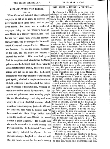 THE MAORI MESSENGER. 4 TE KARERE MAORI. LIFE OF CYRUS THE ELDER. NO. II. When Cyrus had defeated his grandfather Astyages, he did all he could to establish the government upon good laws, and to put down rebels. But there was a relation of Astyages' living on them Western Coast of Asia Minor in a country called Lydia; and he was very angry with Cyrus for dethron- ing Astyages, and be thought that he would attack Cyrus and conquer Persia. His name was Croesus. He was the richest monarch of his age, and his name has become a proverb for wealth. This man had great faith in magicians and wizards like the Maori priests—and he believed that these wizards could foretel future events, and could make things turn out just as they like. So he sent messengers with large presents to the heathen god Apollo, who had a temple and oracle at Delphi in Greece; and he asked the priests and priestesses of this false god, whether be would do well to attack Cyrus or not. The priests and priestesses were cunning people like the Maori tohunga; and they look care always to give -a doubtful answer, which would serve any purpose, just as it fell out. So they sent back word to Croesus that ' if he crossed the River Halys (which flows down the middle of Asia Minor), he would destroy a great kingdom.' He thought that the words meant that he would destroy the Persian empire. So he invaded Persia, and was utterly defeated by Cyrus. So the Delphic tohunga laughed at him and said that the words meant that he would destroy NGA MAHI A HAIRUHA TUPUNA. UPOKO II. Te ri ronga i a 11 a i ru ha o te raua papa whainga ko tona koroheke, ko Ahitaiaki, ka whai nui ia kia whakapumautia taua kingi- tanga hou, kia whakatuturutia ki runga ki nga ture tika, kia pehia hoki nga tangata tu- tu. Otiia, tera te noho mai ra te whanaunga o Ahitaiaki i te tahatai hauauru o Ahia Mai- na. Te ingoa o taua wahi, ko Riria. Wha- katakariri ana taua tangata ki a Hairuha mo tana turakanga i a Ahitaiki i tona torona, hanga ana e tona whakaaro, mana te wha- whai ki a Hairuha, a, me riro whawhai i a ia a Pahia. Te ingoa o taua tangata ko Ki- rihu. Heoi te kingi o taua takiwa i tino whai rawa ko ia, ko Kirihu, waiho iho nei tona ingoa hei whakatauki mo te whai tao- nga, e mau nei ano. 1 whakapono pu tenei tangata ki nga mahi a nga tohunga atua maori, ki nga tohunga makutu, pera me o te tangata maori nei tohunga, a i mea ano ia e pono ana a ratou matakite; a, ki tana wha- kaaro, ka taea e aua tohunga te whakatakoto kia puta ta ratou i pai ai; ara, i meatia e te tohunga kia puta pera tetahi aha ranei, pe- ra tonu, kia puta penei ranei, penei tonu. Na, unga ana e ia ana karere hei kawe i ana taonga whakahere mo taua Atua Maori mo Aporo. He temepara hoki to taua atua me ona tohunga tuaahu i Terewhi, i Kirihi. Na ka uia nga tohunga taane me nga tohunga ruahine o taua ama horihori, kia whakaatu- ria mai, e waimarie ranei ia me ka whainga raua ko Hairuha, e aitua ranei ia. He hu- nga mohio rawa aua tohunga, he hunga hia- nga hoki, pera me nga tohunga o te tangata Maori, na reira, tinihangatia ana te whaka- hokinga atu ki te hunga patai mai, whaka- awangawangatia ana te kupu, kia he rawa ake i tetahi kaweka, kua waiho i tetahi ka- weka te tikanga, kia tika ai, kei kiia kua he te matakite a te tohunga. Na, whakahokia ana te kupu ki a Kirihu, " Ki te whiti koe i te awa i Harihi, e ngaro i a koe te iwi nui." Ko te awa ra, he awa e tapahi ana i waenga- nihi o Ahia Maina puta atu ki te moana. Mahara ana a Kirihu, mo Pahia taua kupu, ara, ko taua iwi nui kia ngaro i a ia. Na, whiti atu ana ana ope ki te whawhai ki Pa- hia, aitua aua, whati rawa ana i te aroaro o Hairuha. Kataina iho ia e nga tohunga o Terewhi, mea ana ratou, kua tika te kupu matakite, ko te iwi nui hoki i kiia ra e ngaro i a Kirihu, ko tona iwi ake. Muri iho i te hinganga parekura ka haere te ope a Hairuha ki te pa nui o Riria, ki Hararihi, huakina ana. horo ana i a ia. Na, i no mua atu, taihoa enei i korerotia ake nei,
