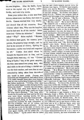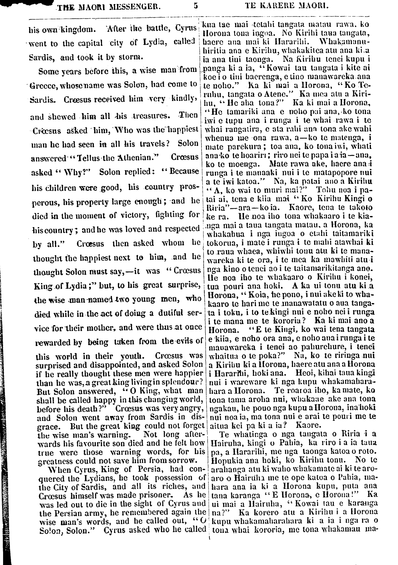 THE MAORI MESSENGER. 5 TE KARERE MAORI. his own kingdom. After the battle, Cyrus went to the capital city of Lydia, called Sardis, and took it by storm. Some years before this, a wise man from Greece, whose name was Solon, had come to Sardis, Croesus received him very kindly, and shewed him all his treasures. Then Croesus asked him, Who was them happiest man he had seen in all his travels? Solon answered "Tellus them Athenian.^ Croesus asked " Why?" Solon replied: " Because his children were good, his country pros- perous, his property large enough; and he died in the moment of victory, fighting for his country; and he was loved and respected by all." Croesus then asked whom he thought the happiest next to him, and he thought Solon must say,—it was " Croesus King of Lydia ;" but, to his great surprise, the wise man named two young men, who died while in them act of doing a dutiful ser- vice for their mother, and were thus at once rewarded by being taken from the evils of this world in their youth. Croesus was surprised and disappointed, and asked Solon if he really thought these men were happier than he was, a great king living in splendour? But Solon answered, " O King, what man shall be called happy in this changing world, before his death?" Croesus was very angry, and Solon went away from Sardis in dis- grace. But them great king could not forget them wise man's warning. Not long after- wards his favourite son died and he felt how true were those warning words, for bis greatness could not save him from sorrow. When Cyrus, King of Persia, had con- quered them Lydians, he took possession of them City of Sardis, and all its riches, and Croesus himself was made prisoner. As he was led out to die in them sight of Cyrus and the Persian army, he remembered again the wise man's words, and he called out, " 0 So! on, Solon." Cyrus asked who he called kua tae mai tetahi tangata matau rawa. ko Horoua toua ingoa. No Kirihi taua tangata, haere ana mai ki Hararihi. Whakamanu- hiritia ana e Kirihu, whakakitea atu ana kia ia ana tini taonga. Na Kirihu tenei kupu i panga ki a ia, "Kowai tau tangata i kite ai koe i o tini haerenga, e tino manawareka ana te noho." Ka ki man a Horona, "Ko Te- ruhu, tangata o Atene." Ka moa atu a Kiri- hu, " He aha tona?" Ka ki mai a Horona, " He tamariki ana e noho pai ana, ko tona iwi e tupu ana i runga i te whai rawa i te whai rangatira, e ata rahi ana tona ake wahi whenua ona rawa, a—ko te matenga, i mate parekura; toa ana, ko tona iwi, whati ana ko te hoariri; riro nei te papa i a ia —ana ko te moenga. Mate rawa ake, haere ana: i runga i te manaaki nui i te matapopore nui a te iwi katoa." Na, ka patai ano a Kirihu "A, ko wai to muri mai?" Tohu noa i pa- tai ai, tena e kiia mai " Ko Kirihu Kingi o Riria"—ara ko ia. Kaore, tena te takoto ke ra. He noa iho tona whakaaro i te kia- nga mai a taua tangata matau, a Horona, ka whakahua i nga ingoa o etahi taitamariki tokorua, i mate i runga i te mahi atawhai ki to raua whaea, whiwhi tonu atu ki te mana- wareka ki te ora, i te mea ka mawhiti atu i nga kino o tenei ao i te taitamarikitanga ano « Ue noa iho te whakaaro o Kirihu i konei, tua pouri ana hoki. A ka ui tonu atu ki a Horona, " Koia, he pono, i nui ake ki to wha- kaaro te hari me te manawatatu o aua tanga- ta i toku, i to te kingi nui e noho nei i runga i te mana me te kororia? Ka ki mai ano a Horona. "E te Kingi, ko wai tena tangata e kiia. e noho ora ana. e noho ana i runga i te manawareka i tenei ao pahurehure, i tenei whaitua o te poka?" Na, ko te riringa nui a Kirihu ki a Horona, haere atu ana a Horona i Hararihi, hoki ana. Heoi, kihai taua kingi nui i wareware ki nga kupu whakamahara- hara a Horona. Te roaroa iho, ka mate, ko tona tama aroha nui, whakaae ake ana tona I ngakau, he pono nga kupu a Horona, inahoki nui noa ia, ma tona nui e arai te pouri me te aitua kei pa ki a ia? Kaore. Te whatinga o nga tangata o Riria i a Hairuha, kingi o Pahia, ka riro i a ia taua pa, a Hararihi, me taonga katoa roto. Hopukia ana hoki, ko Kirihu tonu. No te I arahanga atu ki waho whakamate ai ki te aro- i aro o Hairuha me te ope katoa o Pahia, ma- hara ana ia ki a Horona kupu, puta ana tana karanga "E Horona, e Horona!" Ka ui mai a Hairuha, " Kowai tau e karanga na?" Ka korero atu a Kirihu i a Horona kupu whakamaharahara ki a ia i nga ra o tona whai kororia, me tona whakamau ma--