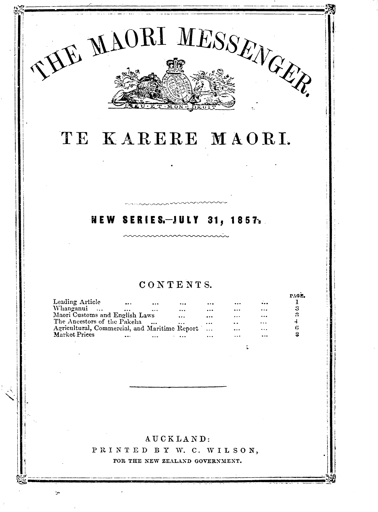The Maori Messenger - Ko te Karere Maori 1855-1860: Volume 4, Number 5. 31 July 1857 |
