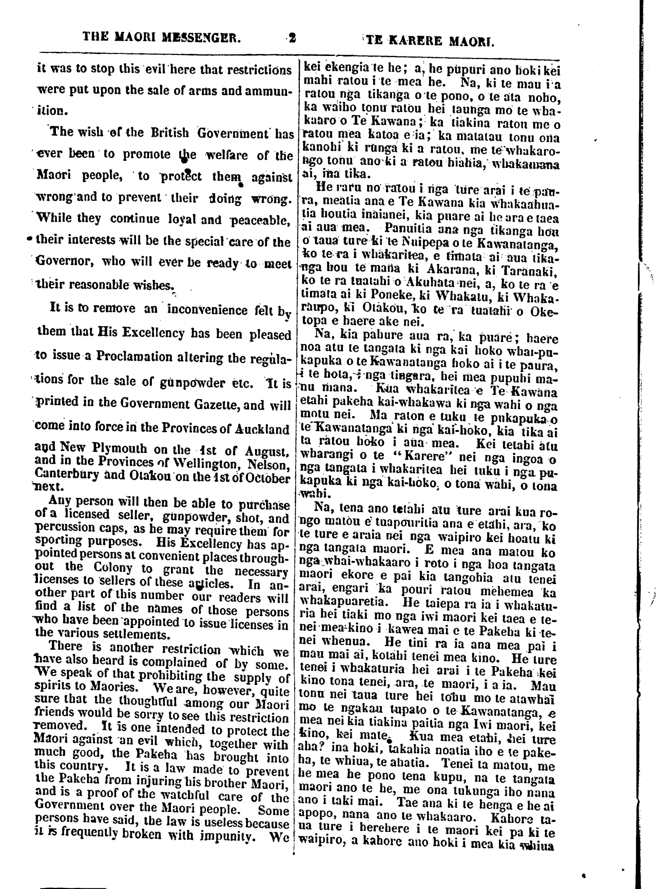 THE MAORI MESSENGER. TE KARERE MAORI. it was to stop this evil here that restrictions were put upon Ihe sale of arms and ammun- ition. The wish of the British Government has ever been to promote the welfare of the Maori people, to protect them against wrong and to prevent their doing wrong. While they continue loyal and peaceable, their interests will be the special care of the Governor, who will ever be ready to meet their reasonable wishes, It is to remove an inconvenience felt by them that His Excellency has been pleased to issue a Proclamation altering the regula- tions for the sale of gunpowder etc. It is printed in the Government Gazette, and will come into force in the Provinces of Auckland and New Plymouth on the 1st of August. and in the Provinces of Wellington, Nelson, Canterbury and Otakou on the lst of October next. Any person will then be able to purchase of a licensed seller , gunpowder, shot, and percussion caps, as he may require them for sporting purposes. His Excellency has ap- pointed persons at convenient places through- out the Colony to grant the necessary licenses to sellers of these abides. In an- other part of this number our readers will find a list of the names of those persons who have been appointed to issue licenses in the various settlements. There is another restriction which we have also heard is complained of by some. We speak of that prohibiting the supply of spirits to Maories. We are, however, quite sure that the thoughtful among our Maori friends would be sorry to see this restriction removed. It is one intended to protect the Maori against an evil which, together with much good, the Pakeha has brought into this country. It is a law made to prevent the Pakeha from injuring his brother Maori, and is a proof of the watchful care of the Government over the Maori people. Some persons have said, the law is useless because it is frequently broken with impunity. We kei ekengia te he; a, he pupuri ano hoki kei mahi ratou i te mea he. Na, ki te mau ia ratou nga tikanga o te pono. o te ata noho, ka waiho tonu ratou hei taunga mo te wha- kaaro o Te Kawana; ka tiakina ratou me o ratou mea katoa e ia; ka matatau tonu ona kanohi ki runga ki a ratou, me te whakaro ngo tonu ano ki a ratou hiahia, whakamana ai, ma tika. He raru no ratou i nga ture arai i te pau- ra, meatia ana e Te Kawana kia whakaahua- tia houtia inaianei, kia puare ai he ara e taea ai aua mea. Panuitia ana nga tikanga hou o taua ture ki te Niupepa o te Kawanatanga, ko tera i whakaritea, e timata ai aua tika- nga hou te mana ki Akarana, ki Taranaki, ko te ra tuatahi o Akuhata nei, a, ko te ra e timata ai ki Poneke, ki Whakatu, ki Whaka- raupo, ki Otakou, ko te ra tuatahi o Oke- topa e haere ake nei. Na, kia pahure aua ra, ka puare; haere noa atu te tangata ki nga kai hoko whai-pu- kapuka o te Kawanatanga hoko ai i te paura, i te hota, i nga tingara hei mea pupuhi ma- nu mana. Kua whakaritea e Te Kawana etahi pakeha kai-whakawa ki nga wahi o nga motu nei. Ma ratou e tuku te pukapuka o te Kawanatanga ki nga kai-hoko, kia tika ai ta ratou hoko i aua mea. Kei tetahi atu wharangi o te " Karere" nei nga ingoa o nga tangata i whakaritea hei tuku i nga pu- kapuka ki nga kai-hoko, o tona wahi, o tona •wahi. Na, tena ano tetahi atu ture arai kua ro- ngo matou e tua pouritia ana e etahi, ara, ko te ture e araia nei nga waipiro kei hoatu ki nga tangata maori. E mea ana matou ko nga, whai-whakaaro i roto i nga hoa tangata maori ekore e pai kia tangohia atu tenei arai, engari ka pouri ratou mehemea ka whakapuaretia. He taiepa ra ia i whakatu- ria hei tiaki mo nga iwi maori kei taea e te- nei mea kino i kawea mai e te Pakeha ki te- nei whenua. He tini ra ia ana mea pai i mau mai ai, kotahi tenei mea kino. He ture tenei i whakaturia hei arai i te Pakeha; kei kino tona tenei, ara, te maori, i a ia. Mau tonu nei taua ture hei tohu u mo te atawhai mo te ngakau tupato o te Kawanatanga, e mea nei kia tiakina paitia nga Iwi maori, kei kino, kei mate, Kua mea etahi, hei ture aha? ina hoki, takahia noatia iho e te pake- ha, te whiua, te ahatia. Tenei ta matou, me he mea he pono tena kupu, na te tangata maori ano te he, me ona tukunga iho nana ano i taki mai. Tae ana ki te henga e he ai apopo, nana ano te whakaaro. Kahore ta- ua ture i herehere i te maori kei pa ki te waipiro, a kahore ano hoki i mea kia whiua