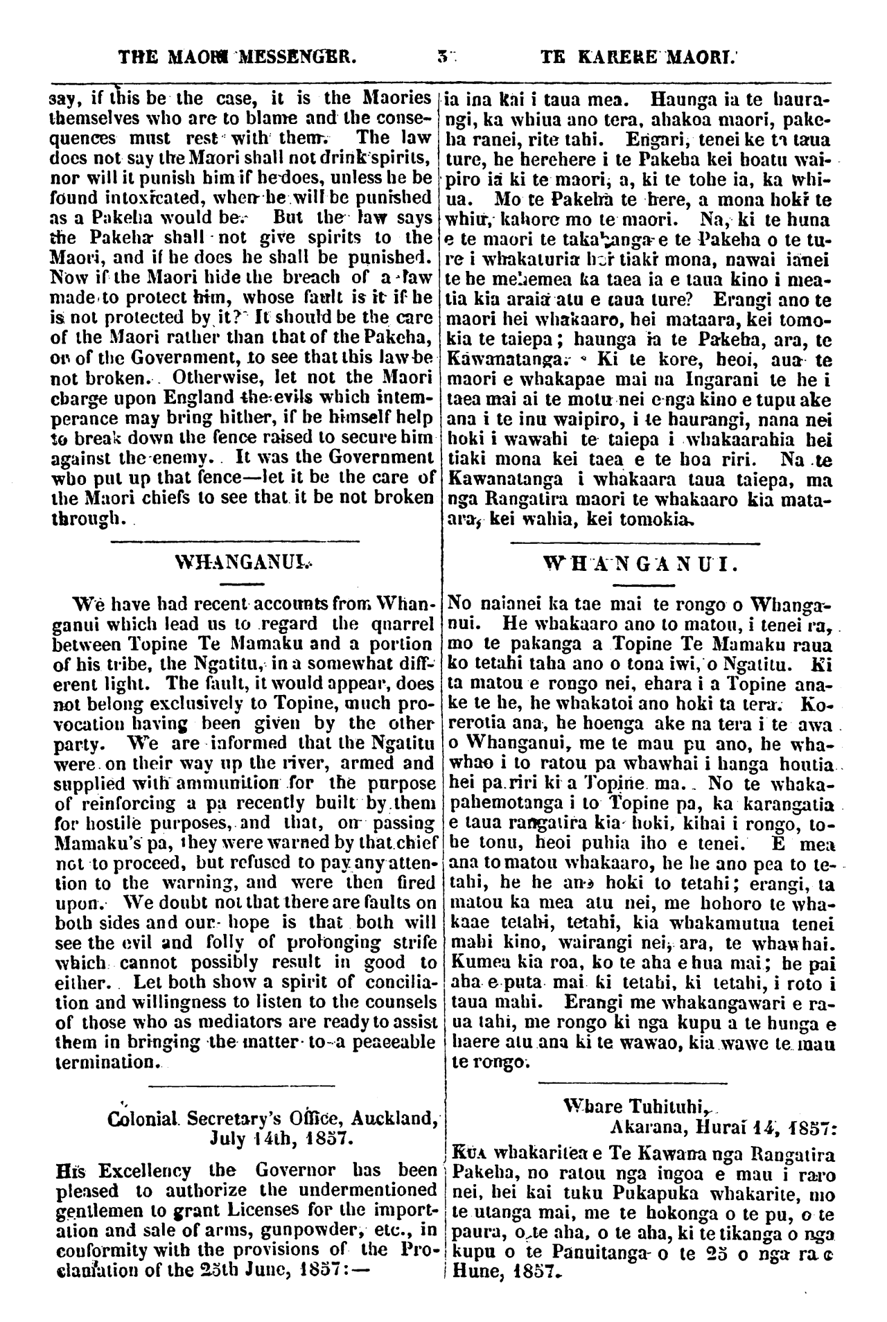 THE MAORI MESSENGER. TE KARERE MAORI say, if this be the case, it is the Maories themselves who are to blame and the conse- quences must rest with them. The law docs not say the Maori shall not drink spirits, nor will it punish him if he does, unless he be found intoxicated, when he will be punished as a Pakeha would be. But the law says the Pakeha shall not give spirits to the Maori, and if he does he shall be punished. Now if the Maori hide the breach of a law made to protect him, whose fault is it if he is not protected by it?" It should be the care of the Maori rather than that of the Pakeha, or of the Government, to see that this law be not broken. Otherwise, let not the Maori charge upon England the -evils which intem- perance may bring hither, if be himself help to break down the fence raised to secure him against the enemy. It was the Government who put up that fence—let it be the care of the Maori chiefs to see that it be not broken through. WHANGANUI. We have had recent accounts from Whan- ganui which lead us to regard the quarrel between Topine Te Mamaku and a portion of his tribe, the Ngatitu, in a somewhat diff- erent light. The fault, it would appear, does not belong exclusively to Topine, much pro- vocation having been given by the other party. We are informed that the Ngatitu were on their way up the river, armed and supplied with ammunition Tor the purpose of reinforcing a pa recently built by them for hostile purposes, and that, on passing Mamaku's pa, they were warned by that chief not to procced, but refused to pay any atten- tion to the warning, and were then fired upon. We doubt not that there are faults on both sides and our- hope is that both will see the evil and folly of prolonging strife which cannot possibly result in good to either. Let both show a spirit of concilia- lion and willingness to listen to the counsels of those who as mediators are ready to assist them in bringing the matter to a peaceable termination. Colonial. Secretary's Office, Auckland, July l4th, 1857. His Excellency the Governor has been pleased to authorize the undermentioned gentlemen to grant Licenses for the import- ation and sale of arms, gunpowder, etc., in conformity with the provisions of the Pro- clamation of the 25th June, 1857: ia ina kai i taua mea. Haunga ia te haura- ngi, ka whiua ano tera, ahakoa maori, pake- ha ranei, rite tahi. Engari, tenei ke ta taua ture, he herehere i te Pakeha kei hoatu wai- piro ia ki te maori, a, ki te tohe ia, ka whi- ua. Mo te Pakeha te here, a mona hoki te whiu, kahore mo te maori. Na, ki te huna e te maori te takahanga e te Pakeha o te tu- re i whakaturia hei tiaki mona, nawai ianei te he mehemea ka taea ia e taua kino i mea- tia kia araia atu e taua ture? Erangi ano te maori hei whakaaro, hei mataara, kei tomo- kia te taiepa; haunga ia te Pakeha, ara, te Kawanatanga. Ki te kore, heoi, aua te maori e whakapae mai na Ingarani te he i taea mai ai te motu: nei e nga kino e tupu ake ana i te inu waipiro, i te haurangi, nana nei hoki i wawahi te taiepa i whakaarahia hei tiaki mona kei taea e te boa riri. Na te Kawanatanga i whakaara taua taiepa, ma nga Rangatira maori te whakaaro kia mata- ara, kei wahia, kei tomokia, WHANGANUI. No naianei ka tae mai te rongo o Whanga- nui. He whakaaro ano to matou, i tenei ra, mo te pakanga a Topine Te Mamaku raua ko tetahi taha ano o tona iwi, o Ngatitu. Ki ta matou e rongo nei, ehara i a Topine ana- ke te he, he whakatoi ano hoki ta tera. Ko- rerotia ana, he hoenga ake na tera i te awa o Whanganui, me te mau pu ano, he wha- whao i to ratou pa whawhai i hanga houtia hei pa riri ki a Topine ma. - No te whaka- pahemotanga i to Topine pa, ka karangatia e taua rangatira kia hoki, kihai i rongo, to- he tonu, heoi puhia iho e tenei. E mea ana to matou whakaaro, he he ano pea to te- tahi, he he ana hoki to tetahi; erangi, ta matou ka mea atu nei, me hohoro te wha- kaae tetahi, tetahi, kia whakamutua tenei mahi kino, wairangi nei, ara, te whawhai. Kumea kia roa, ko te aha e hua mai; he pai aha e puta mai ki tetahi, ki tetahi, i roto i taua mahi. Erangi me whakangawari e ra- ua tahi, me rongo ki nga kupu a te hunga e haere atu ana ki te wawao, kia wawe te mau te rongo. Whare Tuhituhi, Akarana, Hurai 14, 1857: KUA whakaritea e Te Kawana nga Rangatira Pakeha, no ratou nga ingoa e mau i raro nei, hei kai tuku Pukapuka whakarite, mo te utanga mai, me te hokonga o te pu, o te paura, o te aha. o te aha, ki te tikanga o nga kupu o te Panuitanga- o te 25 o nga ra e Hune, 1857.