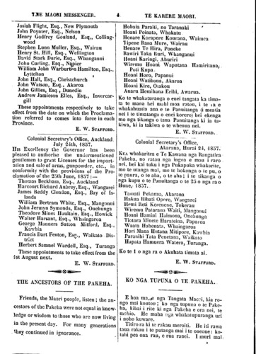 THE MAORI MESSENGER. 4 TE KARERE MAORI. Josiah Flight, Esq., New Plymouth John Poynter, Esq., Nelson Henry Godfrey Gouland, Esq,, Colling- wood Stephen Lunn Muller, Esq., Wairau Henry St. Hill, Esq., Wellington David Stark Durie, Esq., Whanganui John Curling, Esq., Napier William John Warburton Hamilton, Esq., Lyltelton John Hall, Esq., Christchurch John Watson, Esq., Akaroa John Gillies, Esq,.Dunedin Andrew Jamieson Elles, Esq., Invercar- gill These appointments respectively to take effect from the date on which the Proclama- tion referred to comes into force in each Province. E. W. STAFFORD. Colonial Secretary's Office, Auckland, July 24th, 1857. His Excellency the Governor has been pleased to authorise the undermentioned gentlemen to grant Licenses for the import- ation and sale of arms, gunpowder, etc., in conformity with the provisions of the Pro- clamation of the 25th June, 1857:— Thomas Beckham, Esq-, Auckland Harcourt Richard Aubrey, Esq., Wangarei James Reddy Clendon, Esq., Bay of Is- lands William Bertram White, Esq., Mangonui John Jermyn Symonds, Esq., Onehunga Theodore Minet Haultain, Esq., Howick Walter Harsant, Esq., Whaingaroa George Manners Sutton Mitford, Esq., Kawhia Francis Dart Fenton, Esq., Waikato Dis- trict Herbert Samuel Wardell, Esq,, Turanga These appointments to take effect from the 1st August next. E. W. STAFFORD. THE ANCESTORS OF THE PAKEHA. Friends, the Maori people, listen; the an- cestors of the Pakeka were not equal in know- ledge or wisdom to those who are now living in the present day. For many generations they continued in ignorance. Hohaia Paraiti, no Taranaki Hoani Poinata, Whakatu Henare Korapere Kourana, Waimea Tipene Rana Mure, Wairau Henare Te Hira, Poneke Rawiri Taka Kuri, Whanganui Hoani Karingi, Ahuriri Wiremu Hoani Waputana Hamiritana,- Poti Kupa Hoani Horo, Papanui Hoani Watihana, Akaroa Hoani Kire, Otakou Anaru Hemihana Erihi, Awarua. Ko te whakaturanga o enei tangata ka tima- ta te mana hei mahi moa ratou, i te ta e whakahuatia ana e te Panuitanga (i meatia nei i te timatanga o enei korero) hei ekenga mo nga tikanga o taua Panuitanga ki ia ta- Colonial Secretary's Office, Akarana, Hurai 24, 1857. KUA whakaritea e Te Kawana nga Rangatira Pakeha, no ratou nga ingoa e mau i raro nei, hei kai tuku i nga Pukapuka whakarite, mo te manga mai, me te hokonga o; e pu, o te paura, o te aha, o te aha; i te tikanga o nga kupu o te Panuitanga o te 25 o nga ra o Hune,- 1857. Tamati Pekamu Akarana Hakua Rihati Opere, Wangarei Hemi Reti Kerenene, Tokerau Wiremu Patarana Waiti, Mangonui Hoani Hamini Haimona, Onehunga Tiotora Minete Harateina, Paparoa Waata Hahenata, Whaingaroa Hori Mana Hutana Mitipore, Kawhia Paranihi Tata Penetana, Waikato Hapata Hamuera Watera, Turanga. Ko te I o nga ra o Akuhata timata ai. E. W. STAFFORD. KO NGA TUPUNA O TE PAKEHA. E hoa ma, e nga Tangata Maori, kia ro- ngo mai koutou; ko nga tupuna o te Pake- ha, kihai i rue ki nga Pakeha e ora nei, te mohio. He maha nga whakatupuranga uri i noho kuware. Titi ro ra ki te rakau meroiti. He iti rawa taua rakau i te putanga mai i te oneone: ko- tahi pea ona rau, e rua ranei. I muri mai: