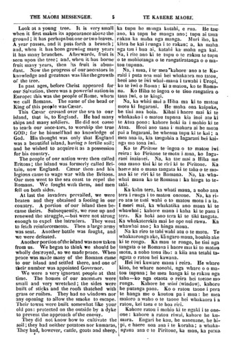 THE MAORI MESSENGER: TE KARERE MAORI: Look at a young tree. It is very small when it first makes its appearance above the ground; it has perhaps but one or two leaves. A year passes, and it puts forth a branch; and, when it has been growing many years it has many branches. Afterwards, friut is seen upon the tree; and, when it has borne fruit many years, then its fruit is abun- dant. Now the progress of our ancestors in knowledge and greatness was like the growth of the tree. In past ages, before Christ appeared for our Salvation, there was a powerful nation in Europe: this was the people of Rome. whom we call Romans. The name of the head or King of this people was Caesar. This Caesar crossed over the sea to our island, that is, to England. He had many ships and many soldiers. He did not come to teach our ancestors, to worship the true GOD; for he himself had no knowledge of God. His thought was only that England was a beautiful island, having! a fertile soil; and he wished to acquire it as a possession for his country. The people of our nation were then called Britons; the island was formerly called Bri- tain, now England. Caesar them and his legions came to wage war with the Britons. Our men went to the sea coast to repel the Romans. We fought with them, and men fell on both sides. At last the invaders prevailed, we were beaten and they obtained a fooling in our country. A portion of our island then be- came theirs. Subsequently, we rose up and renewed the struggle,—but were not strong enough to expel the intruders. They went to fetch reinforcements. Then a large army was sent. Another battle was fought, and we were defeated. Another portion of the island was now taken from us. We began to think we should be wholly destroyed, so we made peace. When peace was nude many of the Romans came to our island and settled there, and one of their number was appointed Governor. We were a very ignorant people at that time. The houses of our ancestors were small and very wretched; the sides were built of sticks and the roofs thatched with grass or rushes. They had no windows nor any opening to allow the smoke to escape. Their towns were built somewhat like your old pas: protected on the outside by a dyke to prevent the approach of the enemy. They did not know how to cultivate the soil; they had neither potatoes nor kumaras, They had, however, cattle, goats and sheep, ka tupu ho manga kotahi, e rua. He tau ano, ka tupu he manga ano; tupu ai taua rakau ka maha nga manga. Muri iho, ka kitea he kai i runga i te rakau; a, ka maha nga tau i hua ai, katahi ka maha nga kai. Na, i rite ano ki te tupu o te rakau te tupu o te mohiotanga o te rangatiratanga o o ma- tou tupuna. Na, i mua, i te mea kahore ano a te Ka- raiti i puta noa mai hei whakaora mo tatou, heoi ano te iwi whai-mana i tawahi i Uropi, ko te iwi o Roma: ki a matou, ko te Roma I na. Ko Hiha te ingoa o te tino rangatira o taua iwi, o te kingi. Na, ka whiti mai a Hiha ma ki to matou motu ki Ingarani. He maha ona kaipuke, he tini aua hoia. Kihai i haere mai ki te whakaako i o matou tupuna kia inoi atu ki te Atua pono: kahore hoki ia i mohio ki te Atua. Heoi ano tana i mahara ai he motu pai a Ingarani, he whenua tupu ki te kai; a mea ana ia, kia tangohia a Ingarani hei kai- nga mo tona iwi. Ko te Piritone te ingoa o ta matou iwi reira: ko Piritone te motu i mua, ko Inga- rani inaianei. Na, ka tae mai a Hiha me ona mano tini ki te riri ki Ie Piritone, Ka haere atu o maua tangata ki te taha o te mo- ana ki te riri ki te Romana. Na, ka wha- whai maua ko te Romana: ka hinga to te- tahi. Ka kaha tera, ka whati maua, a noho ana tera i runga i to matou oneone. Na, ka ri- ro atu te tani wahi o to matou motu- i a ia. I muri mai, ka whakatika ano maua ki te whawhai; kahore maua i kaha ki te pana i tera. Ka hoki ano tera ki te tiki tangata. Ka whakaterekia mai he ope nui rawa. Ka whawhai ano; ka hinga maua. Na ka riro te tahi wahi atu o te motu. Te whakaaronga ake, ka ngaro maua, houhia ake ki te rongo. Ka mau te rongo, he tini nga tangata o te Romana i haere mai ki to matou motu, a noho tonu iho: a kiia ana tetahi ta- ngata o ratou hei kawana. Hei iwi kuware maua i reira. He whare kino, he whare nonohi, nga whare o o ma- tou tupuna; he mea hanga ki te rakau nga taha—ka nga otaota o reira hei toetoe mo- runga. Kahore he wini (window), kahore he putanga paoa. Ko o ratou taone i pera te hanga me o koutou pa i mua: he mea maioro a waho o te taone hei whakaora i a ratou, kei taea e te hoa riri Kahore ratou i mohio ki te ngaki i te one- one: kahore a ratou riwai, kahore he ku- mara. Engari he kau, he nanenane, he hi- pi, e haere noa ana i te koraha; a whaka- uaua ana e te Piritone, ka mau, ka patua