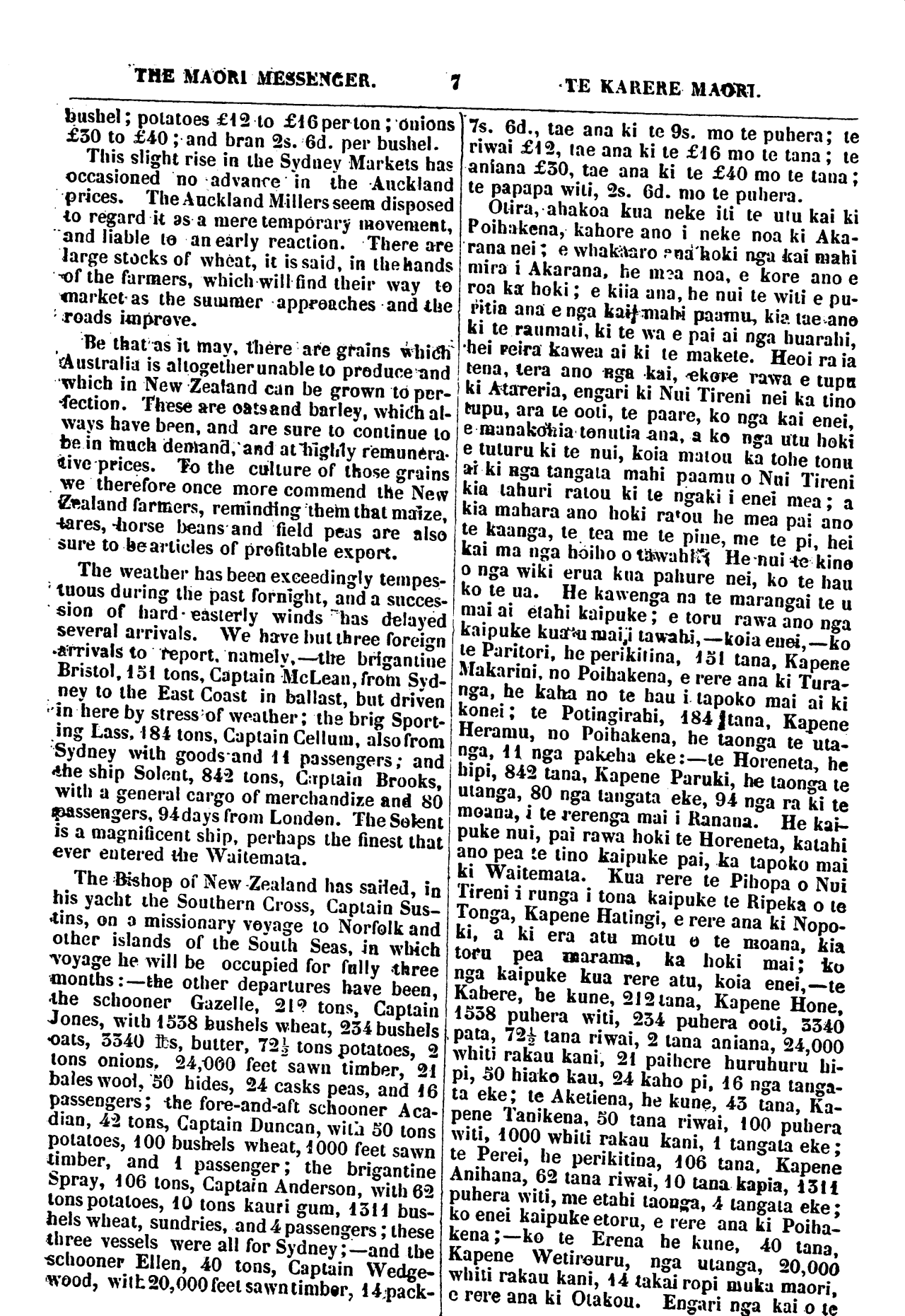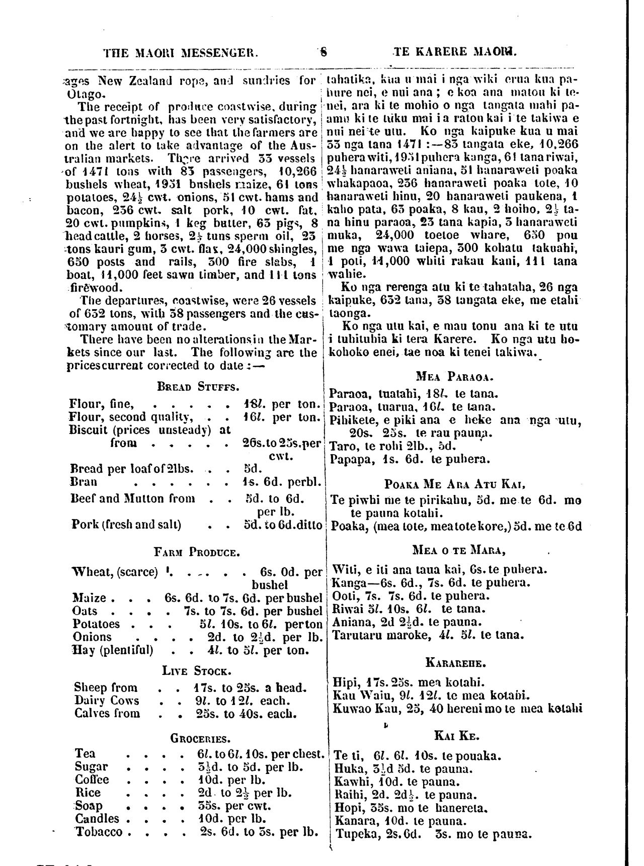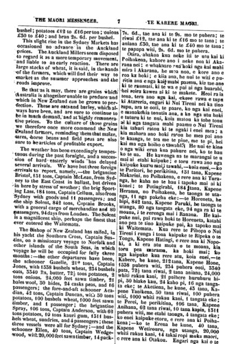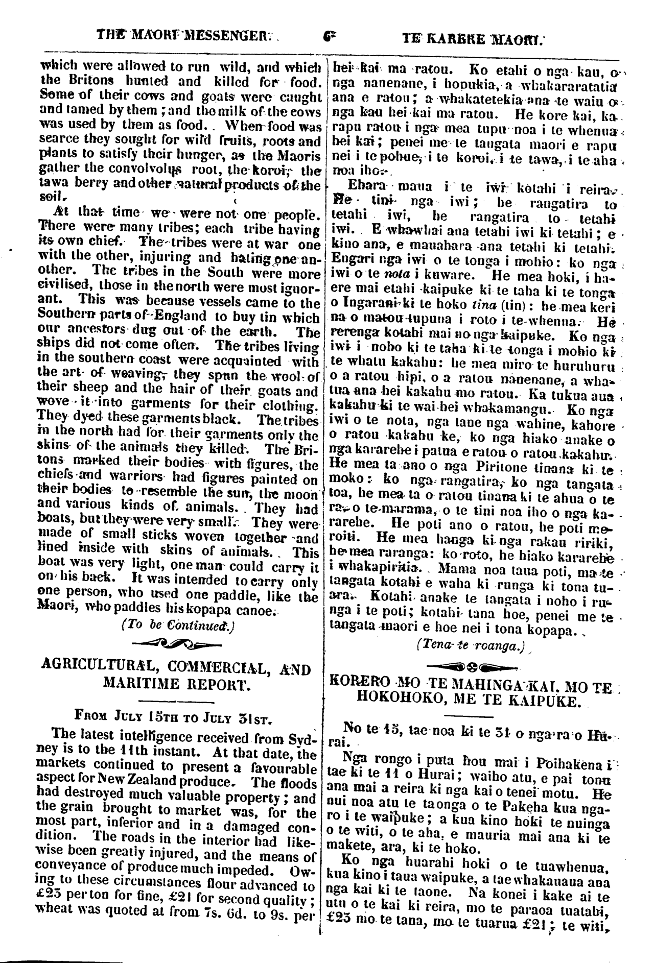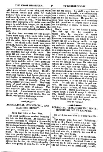THE MAORI MESSENGER. TE KARERE MAORI. which were allowed to run wild, and which the Britons hunted and killed for food. Some of their cows and goats were caught and lamed by them; and the milk of the cows was used by them as food. When food was searce they sought for wild fruits, roots and plants to satisfy their hunger, as the Maoris gather the convolvolus root, koroi, the tawa berry and other natural products of the the soil. At that- time we were not one people. There were many tribes; each tribe having its own chief. The tribes were at war one with the other, injuring and hating one an- other. The tribes in the South were more civilised, those in the north were must ignor- ant. This was because vessels came to the Southern parts of England to buy tin which our ancestors dug out of the earth. The ships did not come often. The tribes living in the southern coast were acquainted with the art of weaving, they spun the wool of their sheep and the hair of their goats and wove it into garments for their clothing. They dyed these garments black. The tribes in the north had for their garments only the skins of the animals they killed. The Bri- tons marked their bodies with figures the chiefs and warriors had figures painted on their bodies to resemble the sun, the moon and various kinds or animals. They had boats, but they were very small. They were made of small sticks woven together and lined inside with skins of animals. This boat was very light, one man could carry it on his back. It was intended to carry only one person, who used one paddle, like the Maori, who paddles his kopapa canoe; (To be Continued.) AGRICULTURAL, COMMERCIAL, AND MARITIME REPORT. FROM JULY 15TH TO JULY 31ST, The latest intelligence received from Syd- ney is to the 11th instant At that date, the markets continued to present a favourable aspect for New Zealand produce. The floods had destroyed much valuable property; and the grain brought to market was. for the most part, inferior and in a damaged con- dition. The roads in the interior had like- wise been greatly injured, and the means of conveyance of produce much impeded. Ow- ing to these circumstances flour advanced to £25 per ton for fine, £21 for second quality; wheat was quoted at from 7s. 6d. to 9s. per hei kai ma ratou. Ko etahi o nga kau, o nga nanenane, i hopukia, a whakararatatia ana e ratou; a whakatetekia ana te waiu o nga kau hei kai ma ratou. He kore kai, ka- rapu ratou i nga mea tupu noa i te whenua hei kai; penei me te tangata maori e rapu nei i te pohue, i te koroi, i te tawa, i te aha - noa iho. Ehara mana i te iwi kotahi i reira He tini nga iwi; he rangatira to tetahi iwi, he rangatira to tetahi iwi. E whawhai ana tetahi iwi ki tetahi; e kino ana, e mauahara ana tetahi ki tetahi. Engari nga iwi o te tonga i mohio: ko nga iwi o te nota i kuware. He mea hoki, i ha- ere mai etahi kaipuke ki te taha ki te tonga o Ingarani te hoko tina (tin): he mea keri na o matou tupuna i roto i te whenua. He rerenga kotahi mai no nga kaipuke. Ko nga iwi i noho ki te taha ki te tonga i mohio ki te whatu kakahu: he mea miro te huruhuru . o a ratou hipi, o a ratou nanenane, a wha- tua ana hei kakahu mo ratou. Ka tukua aua kakahu ki te wai hei vvhakamangu. Ko nga iwi o te nota, nga tane nga wahine, kahore o ratou kakahu ke, ko nga hiako anake o nga kararehe i patua e ratou o ratou kakahu. He mea ta ano o nga Piritone tinana ki te moko: ko nga rangatira, ko nga tangata toa, he mea ta o ratou tinana ki te ahua o te ra o te marama, o te tini noa iho o nga ka- rarehe. He poti ano o ratou, he poti me- roiti. He mea hanga ki nga rakau ririki, he mea raranga: ko roto, he hiako kararehe i whakapiritia. Mama noa taua poti, ma te tangata kotahi e waha ki runga ki tona tu- ara- Kotahi- anake te tangata i noho i ru- nga i te poti; kotahi tana hoe, penei me te tangata maori e hoe nei i tona kopapa. (Tena- te roanga.) KORERO MO TE MAHINGA -KAI. MO TE HOKOHOKO, ME TE KAIPUKE. No te 15, tae noa ki te 31- a nga ra o Hu- rai. Nga rongo i puta hou mai i Poihakena i tae ki te 11 o Hurai; waiho atu, e pai tonu ana mai a reira ki nga kai o tenei motu. He nui noa atu te taonga o te Pakeha kua nga- ro i te waipuke; a kua kino hoki te nuinga o te witi, o te aha; e mauria mai ana ki te makete, ara, ki te hoko. Ko nga huarahi hoki o te tuawhenua. kua kino i taua waipuke, a tae whakauaua ana nga kai ki te taone. Na konei i kake ai te utu o te kai ki reira, mo te paraoa tuatahi, £23 mo te tana, mo. te tuarua £21 ; te witi,