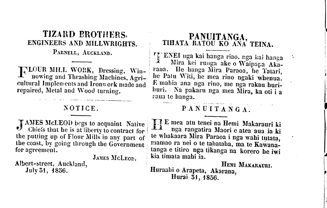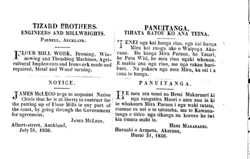 TIZARD BROTHERS, ENGINEERS AND MILLWRIGHTS. PARNELL, AUCKLAND. FLOUR MILL WORK, Dressing, Win- nowing and Thrashing Machines, Agri- cultural Implements and Ironwork made and repaired, Metal and Wood turning. NOTICE. JAMES McLEOD begs to acquaint Native Chiefs that he is at liberty to contract for the pulling up of Flour Mills in any part of the coast, by going through the Government for agreement. JAMES MCLEOD. AIbert-street. Auckland, July 31, 1856. PANUITANGA, TIHATA RATOU KO ANA TEINA. TENEI nga kai hanga nao, nga kai hanga Mira kei runga ake o Waipapa Aka- rana. Tie hanga Mira Paraoa, he Tatari, he Patu Witi, he mea rino ngaki whenua. E mahia ana nga rino, me nga rakau huri- huri. Na pakaru nga mea Mira, ka oti i a raua te hanga. P A N U I T A N G A. HE mea atu tenei na Hemi Makarauri ki nga rangatira Maori e atea aua ia ki te whakaara Mira Paraoa i nga wahi tutata, mamao ra nei o te tahataha, ma te Kawana- tanga e titiro nga tikanga na korero he iwi kia timata mahi ia. HEMI MAKAKAURI. Huraahi o Arapeta, Hurai 31, 1856.