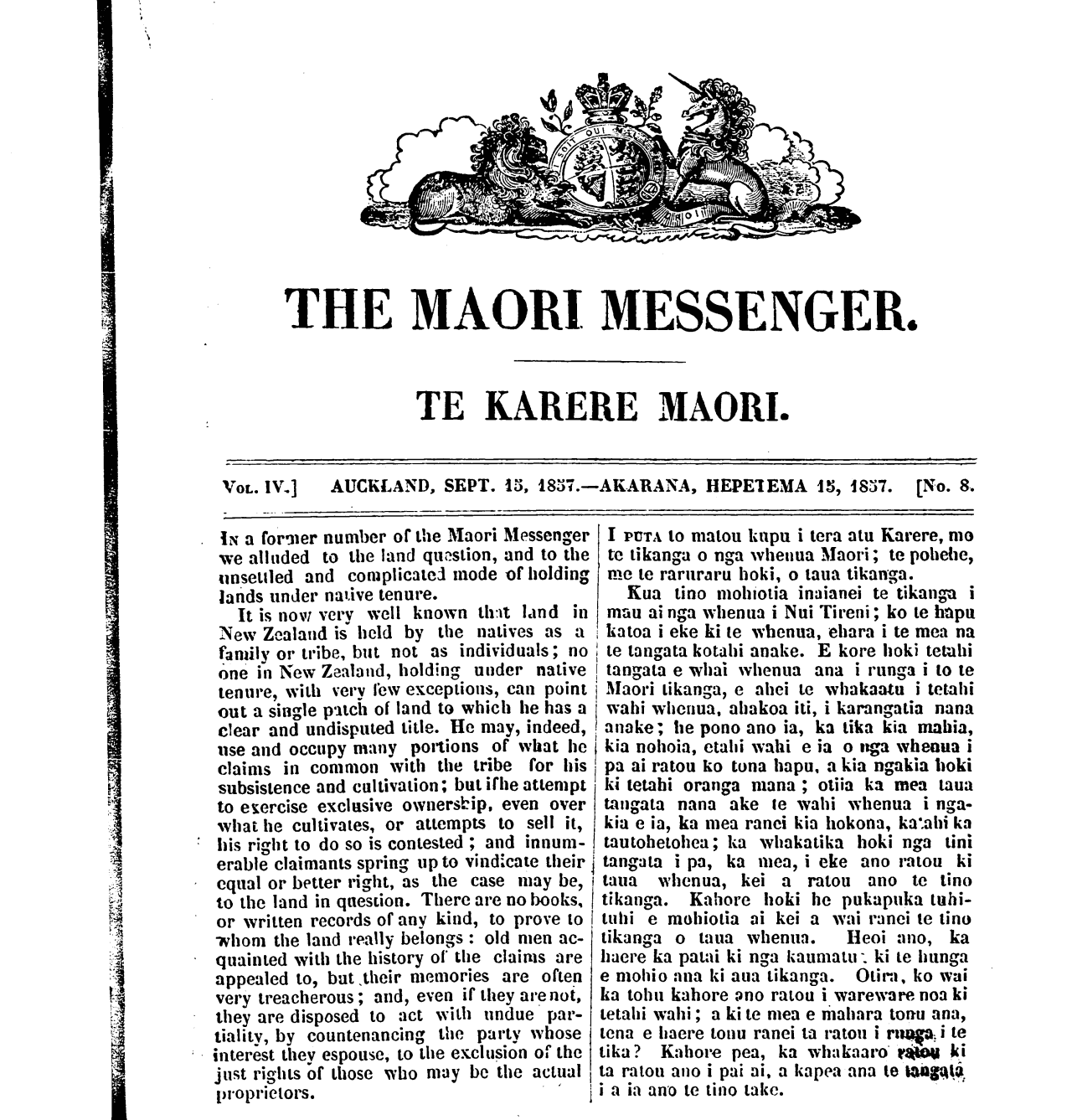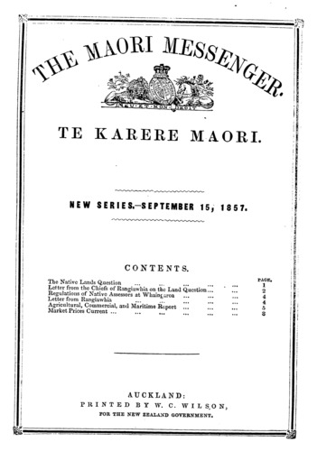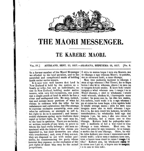 The Maori Messenger - Ko te Karere Maori 1855-1860: Volume 4, Number 8. 15 September 1857 |