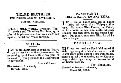 TIZARD BROTHERS, ENGINEERS AND MILLWRIGHTS. PARNELL, AUCKLAND. FLOUR MILL WORK, Dressing, Win- nowing and Thrashing Machines, Agri- cultural Implements and Ironwork made and repaired, Metal and Wood turning. NOTICE. JAMES McLEOD begs to acquaint Native Chiefs that he is at liberty to contract for the putting up of Flour Mills in any part of the coast, by going through the Government for agreement. | JAMES MCLEOD. Albert-street, Auckland, July 51, 1856. PANUITANGA, TIHATA RATOU KO ANA TEINA. TENEI nga kai hanga riao, nga kai hanga Mira kei runga ake o Waipapa Aka- rana. He hanga Mira Paraoa, he Tatari, he Patu Witi, he mea rino ngaki whenua. E mahia ana nga rino, me nga rakau huri- huri. Na pakaru nga mea Mira, ka oti i a raua te hanga. PANUITANGA. HE mea atu tenei na Hemi Makarauri ki nga rangatira Maori e atea aua ia ki te whakaara Mira Paraoa i nga wahi tutata, mamao ra nei o te tahataha, ma te Kawana- tanga e titiro nga tikanga na korero he iwi kia timata mahi ia. HEMI MAKAKAURI. Huraahi o Arapeta, Akarana, Hurai 31, 1856.