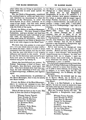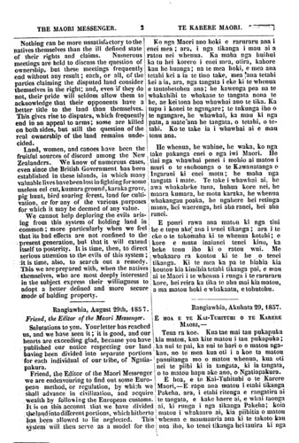 THE MAORI MESSENGER. 2 TE KARERE MAORI. Nothing can be more unsatisfactory to the natives themselves than the ill defined state of their rights and claims. Numerous meetings are held to discuss the question of ownership, but these meetings frequently end without any result; each, or all, of the parties claiming the disputed land consider themselves in the right; and, even if they do not, their pride will seldom allow them to acknowledge that their opponents have a better title to the land than themselves. This gives rise to disputes, which frequently end in an appeal to arms; some are killed on both sides, but still the question of the real ownership of the land remains unde- cided. Land, women, and canoes have been the | fruitful sources of discord among the New Zealand's. We know of numerous cases, even since the British Government has been established in these islands, in which many valuable lives have been lost in fighting for some useless eel cut, kumara ground, karaka grove, pig hunt, bird snaring forest, land for culti- vation, or for any of the various purposes for which it may be deemed of any value. We cannot help deploring the evils aris- ing from this system of holding land in common; more particularly when we feel that its bad effects are not confined to the - present generation, but that it will extend itself to posterity. It is time, then, to direct serious attention to the evils of this system; it is time, also, to search out a remedy. This we are prepared with, when the natives themselves, who are most deeply interested in the subject express their willingness to adopt a better defined and more secure mode of holding property. Rangiawhia, August 29th. 1857. Friend, the Editor of the Maori Messenger. Salutations to you. Your letter has reached us, and we have seen it; it is good, and our hearts are exceeding glad, because you have published our notice respecting our land having been divided into separate portions for each individual of our tribe, of Ngatia- pakura. Friend, the Editor of the Maori Messenger we are endeavouring to find out some Euro- pean method, or regulation, by which we shall advance in civilization, and acquire wealth by following the European customs. It is on this account that we have divided the land into different portions, which hitherto has been allowed to lie neglected. This system will then serve as a model for the Ko nga Maori ano hoki e raruraru ana i enei mea; ara, i nga tikanga i mau ai a ratou nei whenua. Ka maha nga huihui ka tu hei korero i enei mea, otira, kahore kau he huanga; na te mea hoki, e mea ana tetahi kei a ia te tino take, mea ana tetahi kei a ia, ara, nga tangata i eke ki te whenua e tautohetohea ana; he kawenga pea ua te whakahihi te whakaae to tangata nona te he, ae kei tona hoa whawhai ano te tika. Ka tupu i konei te ngangare; te tukunga iho o te ngangare, he whawhai, ka mau ki nga patu, a mate ana he tangata, o tetahi, o te- tahi. Ko te take ia i whawhai ai e mau tonu ana. He whenua, he wahine, he waka, ko nga take pakanga enei o nga iwi Maori. He tini nga whawhai penei i mohio ai matou i muri o te nohoanga o te Kawanatanga o Ingarani ki enei motu; he maha nga tangata i mate. Te take i whawhai ai, he awa whakaheke tuna, huhua kore nei, he maara kumara, he motu karaka, he whenua whakangau poaka, he ngahere hei retinga manu, hei waerenga, hei aha ranei, hei aha ranei. E pouri rawa ana matou ki nga tini he e tupu ake ana i tenei tikanga; ara i te eke o te tokomaha ki te whenua kotahi; e kore e mutu inaianei tenei kino, ka heke tonu iho ki o ratou wui. Me whakaaro ra koutou ki te he o tenei tikanga. Ki te mea ka pa te hiahia kia koutou kia kimihia tetahi tikanga pai, e mau ai te Maori i te whenua i runga i te raruraru kore, hei reira ka tika te ahu mai kia matou, a ma matou hoki e whakaatu, e tohutohu. Rangiawhia, Akuhata 29, 1857. E HOA E TE KAITUHITUHI O TE KAREKE MAORI,— Tena ra koe. Kua tae mai tau pukapuka kia matou, kua kite matou i tau pukapuka; ka nui te pai, ka nui te hari o o matou nga- kau, no te mea kua oti i a koe ta matou panuitanga mo o matou whenua, kua oti nei te piihi ki ia tangata, ki ia tangata, o to matou hapu ake ano, a Ngatiapakura. E hoa, e te Kai-Tuhituhi o te Karere Maori,—E rapu ana matou i etahi tikanga Pakeha, ara, i etahi ritenga e rangatira ai i te tangata, e kake haere ai, e whai taonga ai, ki runga i nga tikanga Pakeha; koia matou i whakaaro ai, kia piihitia o matou whenua e maumauria ana ki te takoto kau noa iho, ko tenei tikanga hei tauira ki nga