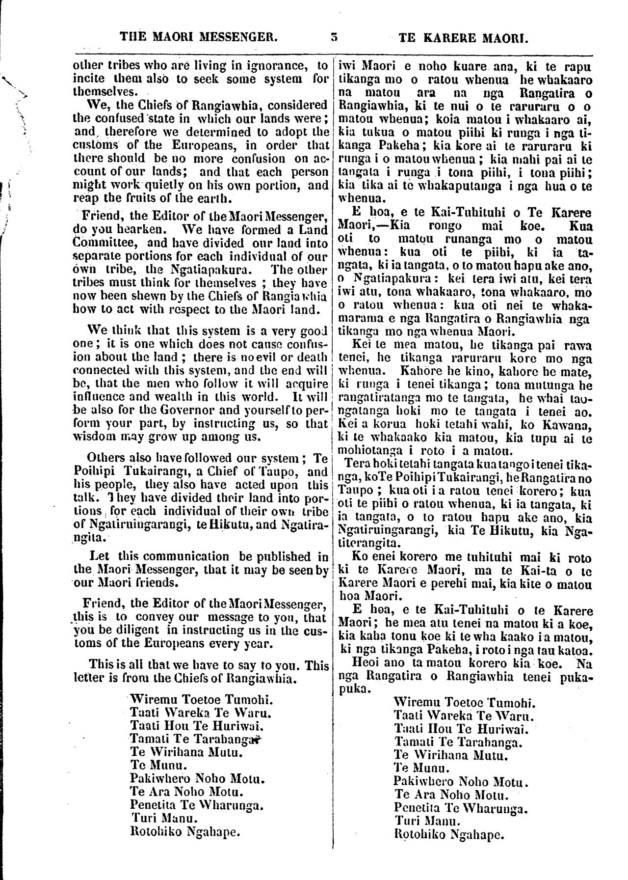 THE MAORI MESSENGER. 3 TE KARERE MAORI. other tribes vvho are living in ignorance, to incite them also to seek some system for themselves. We, the Chiefs of Rangiawhia, considered the confused state in which our lands were; and, therefore we determined to adopt the customs of the Europeans, in order that there should be no more confusion on ac- count of our lands; and that each person might work quietly on his own portion, and reap the fruits of the earth. Friend, the Editor of the Maori Messenger, do you hearken. We have formed a Land Committee, and have divided our land into separate portions for each individual of our own tribe, the Ngatiapakura. The other tribes must think for themselves; they have now been shewn by the Chiefs of Rangiawhia how to act with respect to the Maori land. We think that this system is a very good one; it is one which does not cause confus- ion about the land; there is no evil or death connected with this system, and the end will be, that the men who follow it will acquire influence and wealth in this world. It will be also for the Governor and yourself to per- form your part, by instructing us, so that wisdom may grow up among us. Others also have followed our system; Te Poihipi Tukairangi, a Chief of Taupo, and his people, they also have acted upon this talk. They have divided their land into por- tions for each individual of their own tribe of Ngatiruingarangi, te Hikutu, and Ngatira- ngita. Let this communication be published in the Maori Messenger, that it may be seen by our Maori friends. Friend, the Editor of the Maori Messenger, this is to convey our message to you, that you be diligent in instructing us in the cus- toms of the Europeans every year. This is all that we have to say to you. This Ietter is from the Chiefs of Rangiawhia. Wiremu Toetoe Tumohi. Taati Wareka Te Waru. Taati Hou Te Huriwai, Tamati Te Tarahanga Te Wirihana Mutu. Te Munu. Pakiwhero Noho Motu. Te Ara Noho Motu. Penetita Te Wharunga. Turi Manu. Rotohiko Ngahape. iwi Maori e noho kuare ana, ki te rapu tikanga mo o ratou whenua he whakaaro na matou ara na nga Rangatira o Rangiawhia, ki te nui o te raruraru o o matou whenua; koia matou i whakaaro ai, kia tukua o matou piihi ki runga i nga ti- kanga Pakeha; kia kore ai te raruraru ki runga i o matou whenua; kia mahi pai ai te tangata i runga i tona piihi, i tona piihi; kia tika ai to whakaputanga i nga hua o te whenua. E hoa, e te Kai-Tuhituhi o Te Karere Maori,—Kia rongo mai koe . Kua oti to matou runanga mo o matou whenua: kua oti te piihi, ki ia ta- ngata, ki ia tangata, o to matou hapu ake ano, o Ngatiapakura: kei tera iwi atu, kei tera iwi atu, tona whakaaro, tona whakaaro, mo o ratou whenua: kua oti nei te whaka- marama e nga Rangatira o Rangiawhia nga tikanga mo nga whenua Maori. Kei te mea matou, he tikanga pai rawa tenei, he tikanga raruraru kore mo nga whenua. Kahore he kino, kahore he mate, ki runga i tenei tikanga; tona mutunga he rangatiratanga mo te tangata, he whai tae- noatanga hoki mo te tangata i tenei ao. Kei a korua hoki tetahi wahi, ko Kawana, ki te whakaako kia matou, kia tupu ai te mohiotanga i roto i a matou. Tera hoki tetahi tangata kua tango i tenei tika- nga, ko Te Poihipi Tukairangi, he Rangatira no Taupo; kua oti ia ratou tenei korero; kua oti te piihi o ratou whenua, ki ia tangata, ki ia tangata, o to ratou hapu ake ano, kia Ngatiruingarangi, kia Te Hikutu, kia Nga- titerangita. Ko enei korero me tuhituhi mai ki roto ki te Karere Maori, ma te Kai-ta o te Karere Maori e perehi mai, kia kite o matou hoa Maori. E hoa, e te Kai-Tuhituhi o te Karere Maori; he mea atu tenei na matou ki a koe, kia kaha tonu koe ki te wha kaako ia matou, ki nga tikanga Pakeha, i roto i nga tau katoa. Heoi ano ta matou korero kia koe. Na nga Rangatira o Rangiawhia tenei puka- puka. Wiremu Toetoe Tumohi. Taati Wareka Te Waru. Taati Hou Te Hu ri wai. Tamati Te Tarahanga. Te Wirihana Mutu. Te Munu. Pakiwhero Noho Motu. Te Ara Noho Motu. Penetita Te Wharunga. Turi Manu. Rotohiko Ngahape.
