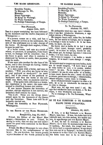 THE MAORI MESSENGER. 4 TE KARERE MAORI Rotohiko Tutaku. Te Matenga Te Wi. Mamuka. Hoani Ngarongo.. Te Kingi Te Warangi. Te Wano Tarakaka. Te Poihipi Tukairangi, of Taupo. New Plymouth, August 24th, 1857. THIS is a paper containing the laws followed by the Assessors and the twelve (Jurymen) of Whaingaroa:— If a person comes on a visit, and has a horse, when he arrives at the settlement, the men of the settlement are to take charge of; the horse. If, through their neglect, it dies, it must be paid for. If a horse comes, and eats at a stack of. wheat, or potatoes, or pumpkins, if the fence is bad, no damage will be awarded; but, if the fence is good, and what it contains is destroyed by horses or cattle, then payment must be made. If one man asks another for the loan of his horse, and it dies through his having, ridden it, it must be paid for. If a man. comes with a horse, and says to i another, "Will you allow my horse to stay in your paddock or stockyard?" he must pay; but if the owner of the paddock or stockyard said that the horse or the cow might slay there, then no payment need be made. If he spoke with reference to a house, the regulation is the same; the same rules extend to (dwelling) houses and stables. If one person disputes the boundary of another, and bis objection is not correct, the boundary shall remain the same. This is all. These are the things deter- mined upon by the Assessors of the Queen and the Governor. These laws will be ef- fectually carried out. From the Assembly at New Plymouth, Whaingaroa. TO THE EDITOR OF THE MAORI MESSENGER. Rangiawhia, Aug. 25, 1857. Friend, the Editor of the Maori Mes- senger,—Salutations to you. Friend, be strong to write, that we may see and under- stand the good rules contained in the Maori Messenger. Friend, the Maori Messenger is very clear, because this is the enlightenment of the heart. Do you hearken, our hearts greatly rejoice because of the words printed in the Rotohiko Tutaku. Te Matenga Te Wi. Mamuka. Hoani Ngarongo. Te Kingi Te Warangi. Te VVano Tarakaka. Te Poihipi Tukairangi, o Taupo. Te Nu Paremata, Akuhata 24, 1857. He pukapuka tenei mo nga ture i whaka- taua e nga Kai whakarite whakawa, e nga tekau marua o Whaingaroa. He tangata haere mai, noho iho, he hoiho tuna, ka tae maiki te kainga, ma te tangata o te kainga e tiaki te hoiho; ki te he tana tiaki, ka mate, me utu. Ka haere mui te hoiho ki te kai i te pa witi, riwai ranei, kaanga ranei, paukena ranei; ki te kino te taiepa, kaore he utu. He taiepa pai, ka kainga nga mea i roto e te hoiho, e te kau ranei, ka utu. Ki te tono te tangata i te hoiho o tetahi tangata, ki te mate i tana ekenga i runga, ka utu. Ki te haere mai te tangata me tana hoiho, ka ki atu ki tetahi tangata, "E kore koe e pai ki. taku hoiho ki roto o to pamu, tokiari ranei?" ka utu. Na te tangata i te pamu i te tokiari i ki atu ki reira noho ai ie hoiho, te kau ranei, kaore be utu; nana i ki atu ki te whare, penei ano te ritenga,—whare hoiho, whare tangata,—pena tonu te ritenga. Ki te whakatete tetahi tangata i te rohe o te tehi, ki te he te whakatete ka tau ano ki te rohe te tikanga. Heoi ano, ko nga mea tenei i oti. Ma nga Kai whakarite ture o te Kuini, o Te Ka- wana, e tino whakarite ena ture. Na te runanga o Te Nu Paremata, Whai- garoa. KI TE KAI TUHITUHI O TE KAREKE MAORI TENEI PUKAPUKA. Rangiawhia, Ahutata, 19, 1857.. E hoa, e te Kai Tuhituhi o te Karere Maori, tena koe. E hoa, kia kaha koe ki te tuhituhi mai, kia kite matau, kia mohio ma- tou, ki nga tikanga pai o te Karere Maori. E hoa, ka nui te marama a te Karere Maori; no te mea he maramatanga tenei no te ngakau,: Ko tenei, kia rongo mai koe; ka nui te hari o o matou ngakau, ki nga kupu kua taia nei ki te Nuipepa; he mea atu tenei na matou ki te Kai Tuhi o te Karere Maori, kia kaha tonu mui ia ki te tuhi ki nga.
