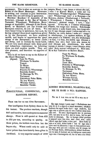 THE MAORI MESSENGER. 5 TE KARERE MAORI. newspaper. This is what we now say to the Editor of the Maori Messenger. Persevere in writing. and continue to give instruction to those who are still living in ignorance. Hearken! Hearken! O Assembly of the Governor, although at the Bay of Islands, Taranaki, Whanganui, Wellington, Here- taunga or Auckland; although in the North, South, or Mainland; yet our friends and European relatives, do you all listen. We were found living in ignorance, but now, by having adopted those good regulations given us by the Europeans, we have acquired wealth, and hearts to appreciate the good things of the Europeans; to breed cattle and sheep, and to reclaim the waste lands. We are very much pleased with these good and industrious regulations; by following them we shall acquire wealth. They are also pleasant, and therefore we approve of them. This is all we have to say to the Editor of the Maori Messenger. (Signed) Taati Te Waru. Wirihana Te Kuaha. Tamati. Te Munu. Taati Hou. Penetita Te Wharaunga. Rotohiko Kokiri. Te Matenga Te Wi. Tu ri manu. Pakiwhero Noho Motu. Te A ra Waere. Wiremu Toetoe. Rotohiko Tutaki. ARICULTURAL, COMMERCIAL, AND MARITIME REPORT. FROM THE 1ST TO THE 15TH SEPTEMBER» Our intelligence from Sydney dates to the 5th instant. The produce markets, though dull and inactive, have undergone no material change- Flour is still quoted at from £23 to £23 per ton, according to quality. At those prices, the holders were firm but the buyers shy. Wheat could only be sold at lower prices than have latterly been given in Auckland. A very superior sample of 4000 tangata Maori, i nga kupu e takoto ake nei, i roto i te Karere Maori, e noho nei i te kuaretanga. Whakarongo mai! Whakarongo mai! Whakarongo mai! e te Runanga o te Kawana, ahakoa i Pewhairangi, i Taranaki. i Whanganui, i Poneke, i Heretaunga, i Akarana; ahakoa i runga, i raro. i wae- nganui. E hoa ma, e o matou whanaunga Pakeha, kia rongo mai koutou. Rokohanga mai matou e noho kuare ana, kua rongo ma- tou ki nga tikanga papai i tukua mai nei e te Pakeha, na reira matou i noho ai i runga i te whai taonga, i te ngakau mahara, ki nga mea papai a te Pakeha; aro, kia whakatupu i te kau, i te hipi, kia mahia nga whenua e takoto kau ana; hari tonu ana matou ki enei tikanga pai, ahuwhenua, kia whai taonga ai matou i runga i tenei tikanga ahua reka. Koia matou i whakapai ai. Heoi ano. Ki te Kai Tuhituhi o te Karere Maori. Taati Te Waru. Te Wirihana Te Kuaha. Tamati. Te Munu. Taati Hou. Penetita te Wharaunga. Rotohiko Kokiri. Te Matenga Te Wi. Turi manu. Pakiwhero Noho Motu « Te A ra Waere. Wiremu Toetoe. Rotohiko Tutaki. KORERO HOKOHOKO; NGAKINGA KAI, ME TE MAHI O NGA KAIPUKE. NO TE 1 TAE NOA KI TE 15 NGA RA O HEPETEMA. Ko nga rongo i puta mai i Poihakena tae- ana ki te 5 o nga ra o tenei marama; ahakoa kahore he ngoi hoko kai i nga makete, ka- nga utu e tuturu ana ki era i tuhia i mua tata ake nei. Te utu i karangatia mo te paraoa 231 tae ana ki te 231 mo te tana, kei te pai hoki te tikanga. Ko te hunga whai paraoa e pupuri ana, kia riro mai enei utu; otiia. ekore nga kai boko e tino pai. Kua hoki te utu o te witi, kihai hoki i tae ki nga utu I riro mai ki Akarana i nga ra kua pahure nei. Ko nga witi pai nei i utaina atu ki runga ki te Potingi Rahi, 4000 puhera, kihai i hokona, no te mea 8 hereni me te hikipene rawa ano nga utu i karangatia ai; ko te utu o te riwai.