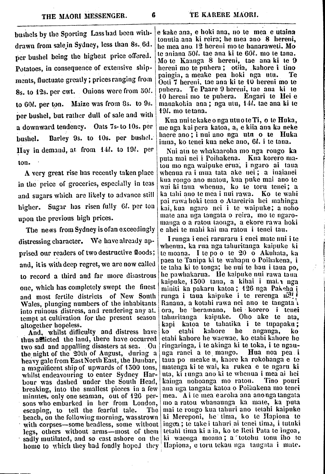 THE MAORI MESSENGER. 6 TE KARERE MAORI. bushels by the Sporting Lass had been vvith- drawn from sale in Sydney, less than 8s. 6d. per bushel being the highest price offered. Potatoes, in consequence of extensive ship- ments, fluctuate greatly; prices ranging from 8s. to 12s. per cwt. Onions were from 501 to 60 1. per ton. Maize was from 8s. to 9s. per bushel, but rather dull of sale and with a downward tendency. Oats 7s- to 10s. per bushel. Barley 9s. to IOs. per bushel. Hay in demand, at from 141 to 191. per ton. A very great rise has recently taken place in the price of groceries, especially in teas and sugars which are likely to advance still higher. Sugar has risen fully 61. per ton upon the previous high prices. The news from Sydney is of an exceedingly distressing character. We have already ap- prised our readers of two destructive floods; and, it is with deep regret, we are now called to record a third and far more disastrous one, which has completely swept the finest and most fertile districts of New South Wales, plunging numbers of the inhabitants into ruinous distress, and rendering any at. tempt at cultivation for the present season altogether hopeless. And, whilst difficulty and distress have thus afflicted the land, there have occurred two sad and appalling disasters at sea. On the night of the 20th of August, during a heavy gale from East North East, the Dunbar, a magnificent ship of upwards of 1500 tons, whilst endeavouring to enter Sydney Har- bour was dashed under the South Head, breaking, into the smallest pieces in a few minutes, only one seaman, out of 126 per- sons who embarked in her from London, escaping, to tell the fearful tale. The beach, on the following morning, was strown with corpses—some headless, some without legs, others without arms—most of them sadly mutilated, and so cast ashore on the home to which they had fondly hoped they e kake ana, e hoki ana, no te mea e utaina tonutia ana ki reira; he mea ano 8 hereni, he mea anu 12 hereni mo te hanaraweti. Ma te aniana 501. tae ana ki te 601 mo te tana. Mo te Kaunga 8 hereni, tae ana ki te 9 hereni mo te puhera; otiia, kahore i tino paingia, a meake pea hoki nga utu. Te Ooti 7 hereni, tae ana ki te IO hereni mo te puhera. Te Paare 9 hereni, tae ana ki te 10 hereni mo te puhera. Engari te Hei e manakohia ana; nga mu, 141. tae ana ki te 191 mo te tana. Kua nui te kake o nga utu o te Ti, o te Huka, me nga kai pera katoa, a, e kiia ana ku neke haere ano; i nui ano nga utu o te Huka i mua, ko tenei kua neke ano, 61. i te tana. Nui atu te whakaaroha mo nga rongo ka puta mai nei i Poihakena. Kua korero ma- tou mo nga waipuke erua, i ngaro ai taua whenua ra i mua tata ake nei; a inaianei kua rongo ano matou, kua puke mai ano te wai ki taua whenua, ko te toru tenei; a ka tahi ano te mea i nui rawa. Ko te wahi pai rawa hoki tena o Atareiria hei mahinga kai, kua ngaro nei i te waipuke; a noho male ana nga tangata o reira, mo te ngaro- manga o a ratou taonga, a ekore rawa hoki e ahei te mahi kai ma ratou i tenei tau. I runga i enei raruraru i enei mate nui i te whenua, ka rua nga tahuritanga kaipuke ki to moana. I te po o te 20 o Akuhata, ka paea te Tanipa ki te wahapu o Poihakena, i te taha ki te tonga; he nui te hau i taua po, he pawhakarua. He kaipuke nui rawa taua kaipuke, 1300 tana, a kihai i maha nga miniti ka pakaru katoa; 126 nga Pakeha i runga i taua kaipuke i te rerenga mai i Ranana, a kotahi rawa nei ano te tangata ora, he heramana, hei korero i tenei tahuritanga kaipuke. Oho ake te ata, kapi katoa te tahatika i te tupapaku; ko etahi kahore he anganga, ko etahi kahore he waewae, ko etahi kahore he ringaringa, i te akinga ki te toka, i te ngau- nga ranei a te mango. Hua noa pea i taua po meake u, kaore ka rokohanga e te matenga ki te wai, ka rukea e te ngaru ki uta, ki runga ano ki te whenua i mea ai hei kainga nohoanga mo ra tou. Tino pouri ana nga tangata katoa o Poihakena mo tenei mea. Ai te mea e aroha ana ano nga tangata mo a ratou whanaunga ka mate, ka puta mai te rongo kua tahuri ano tetahi kaipuke ki Mereponi, he tima, ko te Hapiona te ingoa; te take i tahuri ai tenei tima, i tutuki tetahi tima ki a ia, ko te Reti Pata te ingoa, ki waenga moana; a totohu tonu iho te Hapiona, e toru tekau nga tangata i mate.