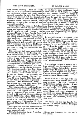 THE MAORI MESSENGER. TE KARERE MAORI. were happily returning. Such an event could not fail to plunge the whole community into the deepest gloom; and whilst men were still sorrowing for their lost friends, tidings were received that the Champion steamer had been ran down and sunk near Melbourne by the Lady Bird steamer, one and thirty persons having perished on the lamentable occasion. The foreign arrivals, since our last, have been the barque Cornubia, 460 tons, Captain Elison with a general cargo of merchandise and 57 passengers from London. The schooners Martha, 99 tons. Captain Hunt; and Sybil, 108 tons, Captain G. Kelly, with sundry merchandise and 12 passengers from Melbourne. The schooners Gazelle, 212 tons. Captain Phillip Jones; and Spray, 4 06 tons, Captain Anderson, with full cargoes and 17 passengers from Sydney. The Henry, schooner, 45 tons, Captain Butt, from Tara- naki, with 134 sheep, 1225 bushels oats, and 4 box butter. The departures, for Sydney, were the brig Gertrude, 118 tons, Captain Dunning, with 1668 bushels wheat, 24 tons potatoes, 10 bags onions, 51 kegs butter, 54 coils wool lashing, 1 tun oil 22 tons kauri gum; the brig Sarah, 121 tons, Captain Firth, with with 2418 bushels wheat, 275 bushels maize, 50 tons potatoes, 20 tons kauri gum. and 8 passengers. The brig Gertrude, 217 tons, Captain Grange, has also sailed for Melbourne, with 15 passengers, and 44 tons flour, 8 tons bran, 8 tons kauri gum, 3 tons flax, 33 tons potatoes, 2499 bushels maize, and 1 7, 500 feet timber. Two schooners, the Erin, 57 tons, Captain Sherret; and Ann, 36 tons. Captain Ellis, have sailed for Port Napier with general cargoes and 15 passengers. And the schooner. Henry, 45 tons, Captain Butt, with goods and 24 pas- sengers for the Nelson Gold Fields. The weather, during the past fortnight, has been unusually wet and windy, gale following after gale. The supplies from the coast, have, in consequence, been limited. There arrived, in 24 vessel, of 558 tons.—44 pas- sengers, 1757 bushels-wheat, 1560 bushels maize, 58 tons potatoes, 6 cwt. pork, 5 cwt. bacon, 1 cwt. lard, 22 tons kauri gum, 18 tons copper ore, 2 boxes eggs, 197 tons firewood, 600 palings, 25, 000 feet sawn tim- ber. The departures, coastwise, were 29 vessels of 650 tons, with 25 passengers, and the usual amount of trade. The following are the Market Prices Cur- rent corrected to date;— Ko nga kaipuke kua u mai i tawahi i muri o tera Karere, ko te Konupia, he paaka, 460 tana, Kapene Erihana, he taonga te utanga. 57 nga Pakeha eke, no Ranana; Ko te Maata, he kune, 99 tana, Kapene Hata; te Haipira, 108 tana, Kapene Kere; he taonga nga utanga, o enei kune, 12 tangata eke, mo Meripone. Te Kahere, he kune, 212 tana, Kapene Piripi Honi; ko te Perei, 106 tana, Kapene Anehana; tomo tonu, enei kune, a 17 tangata eke, no Poihakena; Te Henare, he kune, .45 tana, Kapene Pata. no Taranaki, nga utanga 154 hipi, 1225 puhera ooti, 1 pouaka pata. Ko nga hokinga atu ki Poihakena, ko te Kataruta, he pereki, 118 tana, Kapene Tani- ngi, nga utanga 1668 puhera whi, 24 tana riwai, 10 peke aniana, 51 kaho pata, 34 takai ropi, 1 tana hinu tohora, 22 tana ka- pia; Te Hera, he pereki, 121 tana, Kapene Pate, nga manga 2418 puhera witi, 275 puhera kaanga, 50 tana riwai, 20 tana kapia, 8 tangata eke; ko te Kataruta, he pereki, 217 tana, Kapene Kereini, kua rere ki Meripone, 15 tangata eke, 44 tana paraoa. 8 tana papapa witi, 8 tana kapia, 3 tana muka, 55.7 tana riwai, 2499 puhera kaanga, 17, 500 whiti rakau kani. Erua nga kune kua rere ki Ahuriri, ko te Erina tetahi, 57 tana Kapene Hereti, tetahi ko te Ana, 56 tana, Kapene Erihi; he taon- ga nga utanga. 15 tangata eke. Te Henare, he kune, 45 tana, Kapene Pata, kua riro ki Whakatu, ki te whenua mahinga koura, he taonga te utanga, 24 tangata eke. Ka nui te hau me te ua o nga. wiki erua kua pahure nei; mutu kau ano tetahi awha, ka pa ano tetahi. Na reira i torutoru ai nga kai i utaina mai i te tahatika. U mai ana 24 nga kaipuke, 558 tana, 44 tangata eke; nga utanga, 1737 puhera witi, 1560 puhera kaanga, 58 tana riwai, 6 hanaraweti poaka, 5 hanaraweti poaka whakapaoa, 1 hauaraweti hinu poaka, 22. tana kapia, 18 tana kohatu kapa, 2 pouaka hua heihei, 197 tana wahie, 600 tiwatawata, 25, 000 whiti rakau kani. Erua tekau ma iwa nga kaipuke kua rere atu ki te tahatika, 630 tana, 25 tangata eke, me etahi taonga. - Ko nga utu hokohoko enei tae noa ki tenei takiwa:—